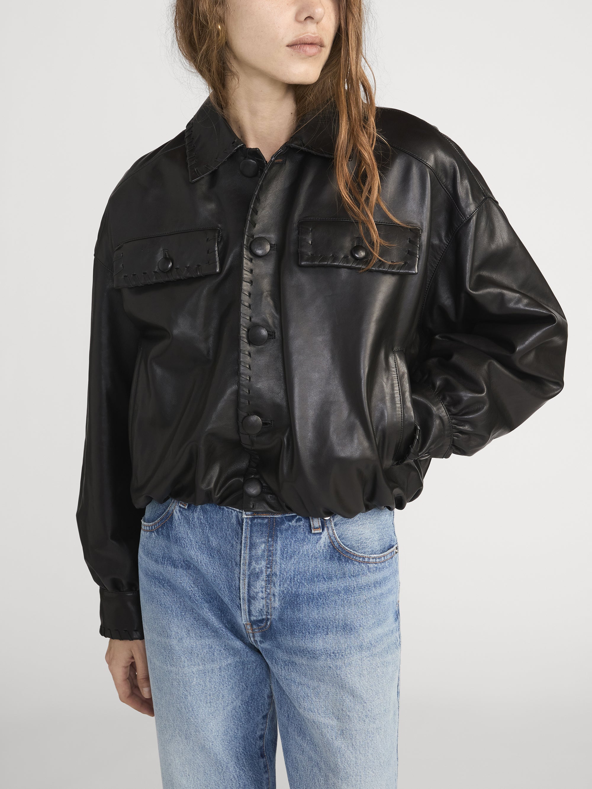 The Leather Bubble Jacket is crafted from 100% lamb leather with a fully lined interior, featuring front pockets, self-covered buttons, and a sculptural bubble hem. Finished with subtle whipstitch detailing at the collar and cuffs, it delivers an oversized silhouette with modern edge.