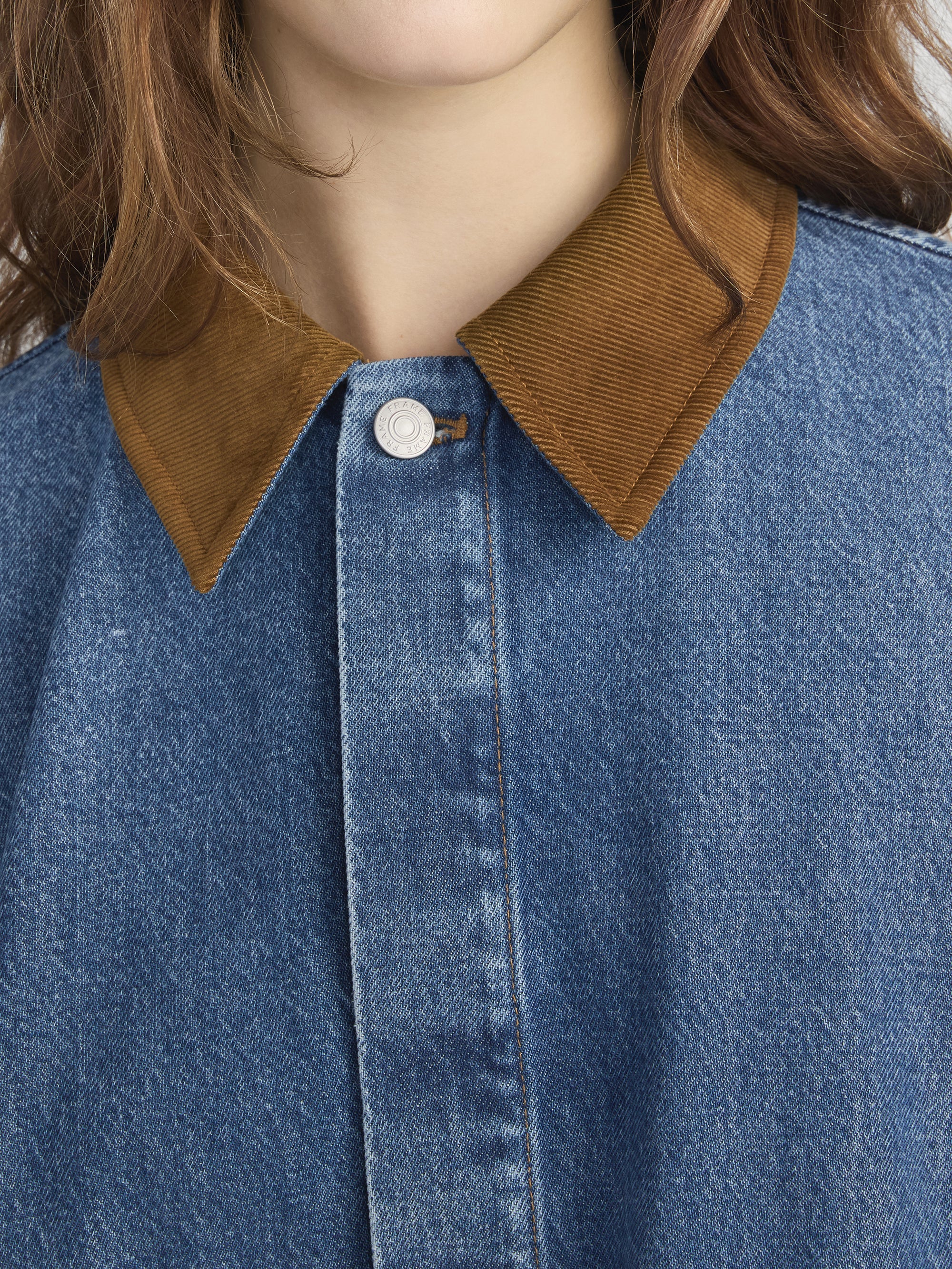 A modern silhouette with a nod to vintage ease. The Swing Jacket is cut in soft denim with a crisp collar, oversized sleeves, and gently flared shape that moves with you. Finished with patch pockets and a rich, indigo wash—designed to layer effortlessly, just like your favorite jeans.