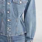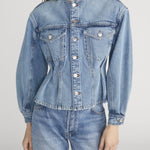 The Nipped Collarless Jacket is crafted from 100% cotton denim, featuring a clean, collarless design with a softly nipped waist and feminine peplum silhouette for a refined take on classic denim outerwear.