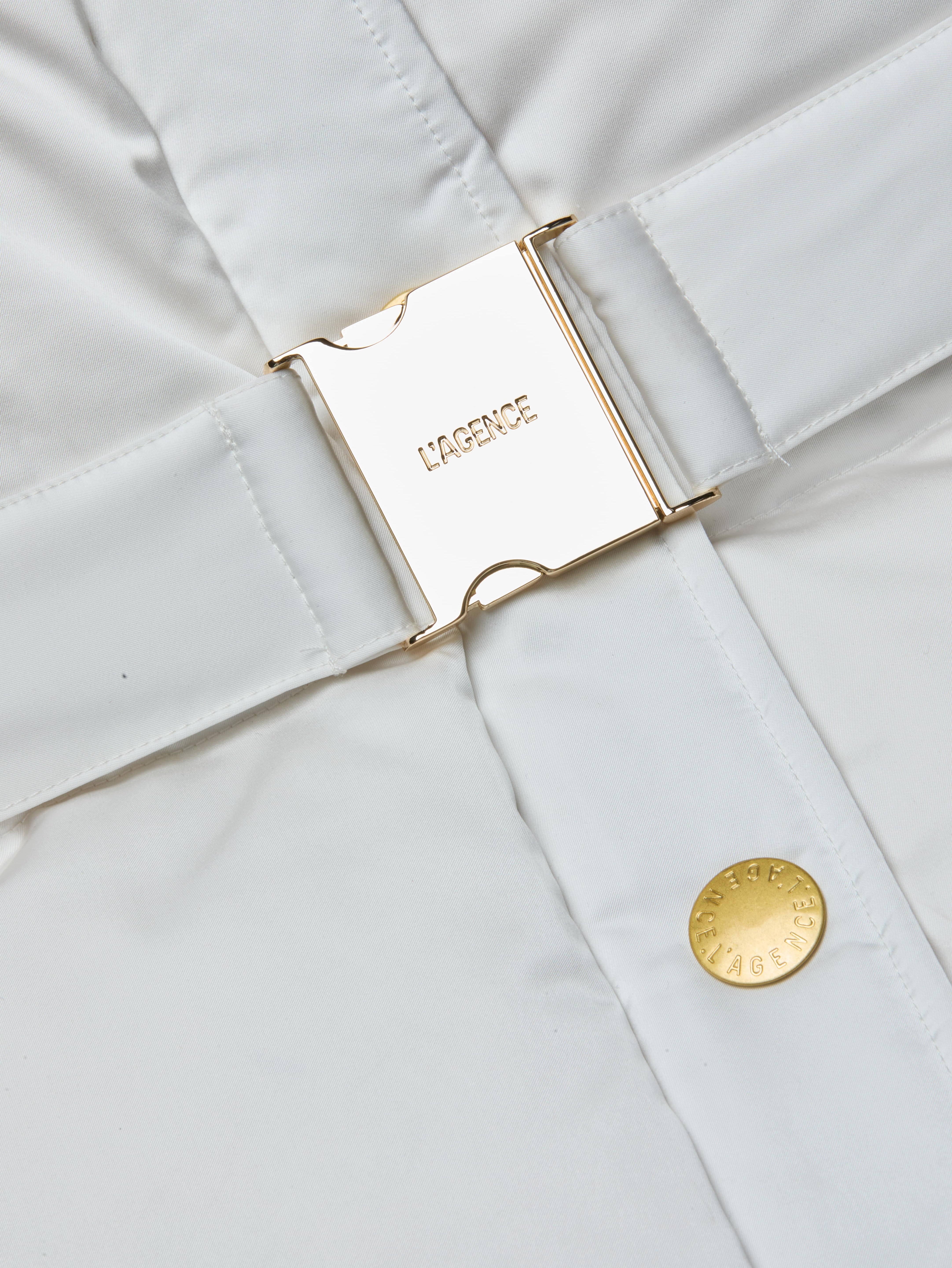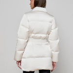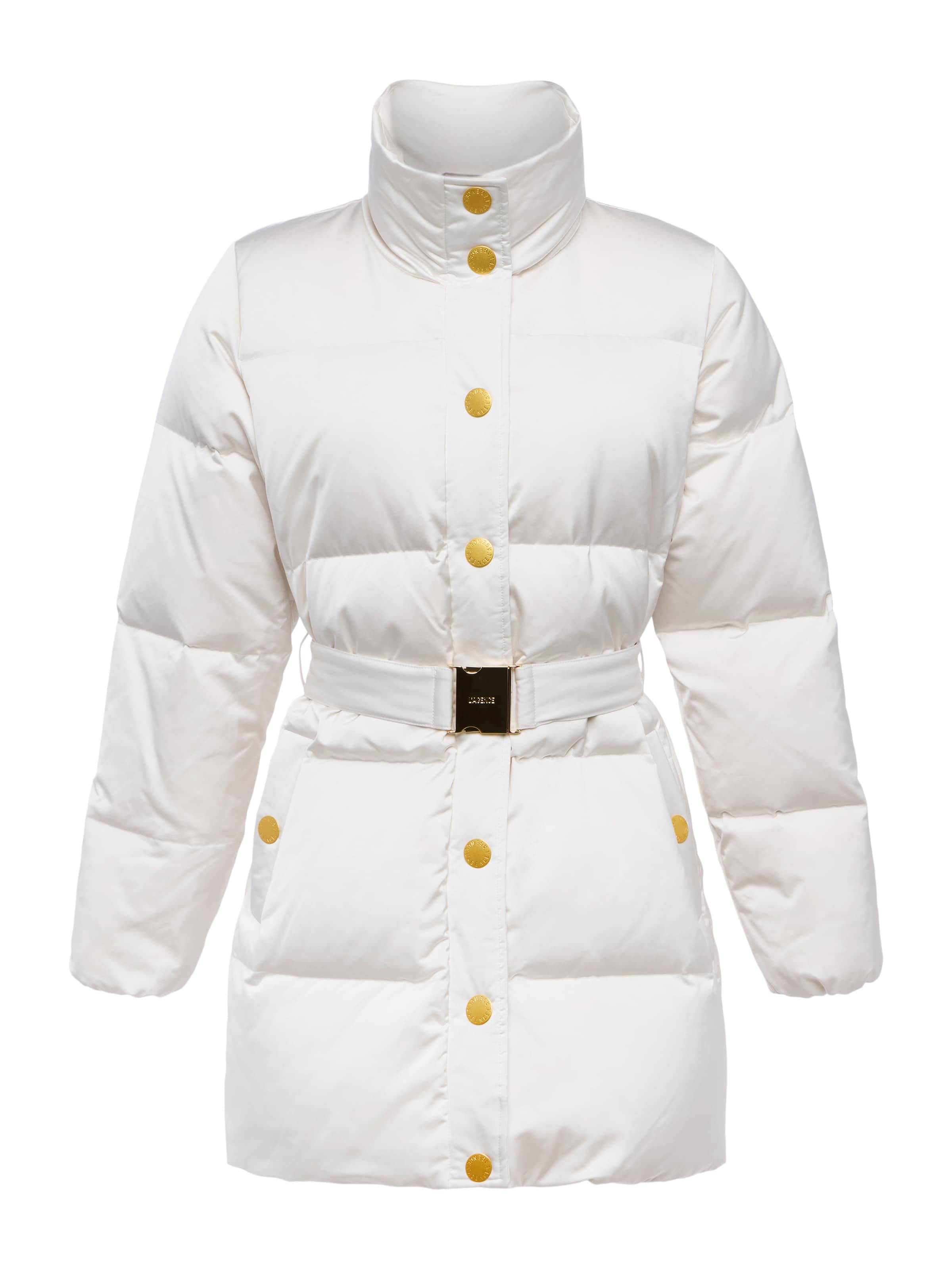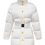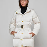The Loretta is a modern puffer with a high-glam twist. In a crisp ivory finish, this standout coat features glossy gold snap buttons and a statement belt with a gleaming buckle to sculpt the silhouette. A high funnel collar keeps warmth in. Cold weather never looked so clean, chic, and cool.