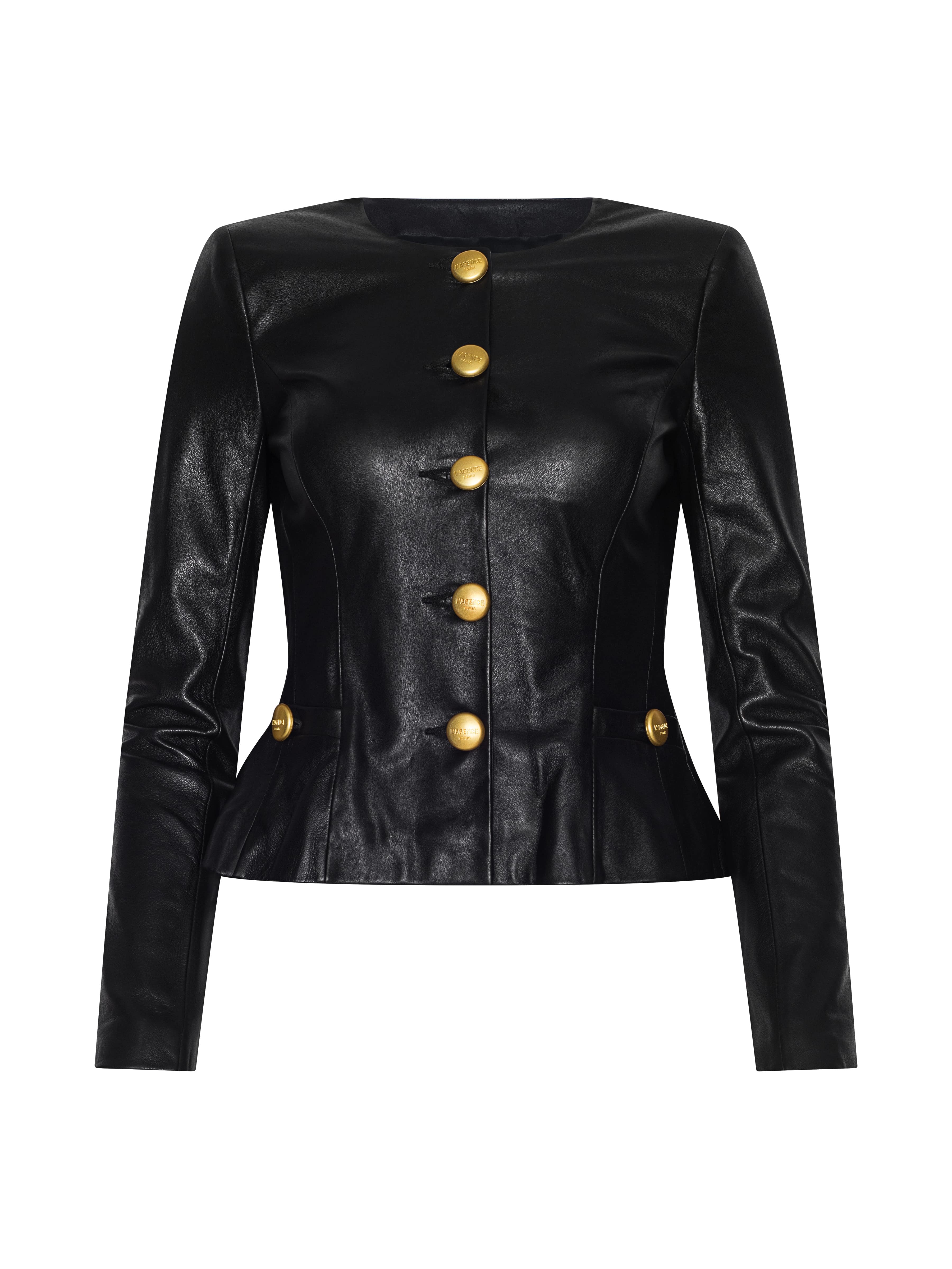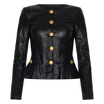 A cool, collarless leather jacket cut close to the figure with a flattering peplum. A timeless wardrobe essential that functions equally well as a top or layer.