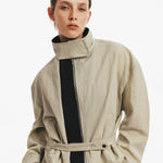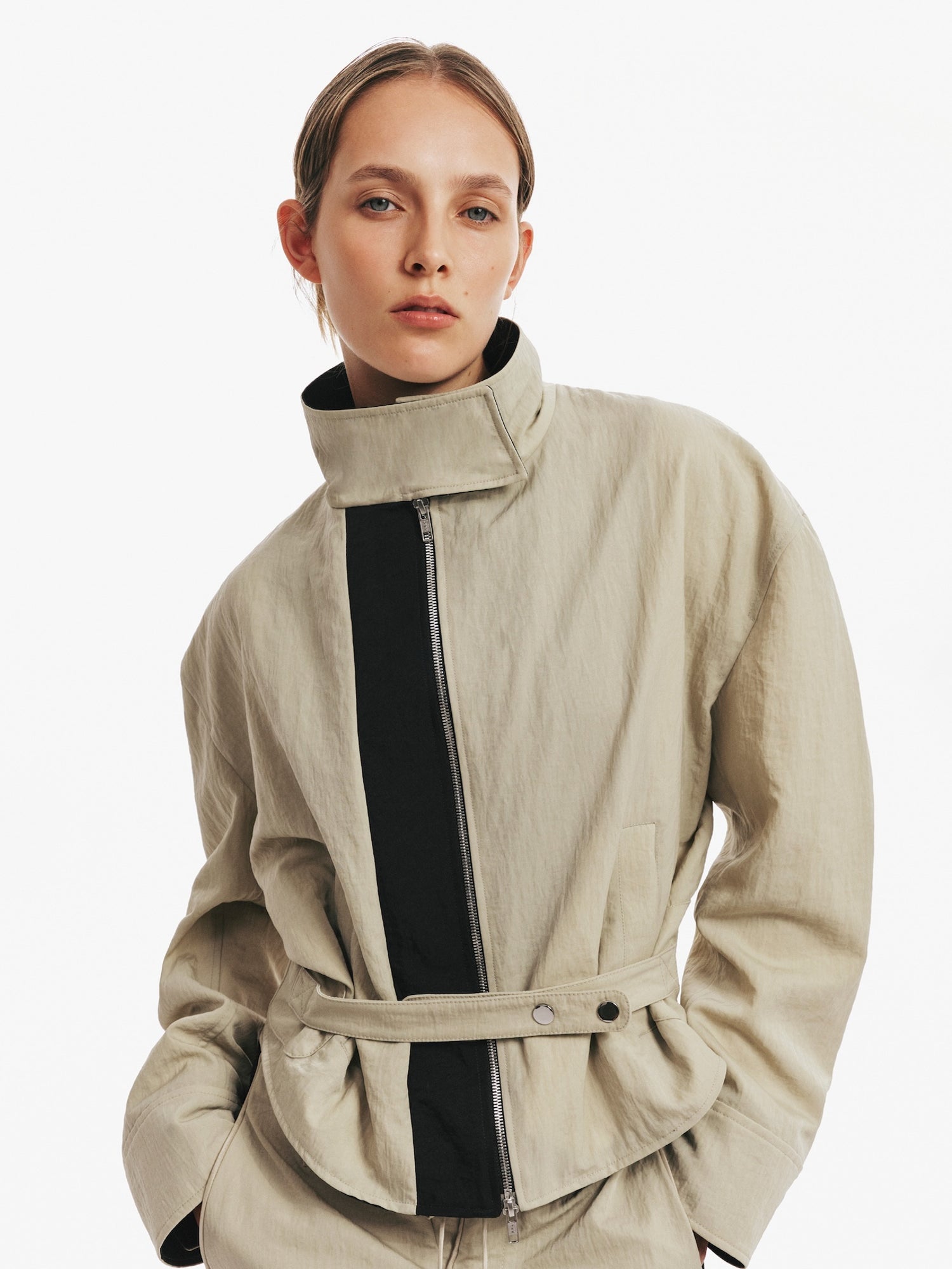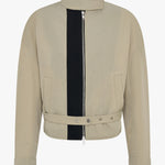 Crafted from a structured viscose, the Marley Jacket jacket features a high funnel neckline and zip-through front. A contrast underlay detail runs through the centre, while a snap-fastened belt cinches the waist for definition. Exaggerated sleeves and a curved back yoke create volume and directional shape, balanced by a cropped hemline.