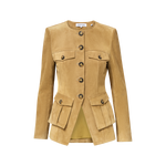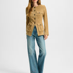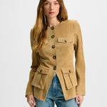 Sleek and polished, Orrin is a slim-fitting, elongated jacket with a utilitarian edge. Crafted from butter-soft Italian calfskin, it features a collarless crew neckline, front flap pockets, and an angled cutaway hem for a lengthening effect. Style it closed as a top, or layer open over cotton tanks and lightweight knits.