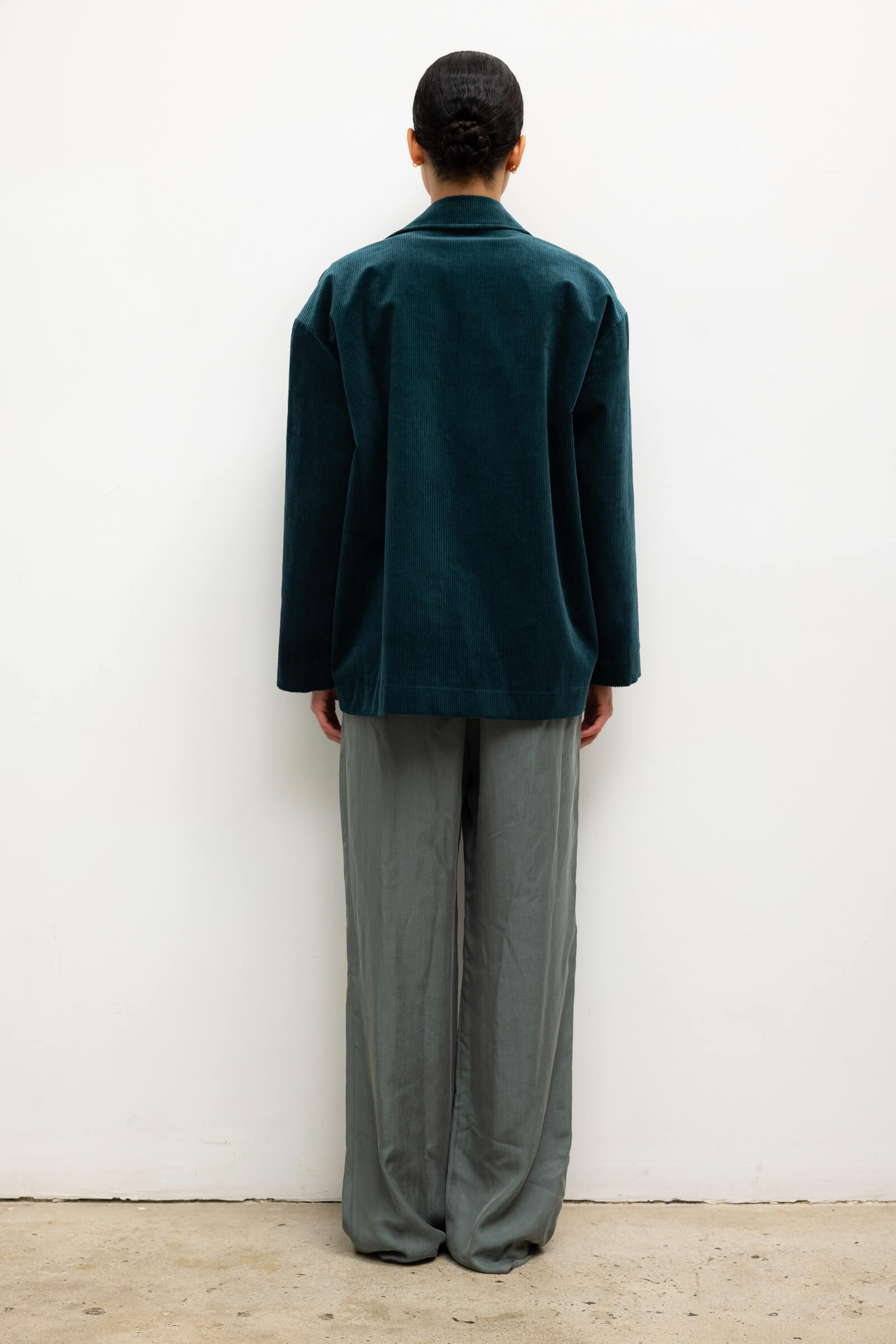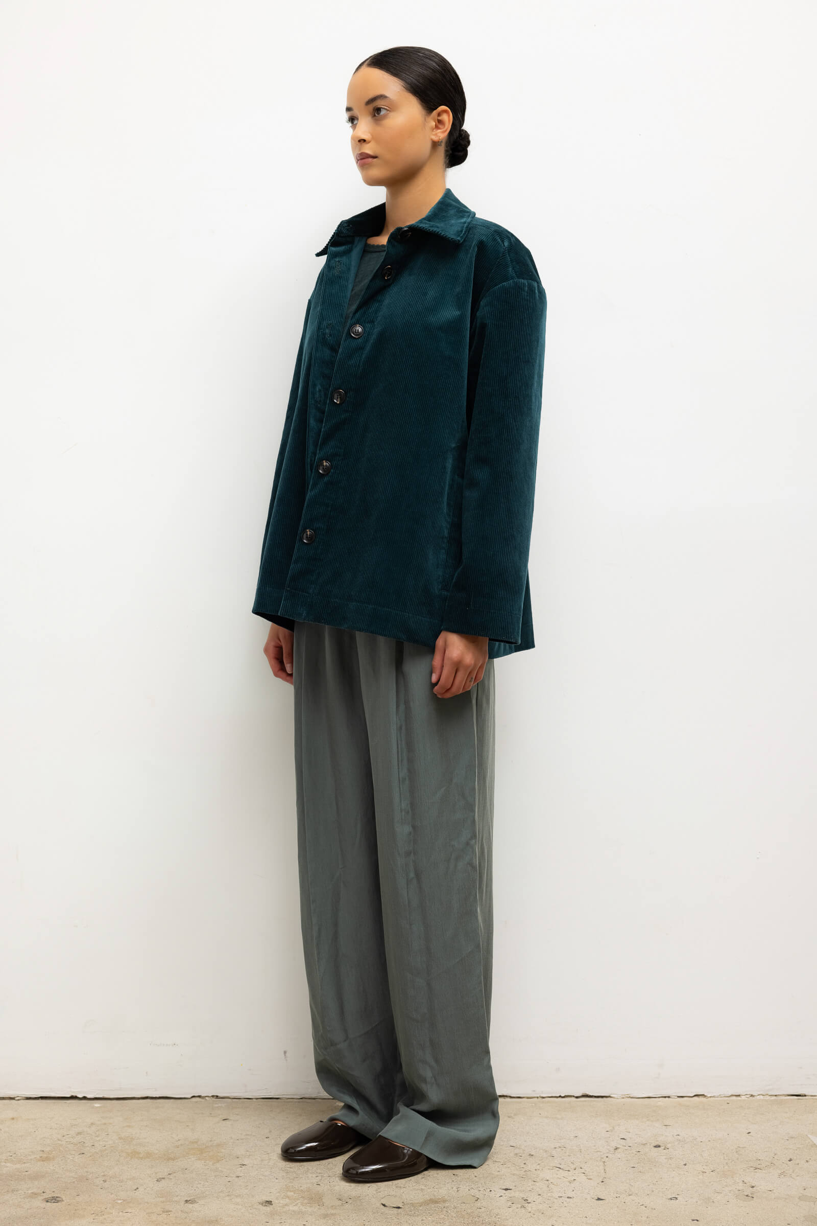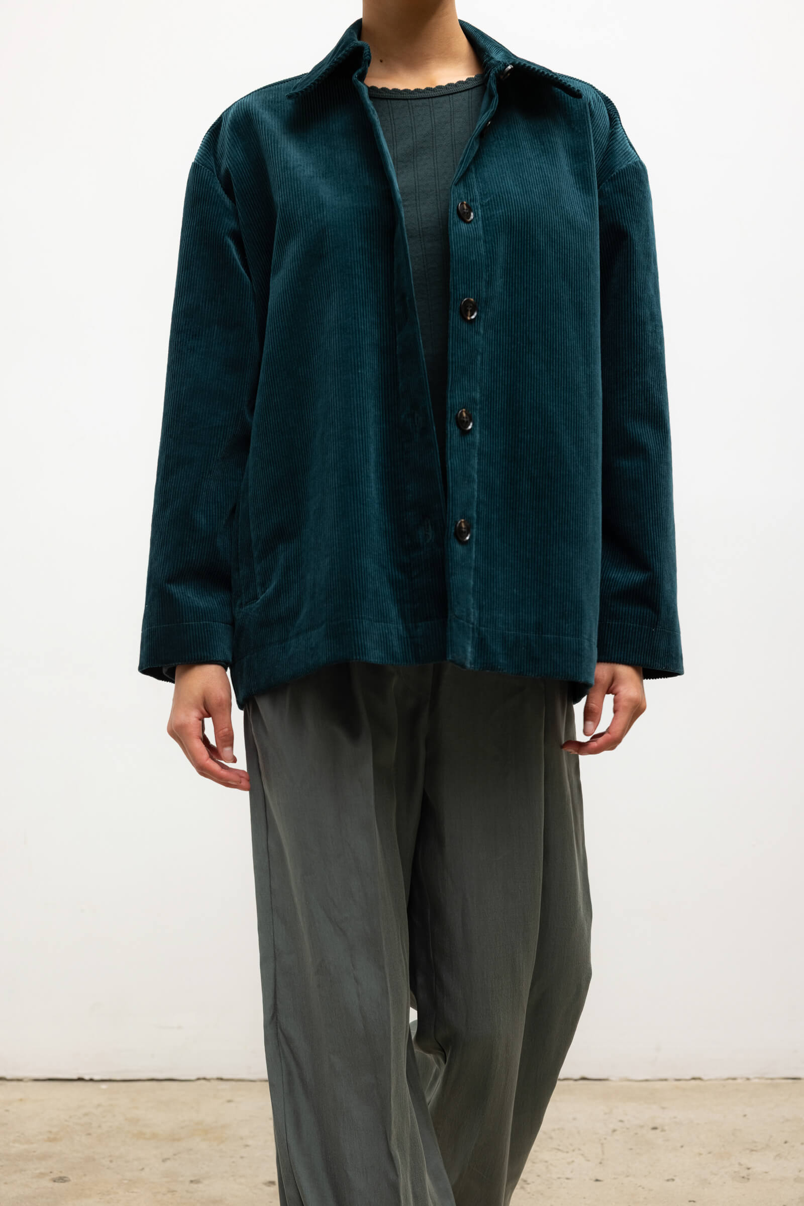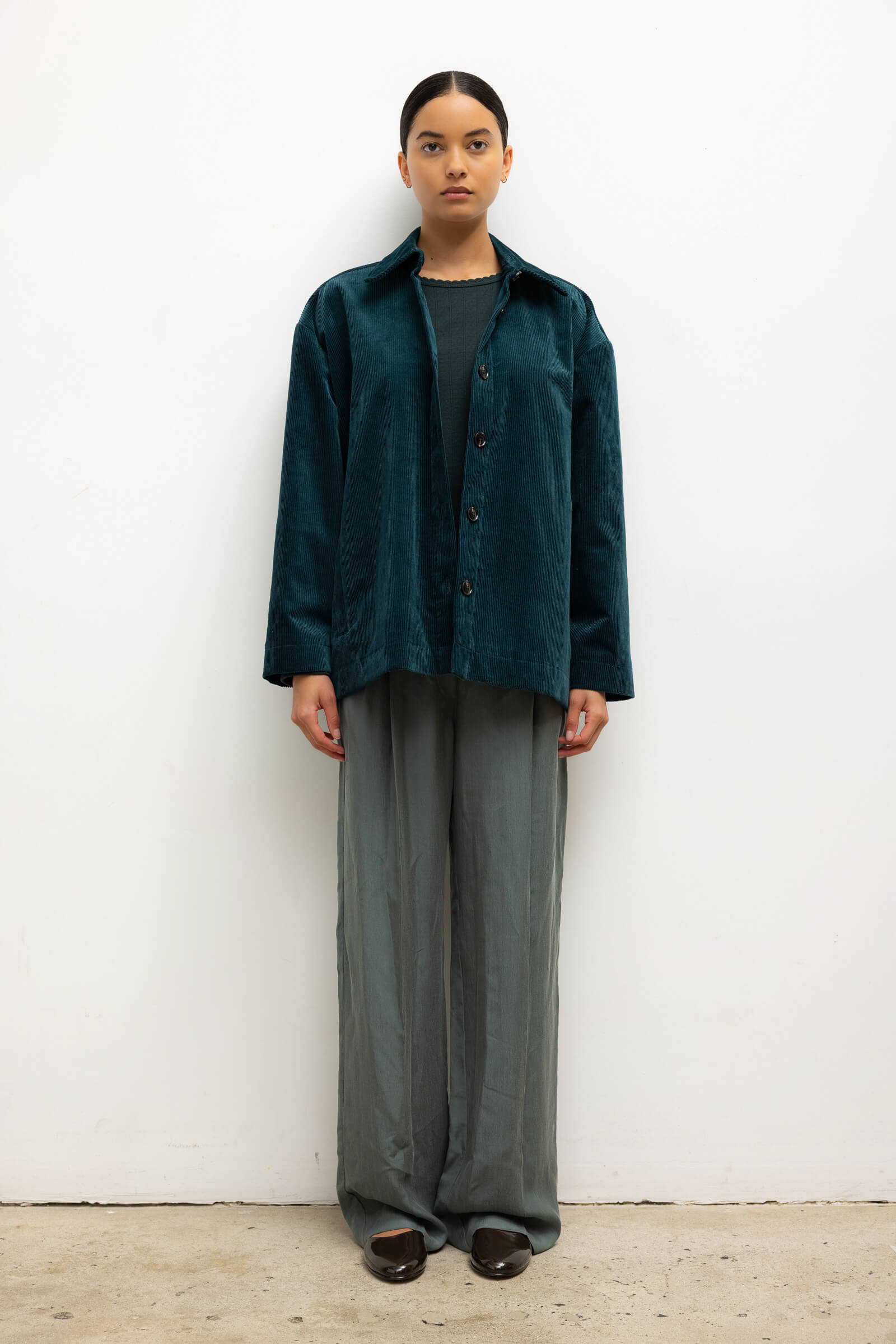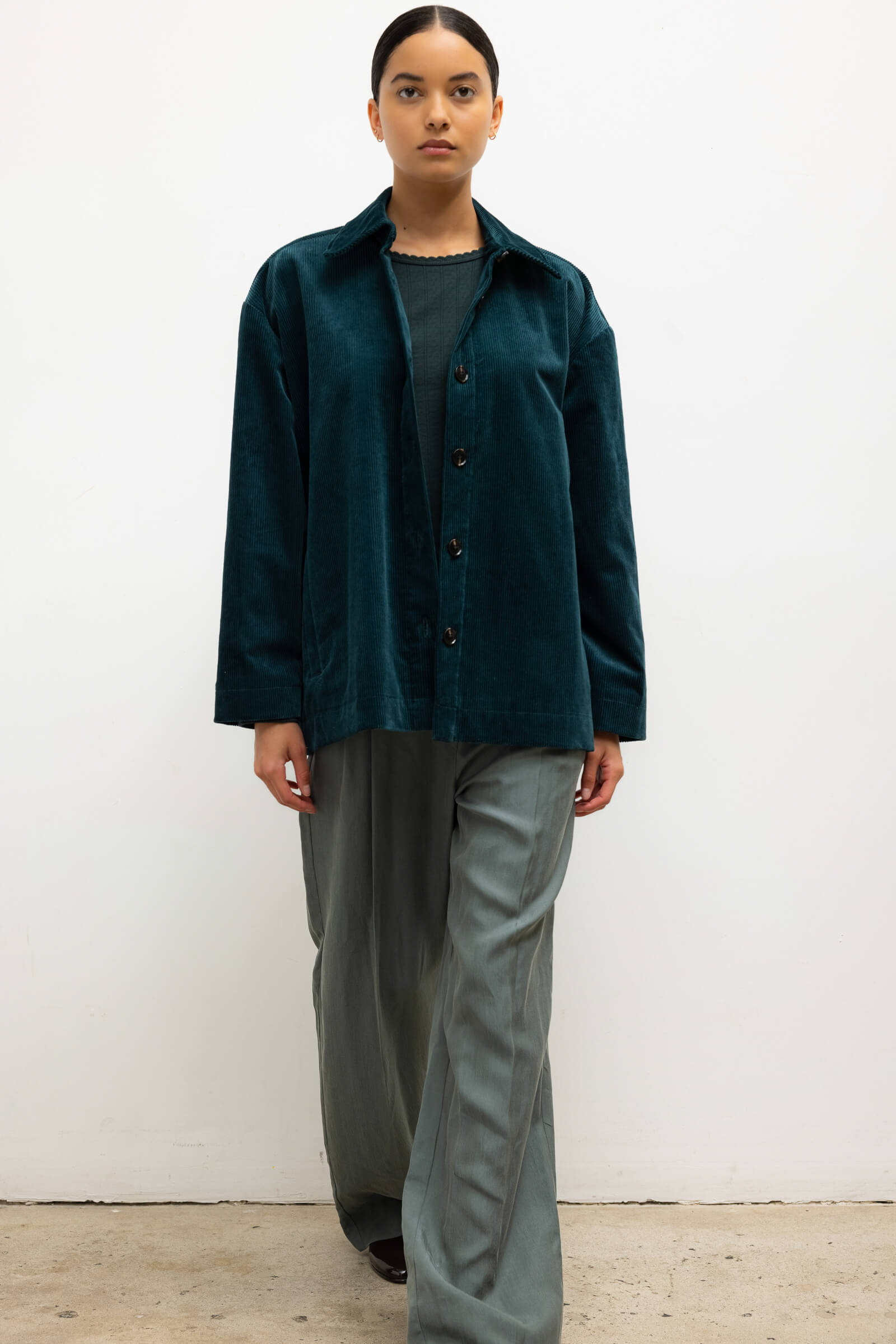 Cut in our ridged stretch Sam Corduroy, The Sam Jacket is a borrowed-from-the-boys silhouette featuring a pointed collar, full length sleeves, and button front closure. We’re wearing this as a matching set with The Sam Straight Leg Pant and layered over tonal knits.