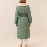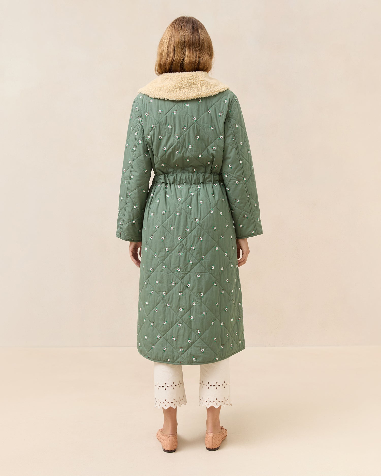 Coat in sage nylon with floral embroidery and a natural-colored fleece collar.