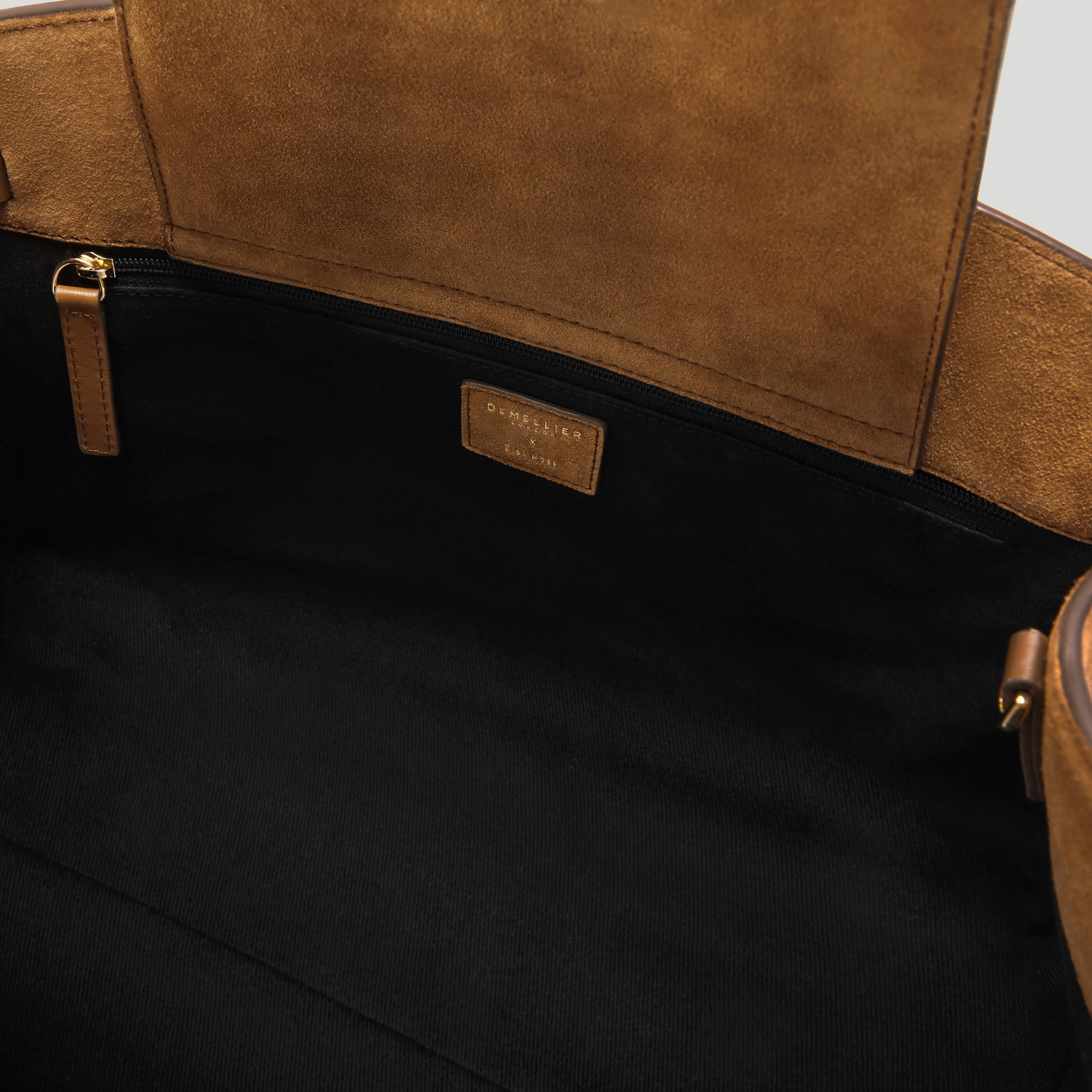 Interior: Main compartment with magnetic closure flap, zip pocket, slip pocket, cotton lining, internal Elsa Hosk signature gold foil stamp.