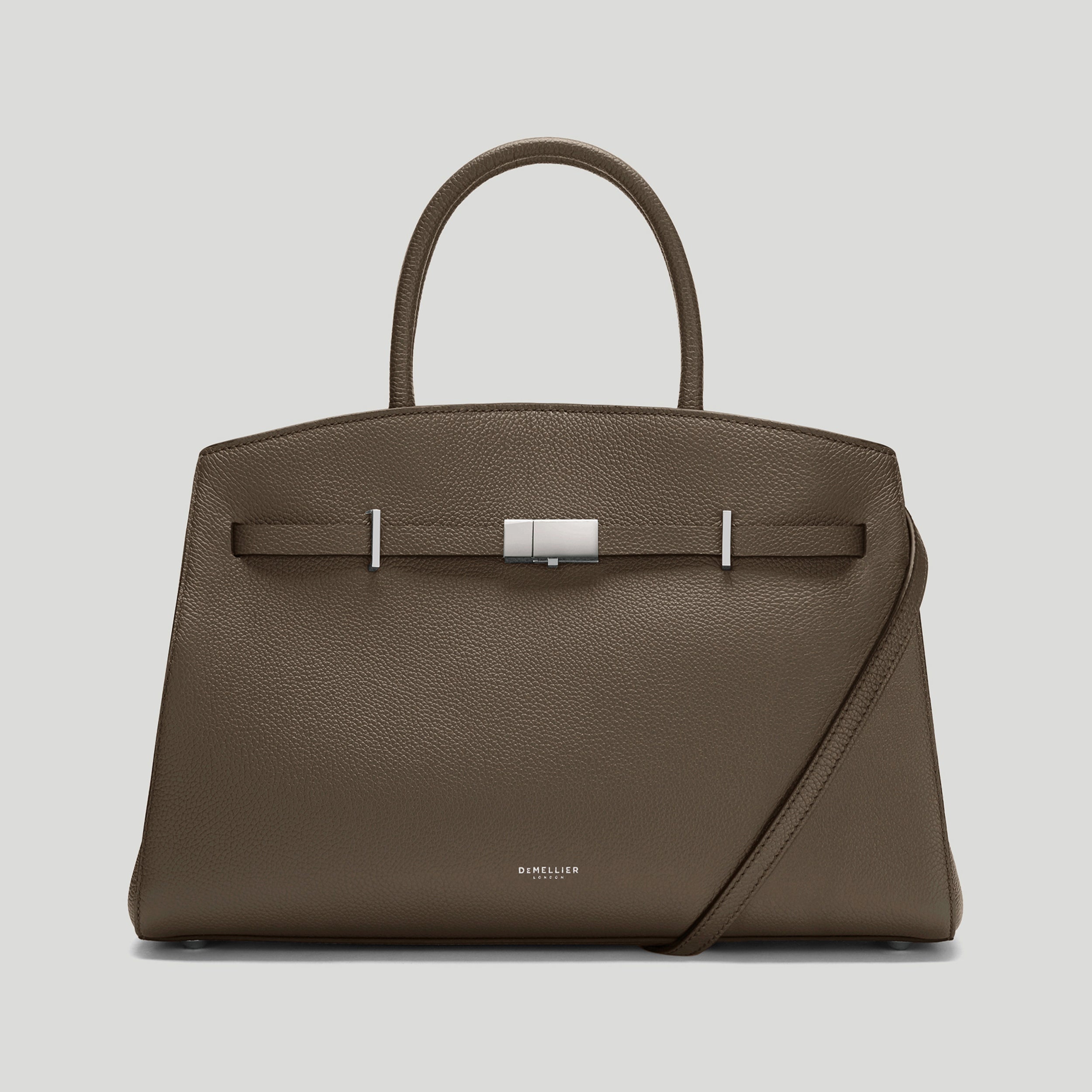 Exterior: External slip pocket, top handle (to be held by hand or on the crook of the arm), detachable adjustable strap, bespoke D-rings, DeMellier Mini Sam Browns, Hudson adjustable belt, silver-plated Hudson bridges and lock, foil embossed DeMellier logo, base feet.