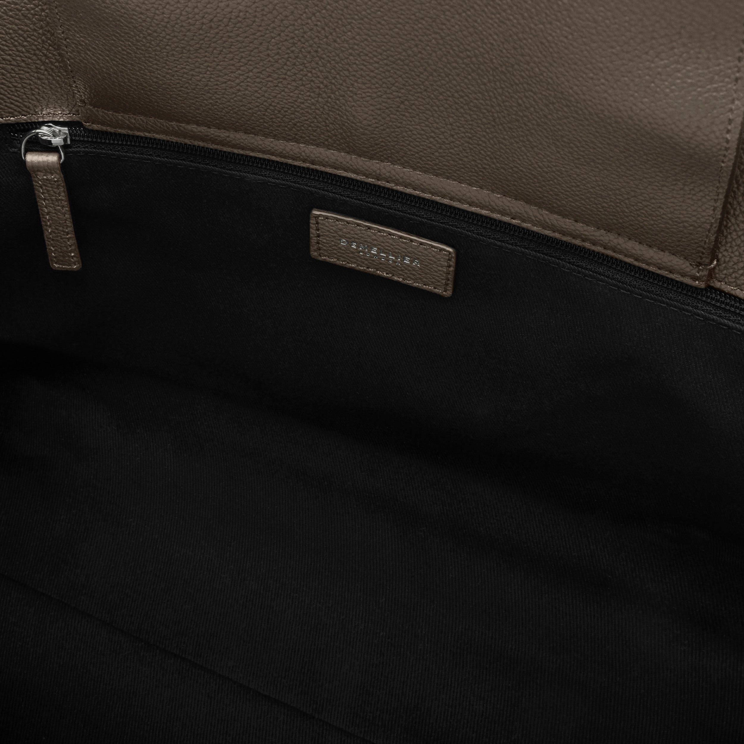 Interior: Main compartment with magnetic closure flap, zip pocket, slip pocket, cotton lining, DeMellier foil logo.