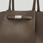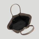 Exterior: Double top handles, metal feet, unique triangular fold design, foil embossed DeMellier logo.