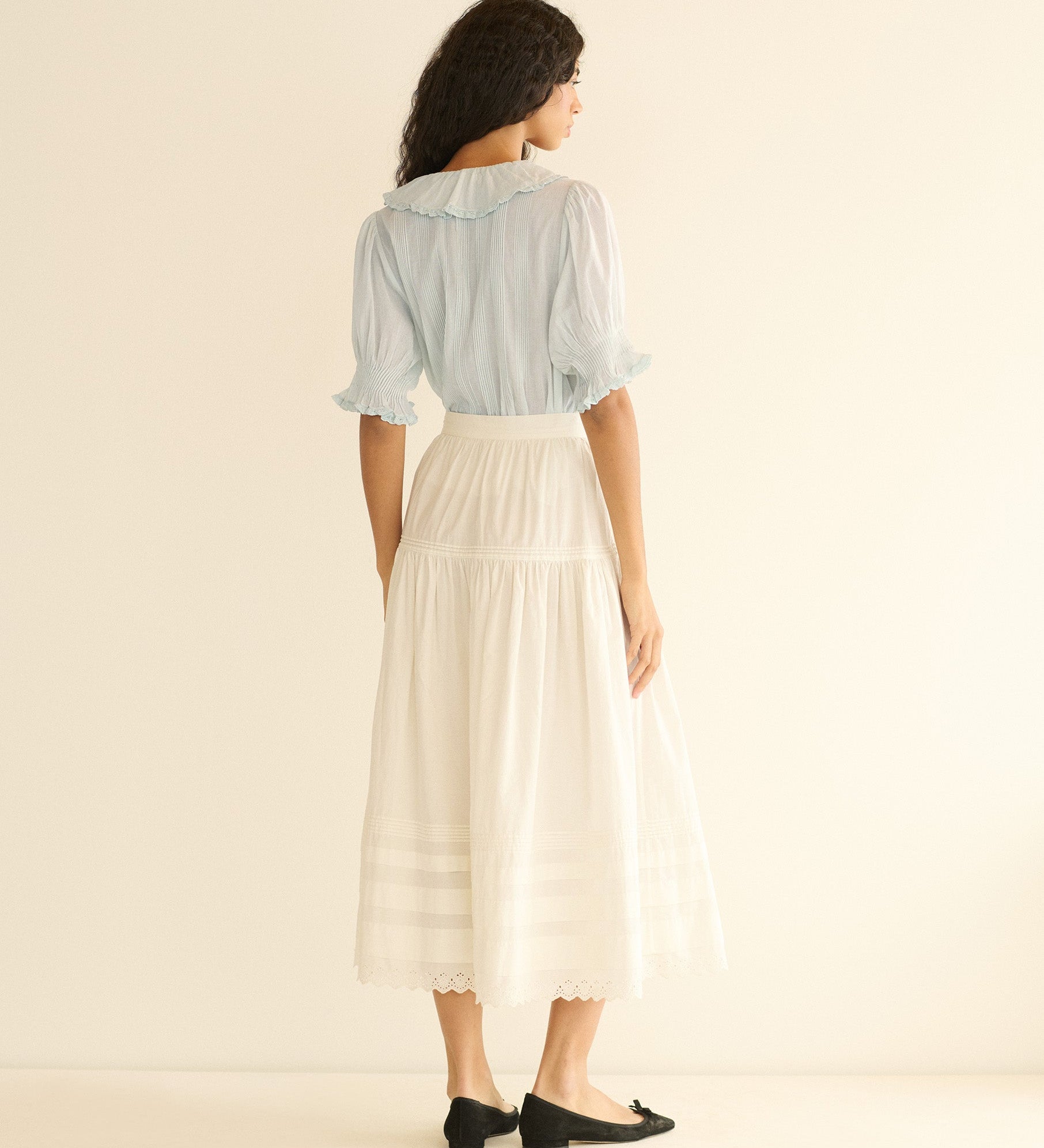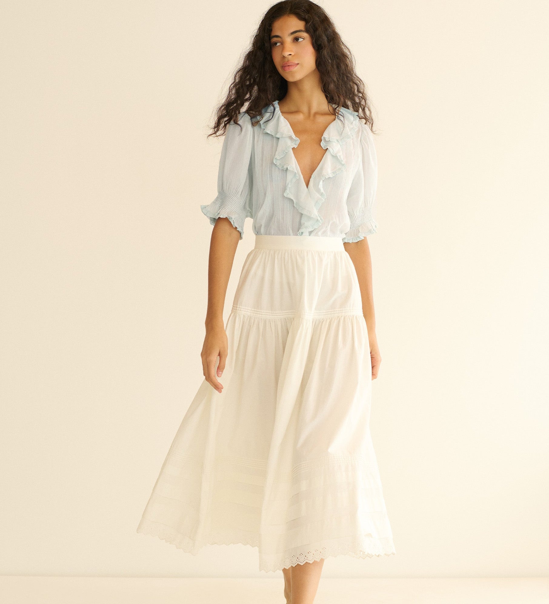 Wearing DÔEN isn’t just about dressing, it’s about inhabiting a feeling. Like waking up in a sunlit room you forgot you loved. The shirred blouses, the gauzy skirts, the prints that feel like stories from your grandmother’s photo album. Everything speaks in a quiet, golden tone.