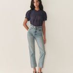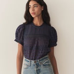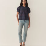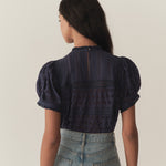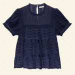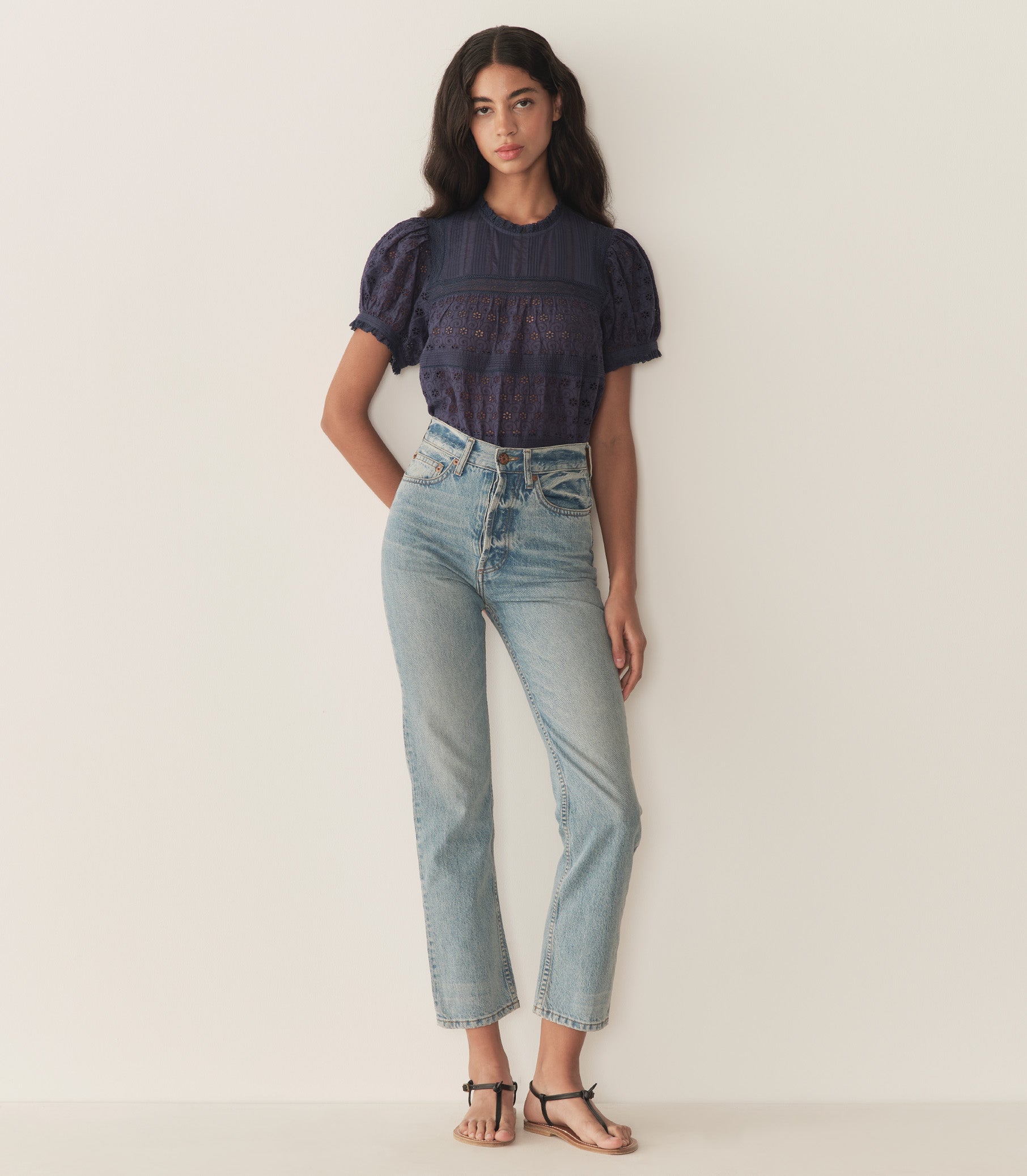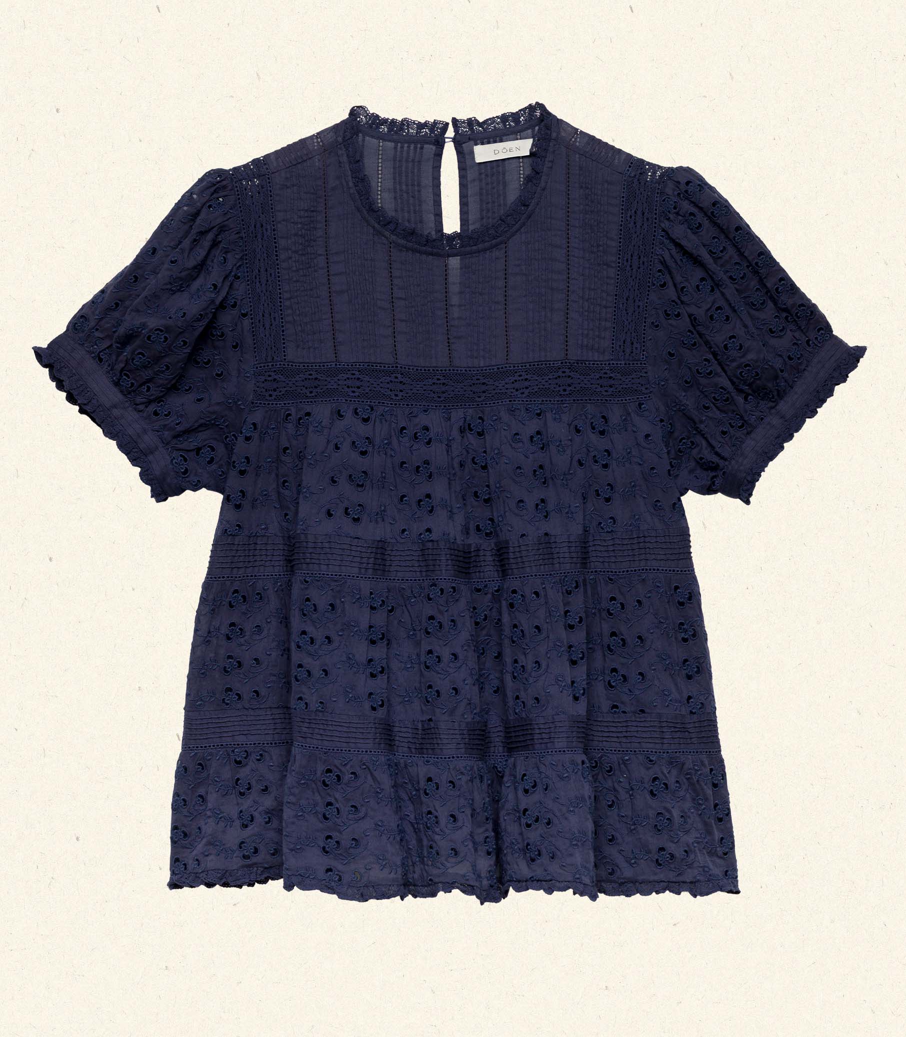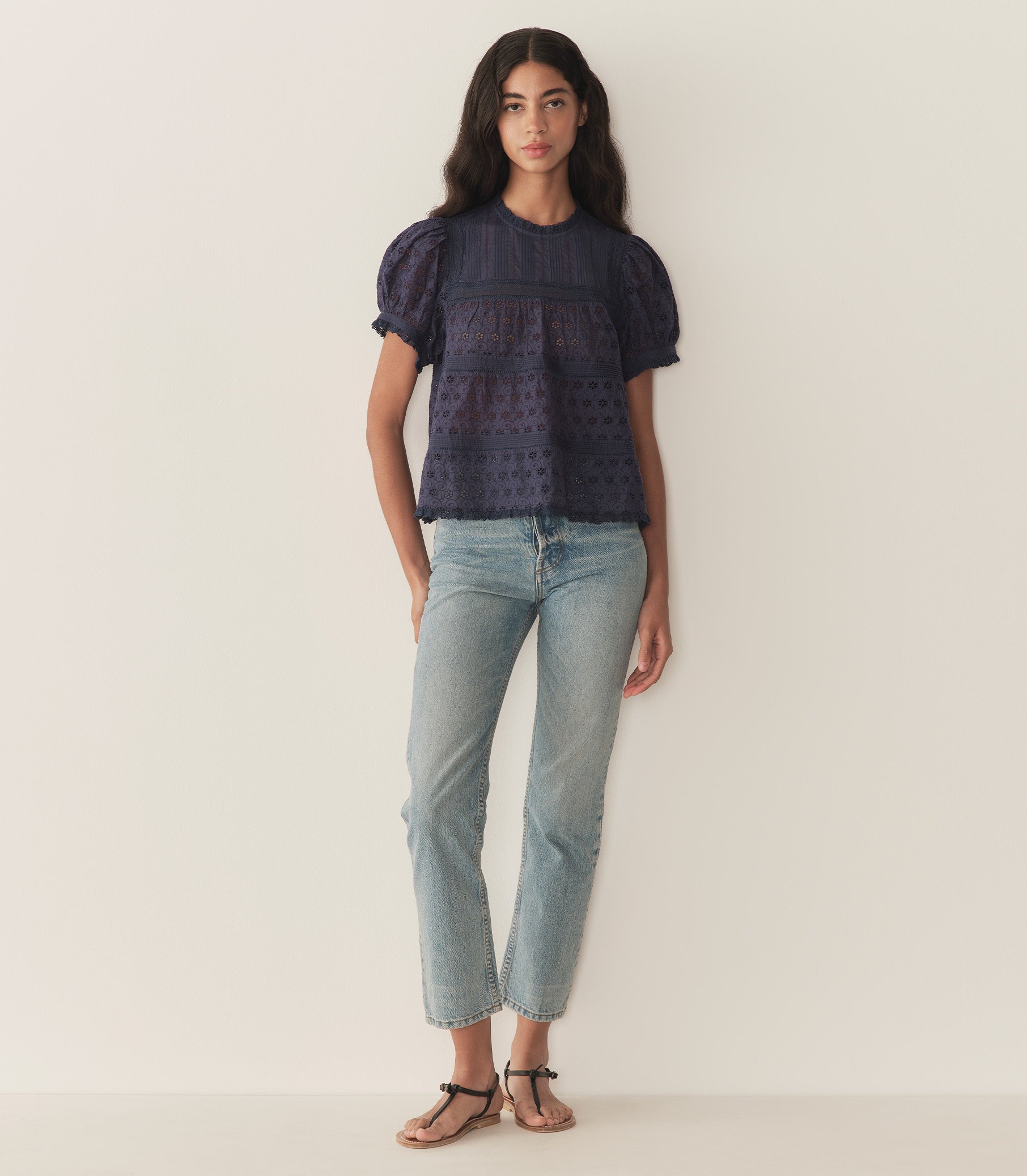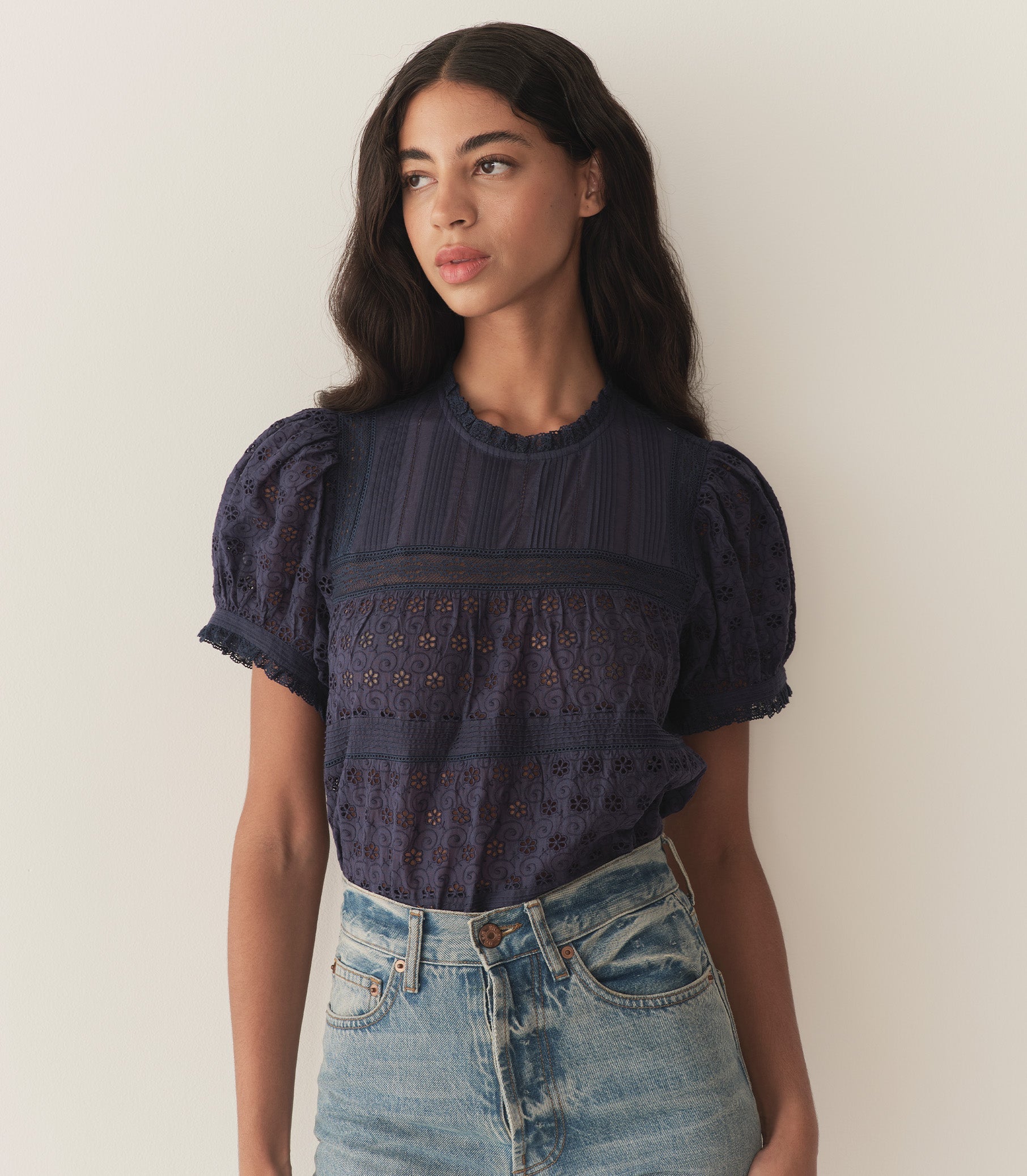 In lightweight organic cotton voile, the Adeline draws inspiration from our Adnet Top, which made its debut in Spring 2021. The breezy silhouette is adorned with allover eyelet embroidery and delicate pintucks at the yoke, while scallop edge lace trims the neckline, short puffed sleeve cuffs, and hem. A single petite button fastens at the back neck.