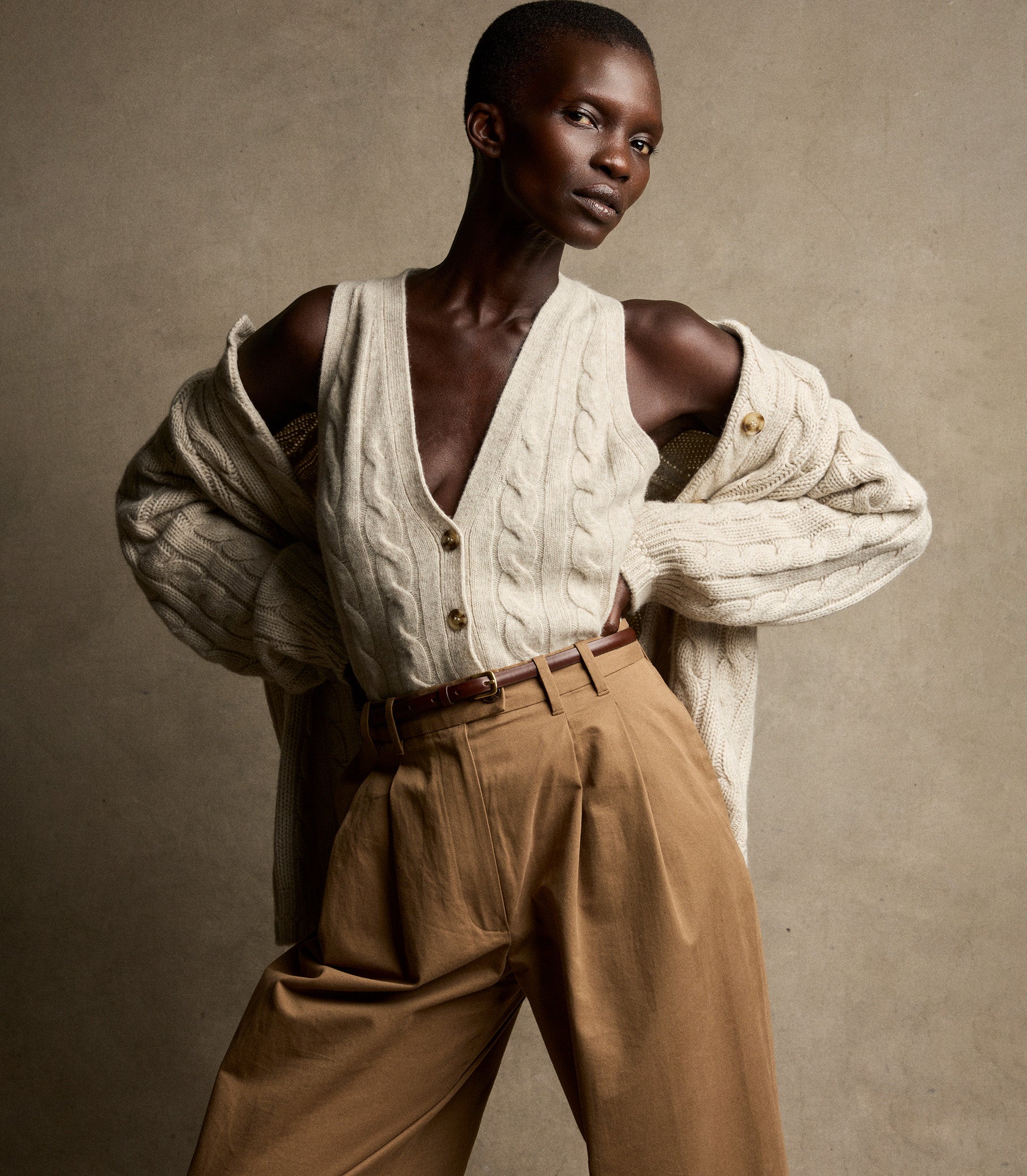 Crafted from cloud-soft 100% cashmere, the Alberta Vest features an allover cable design, plunging V-neckline, and faux horn buttons. The ribbed hemline hits at the true waist, pairing perfectly with trousers or denim. Made with responsibly sourced, traceable cashmere following strict animal welfare, environmental, and social guidelines. Learn more about our commitment to traceability in our 2024 Impact Update.