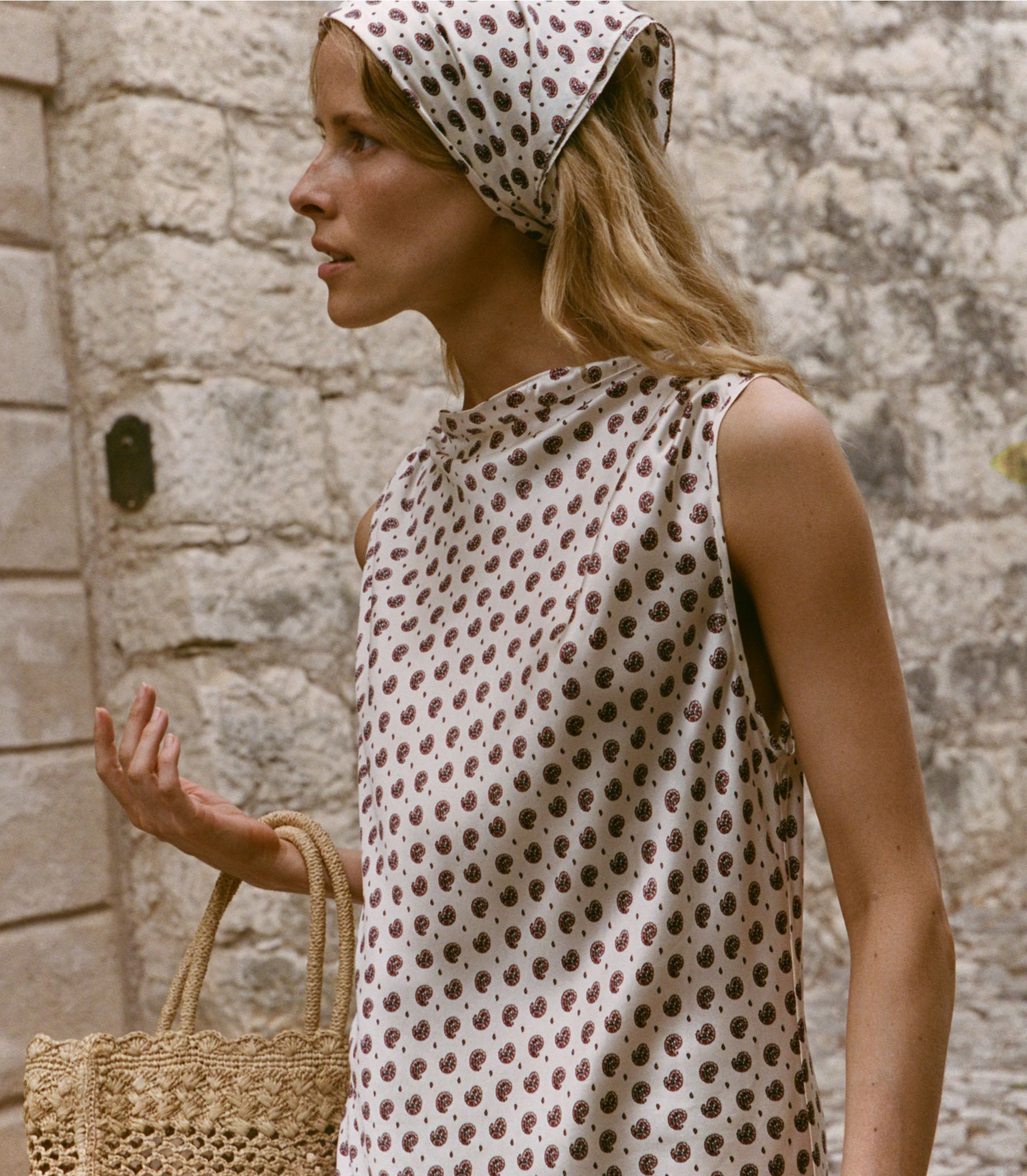 Crafted in buttery silk satin graced with our ‘60s-inspired Françoise Foulard print, the Alfreda Dress is a bias-cut mini with an easy, sleeveless silhouette and a soft cowl neckline. A single button with a keyhole detail fastens at the back of the neck.