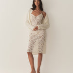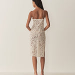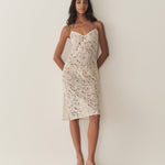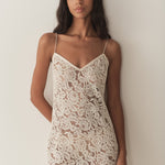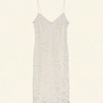 In an intricate allover lace, the Alissa Dress is a ‘90s-inspired slip dress, featuring corded satin piping at the neckline and hem and a side slit.