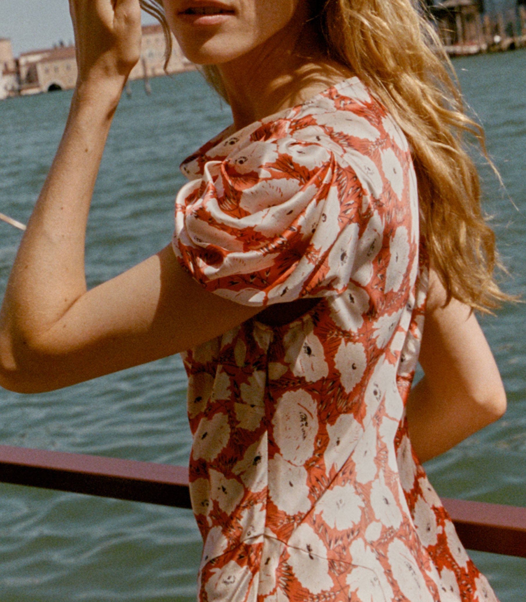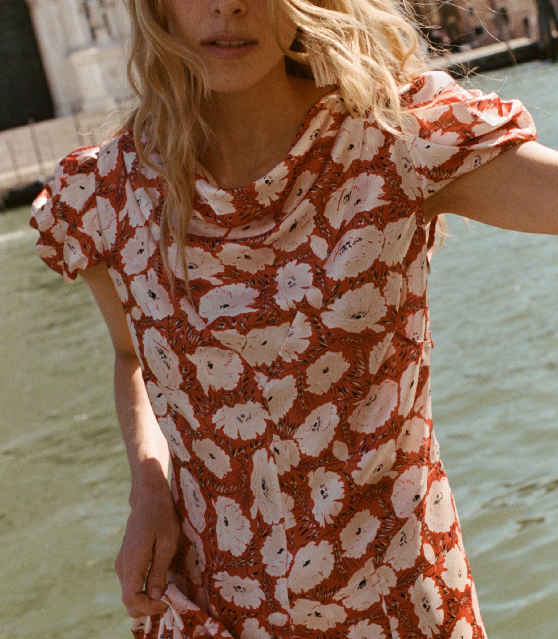 A favorite of our co-founder, Katherine, the ‘30s-inspired Alna Dress is crafted from buttery silk satin and graced with our Fleurs d’Anemone print. It features a cowl neckline, short sleeves with draped volume, and a midi-length skirt. An invisible side zipper offers a fitted bodice, while a delicate button closure fastens at the back neck.