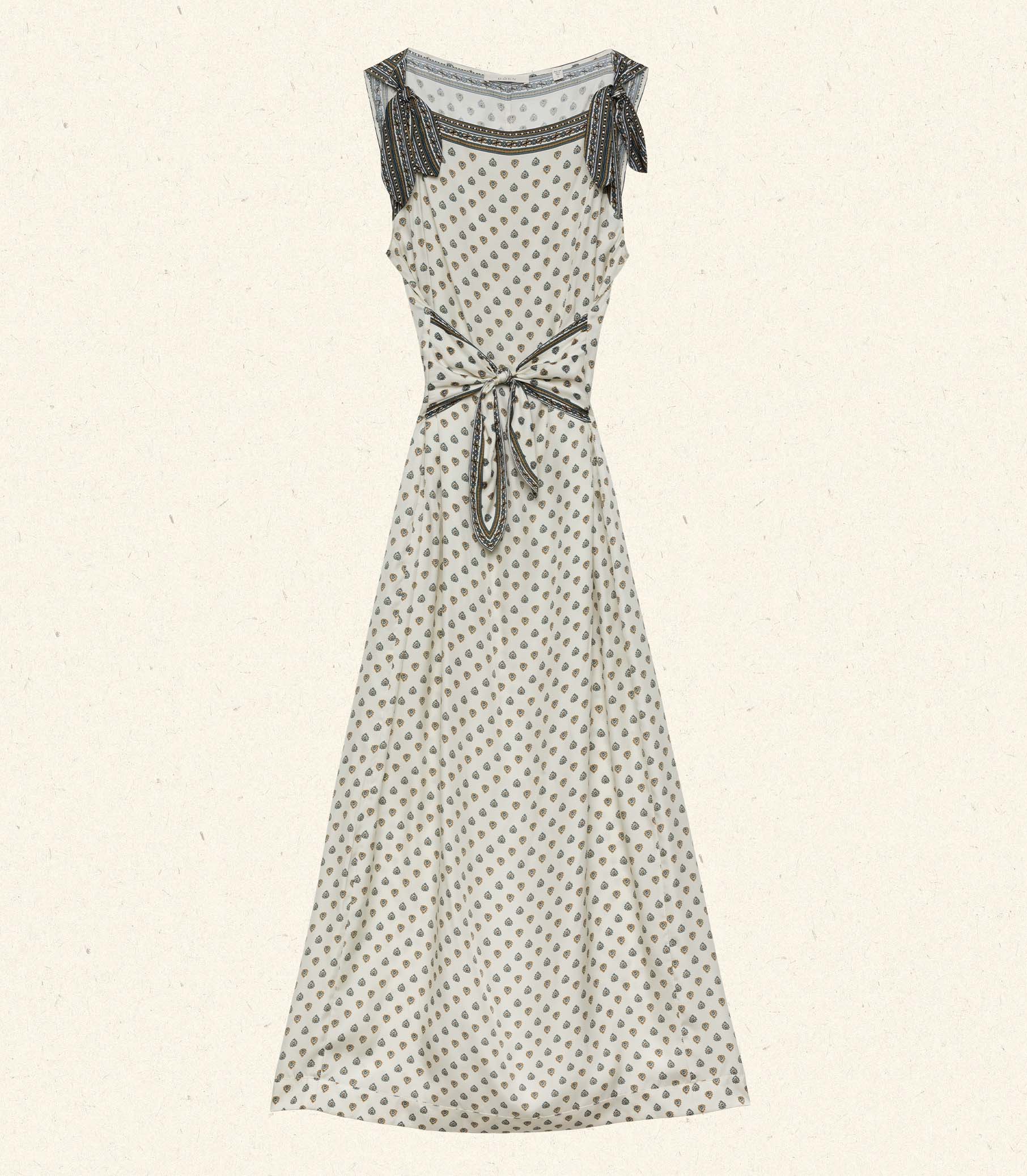 Crafted from a buttery silk-viscose twill, the Amorette is a sleeveless column dress with a bateau neckline, functional waist and shoulder ties, and a center back slit at the hem for ease of movement. Inspired by a vintage silk scarf from our styling team’s personal collection, our Riviera Foulard print features placed borders at the neckline and sleeve openings.