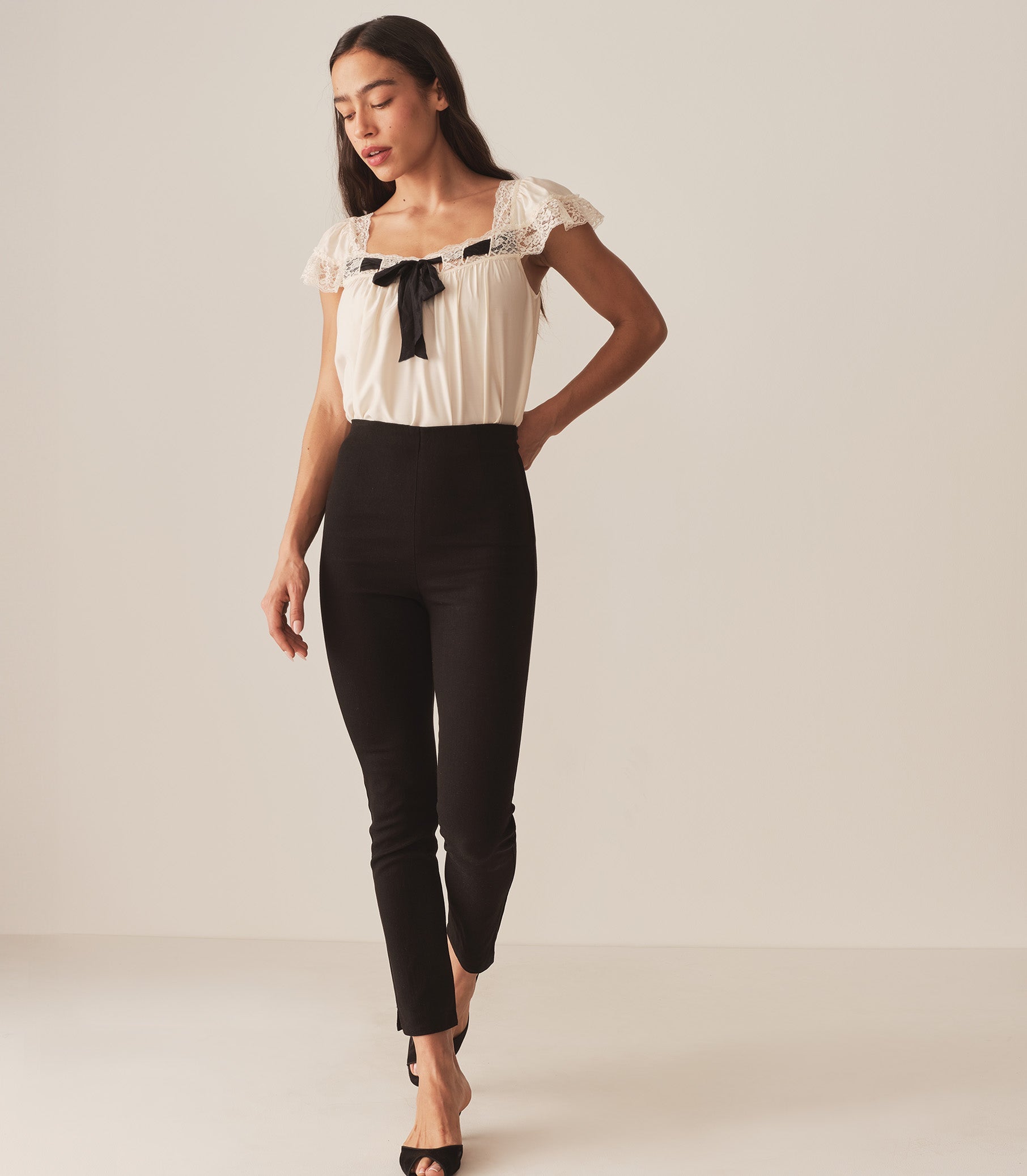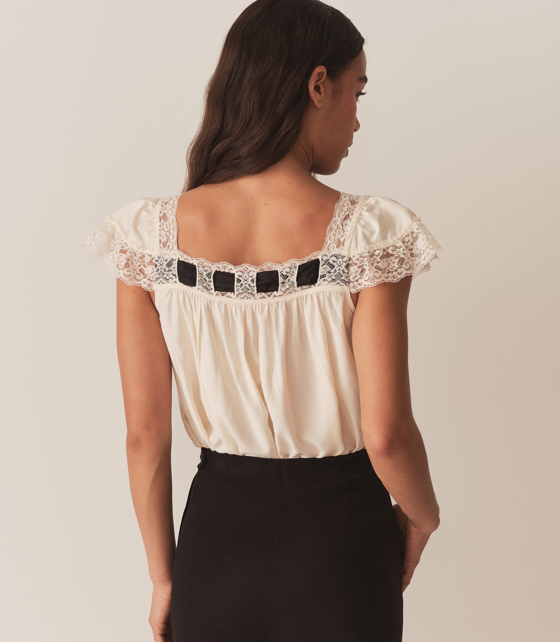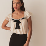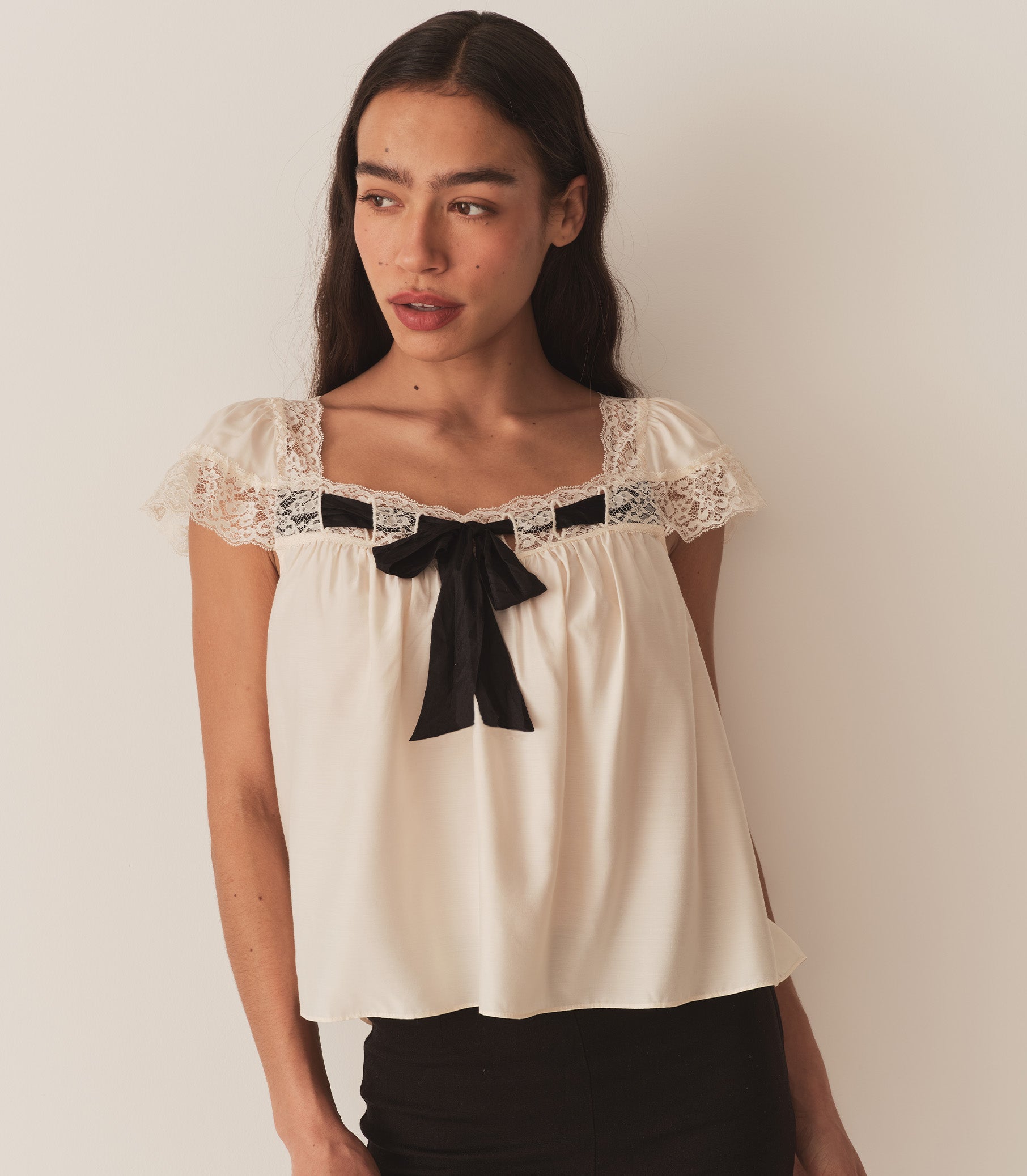 Crafted from a lightweight silk-viscose blend, the boudoir-inspired Anaya Top features a breezy silhouette, delicate flutter sleeves, and a soft V-neckline trimmed with intricate lace and threaded with a contrast silk ribbon.