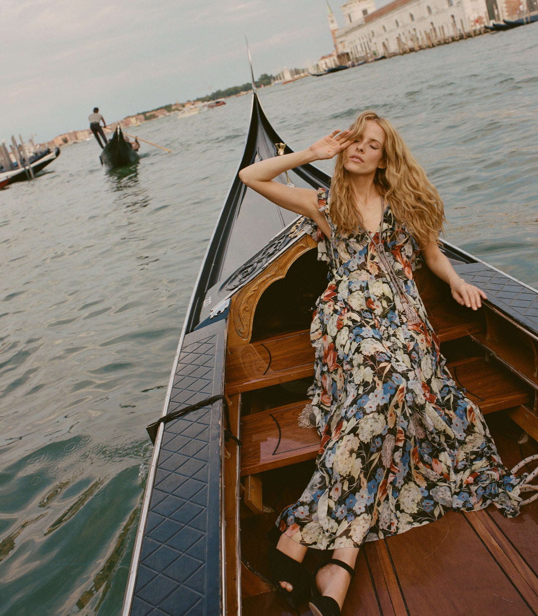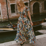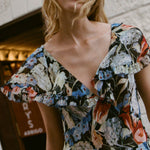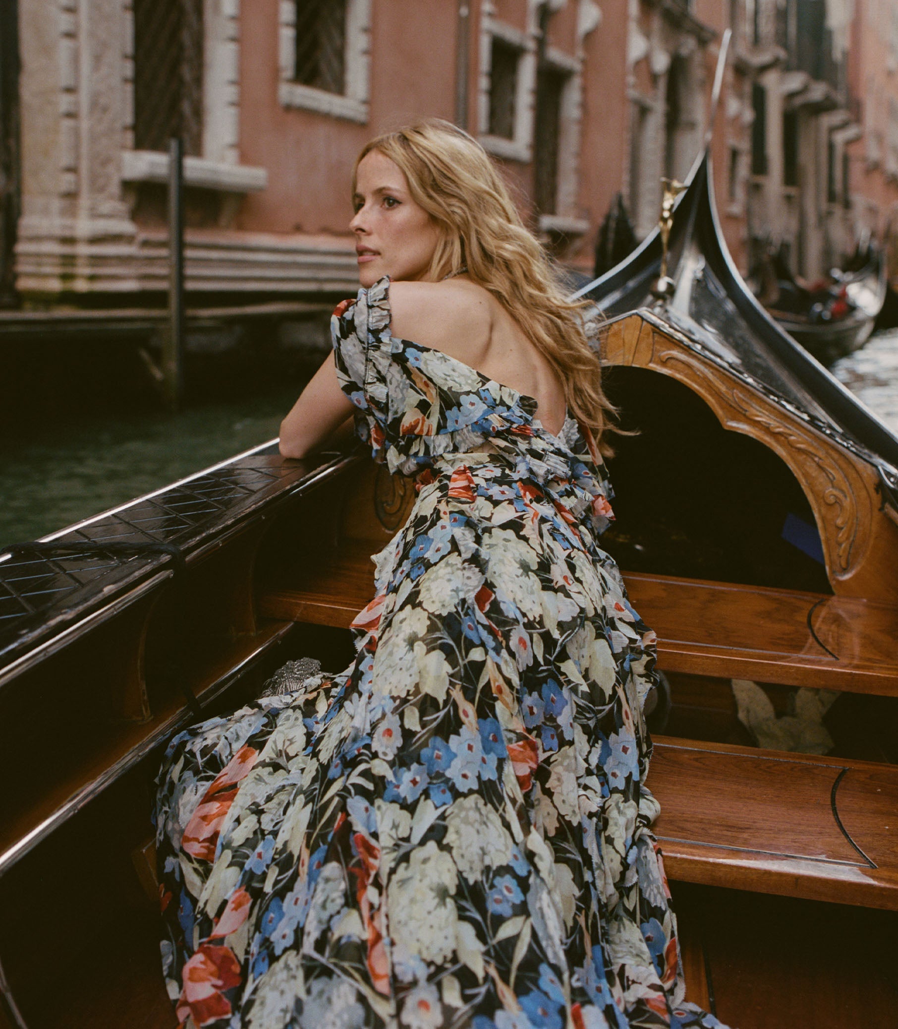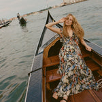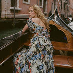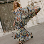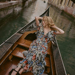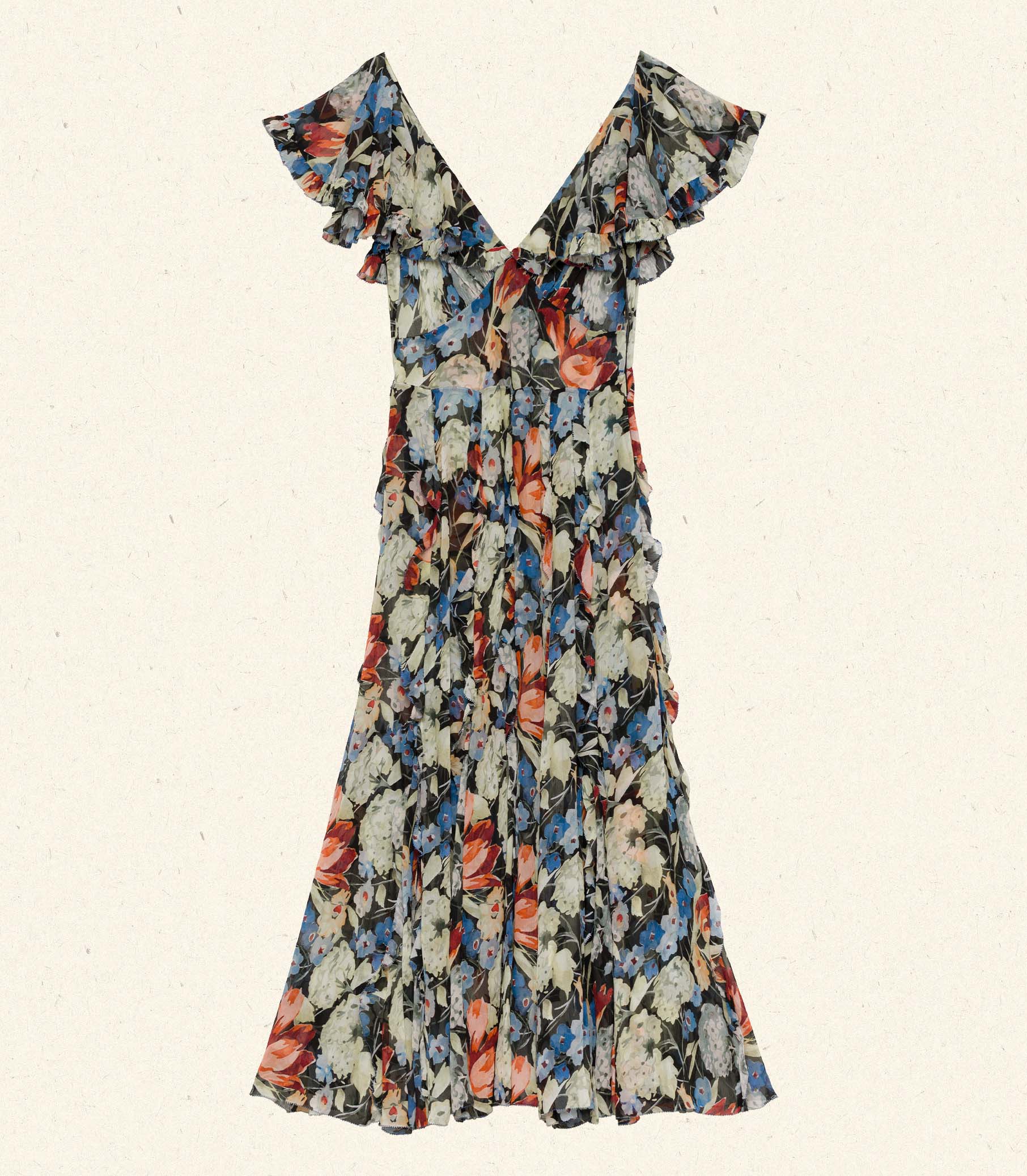 A favorite of our co-founder Katherine, the Aurelienne Dress is crafted from floaty silk crinkle chiffon and adorned with our Jardin de Villandry print—a ‘20s-inspired watercolor floral. The Aurelienne features a fitted bodice with an invisible side zipper that extends into a full-length, fully-lined skirt, and cascading picot-edged ruffles along the plunging V-neckline and skirt godets.
