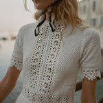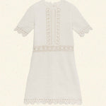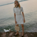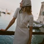The DÔEN Heirloom Bathilde Dress nods to crochet mini dresses of the 1960s, finished with Edwardian-inspired stitches. Hand-crocheted panels with intricate floral motifs adorn the bodice, sleeve cuffs, and mini-length hemline, while three floral crochet-covered buttons fasten at the back of the neck. Crafted from 100% mercerized Pima cotton, each dress is skillfully crocheted by our artisans in Peru, with each one taking several days to complete.
