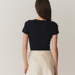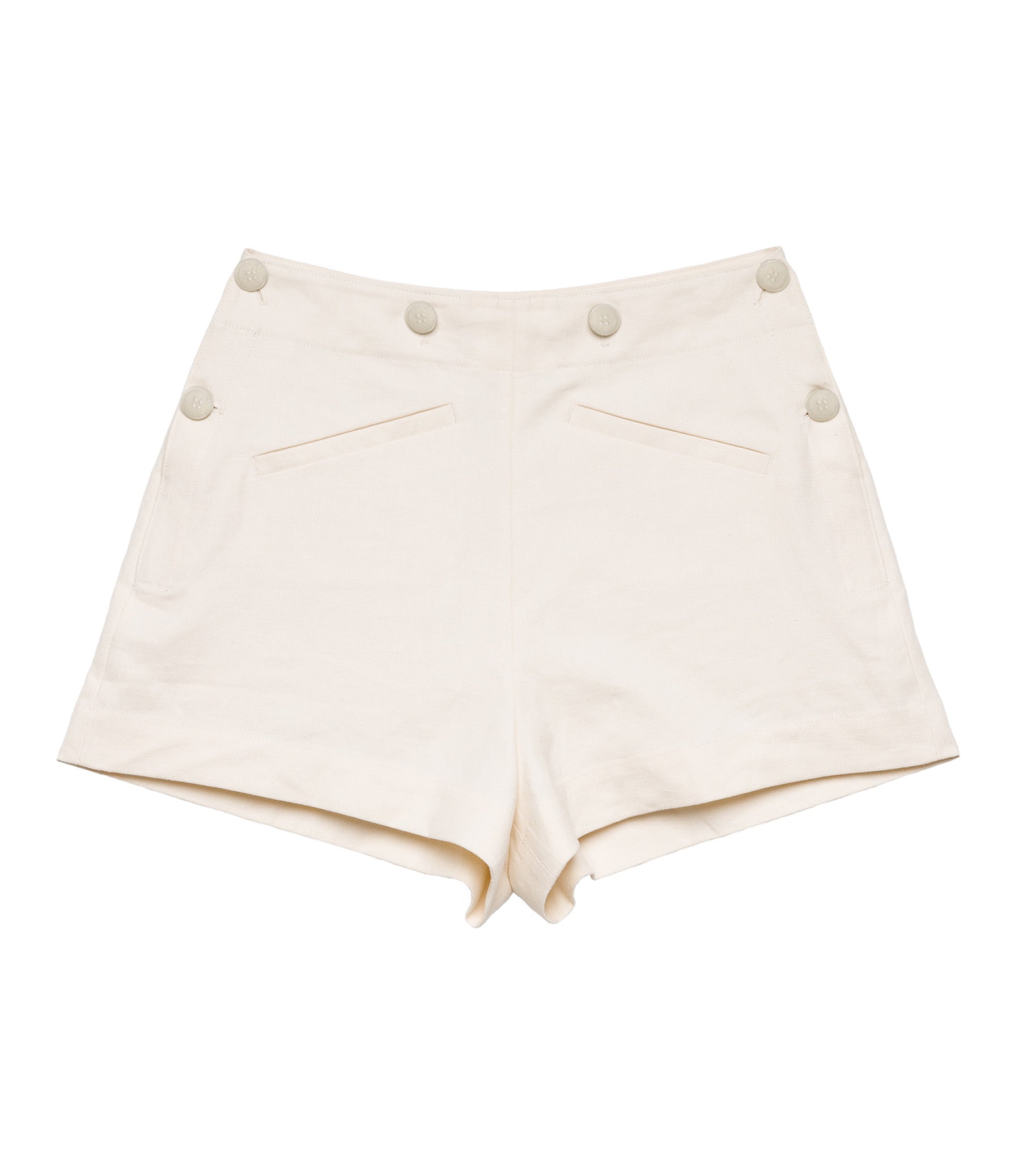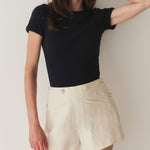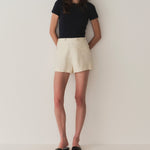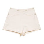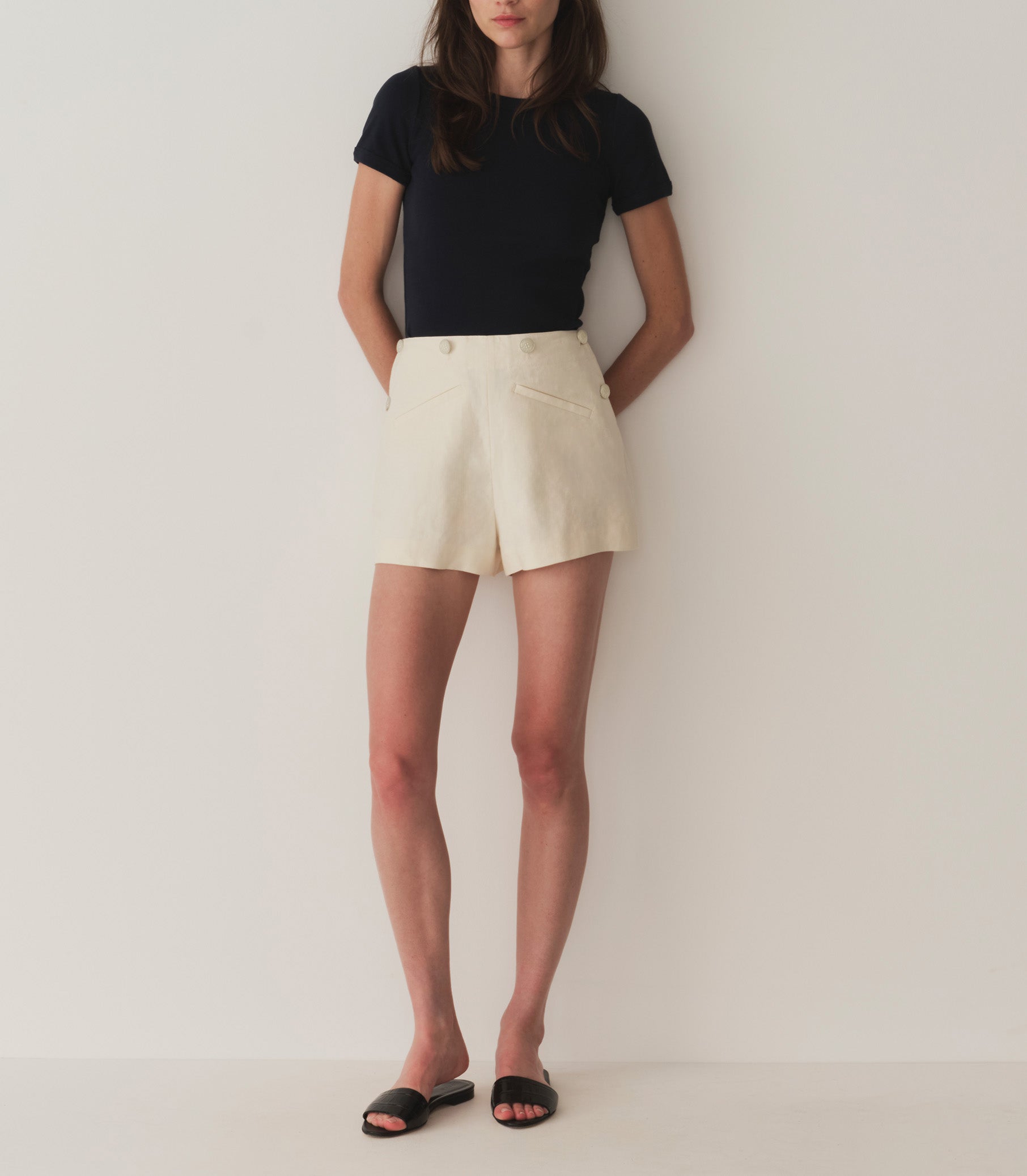Tailored in soft midweight hemp with a cotton lining, the Bernice Short—which takes cues from ‘60s nautical styles—features an ultra-high waist, an A-line cut, and welt pockets. The waistband is adorned with two fixed self-covered buttons, while additional buttons fasten at both sides.