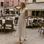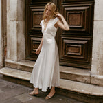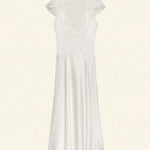 In buttery silk satin, the ‘30s-inspired Coraline Dress features gathered cap sleeves and a plunging V-neckline adorned with intricate embroidered scallop lace. A fitted bodice with an invisible side seam zipper and adjustable back waist tie gives way to a midi-length, bias-cut skirt, while an embroidered “D” at the bust adds a sweet finishing touch.