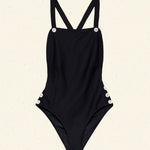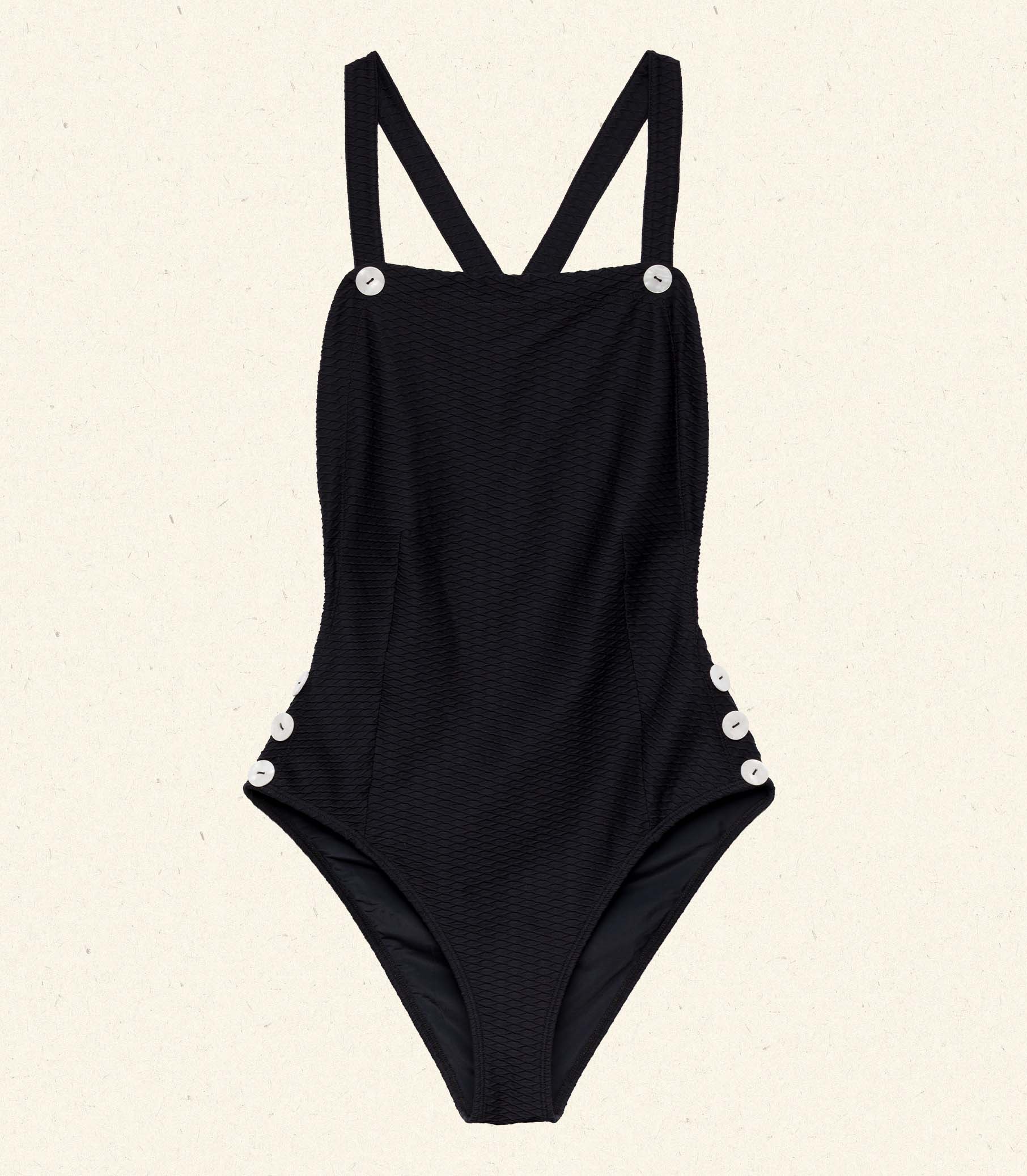 Inspired by 1960s swimwear, the Danica Maillot is a pinafore-style one-piece swimsuit with a high neckline, low back, and a medium-coverage leg cut. Made from stretchy, honeycomb texture swim fabric and fully lined, it’s adorned with oversized faux shell buttons at the hips and shoulder straps, which crisscross at the back for an elegant finish.