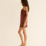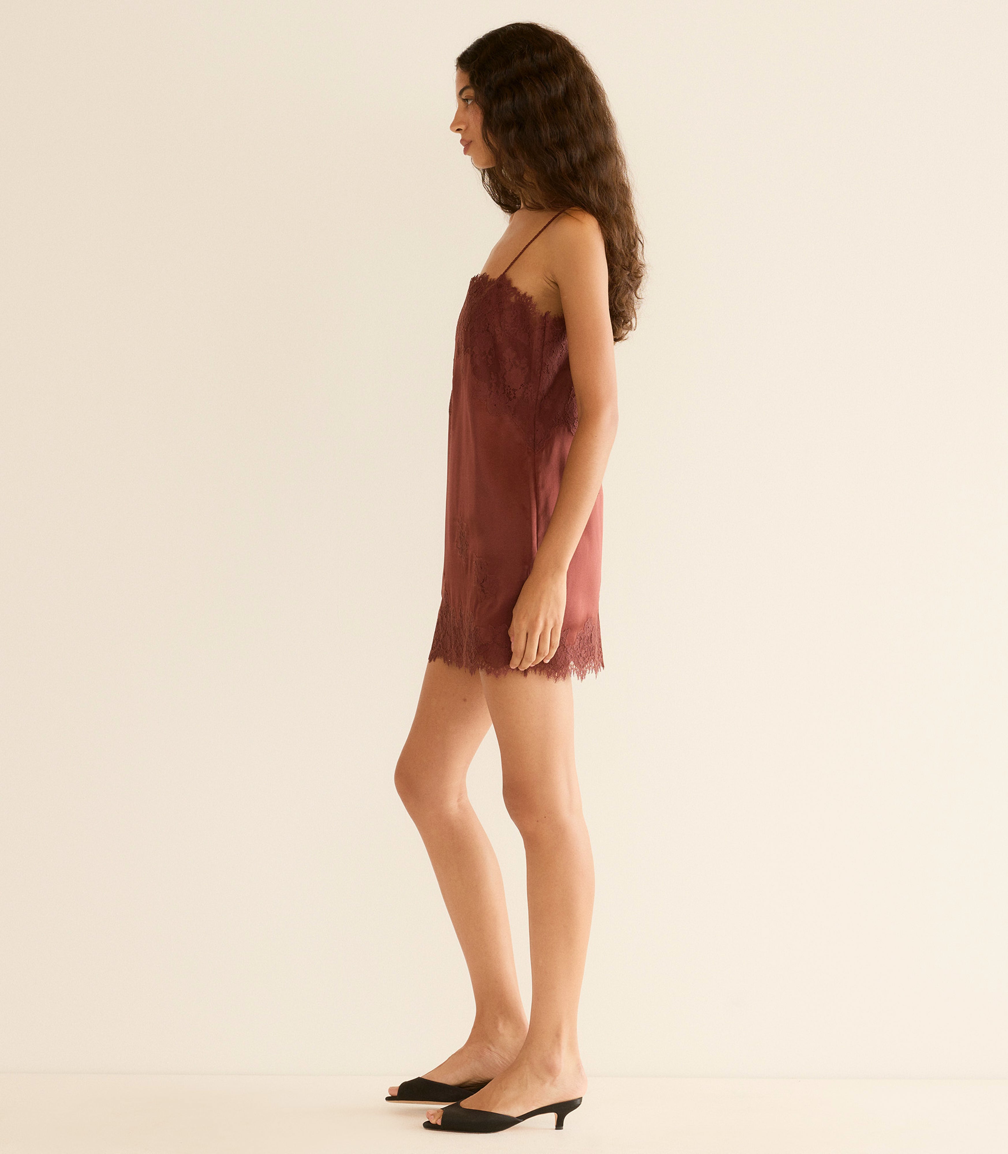 In buttery silk satin, the Elvina Dress is reminiscent of 1930s boudoir styles and a favorite of our co-founder, Katherine. It features a square neckline, delicate corded satin straps, and a playful mini-length hemline. Intricate floral lace adorns the neckline, bodice, and hem.
