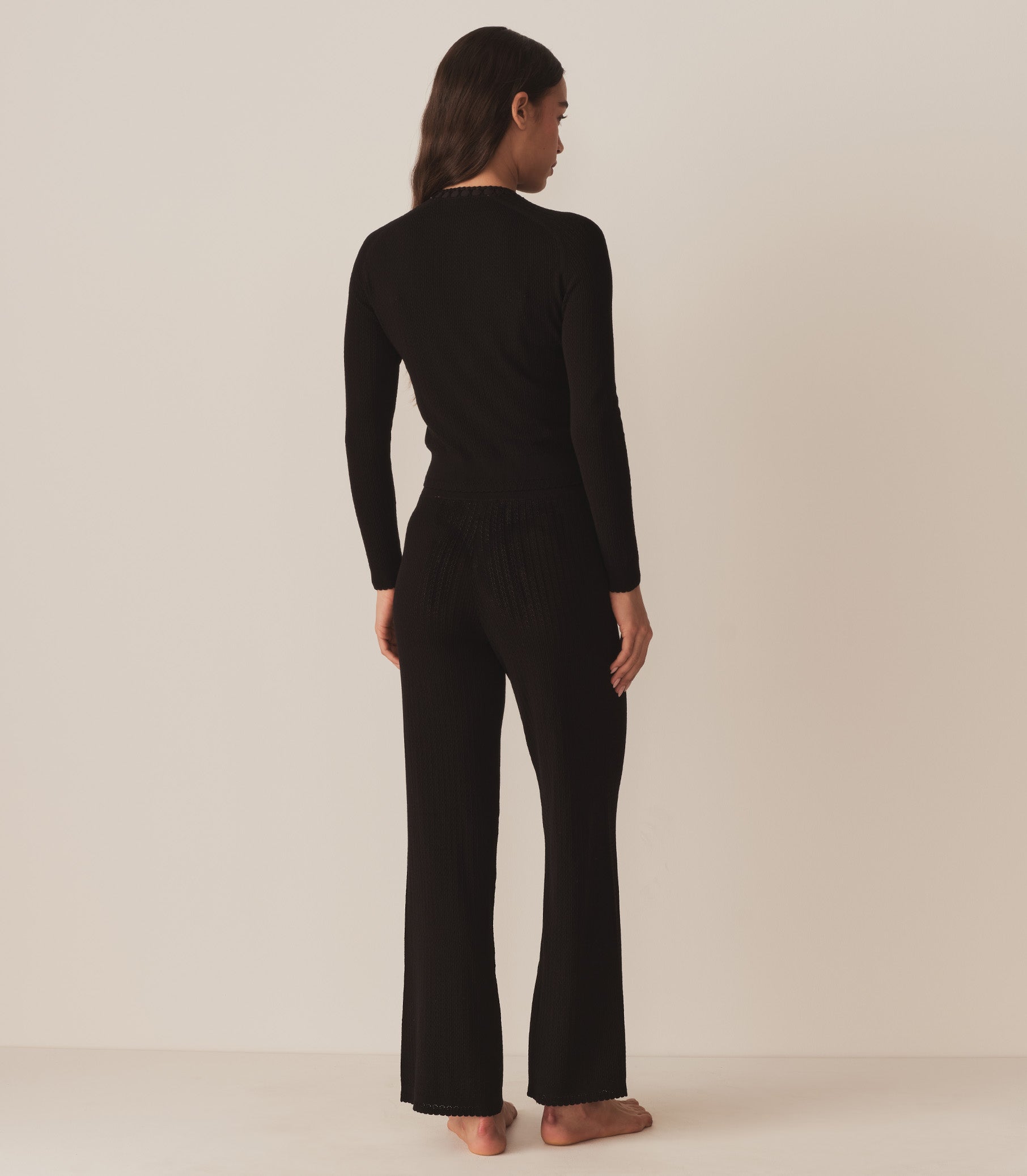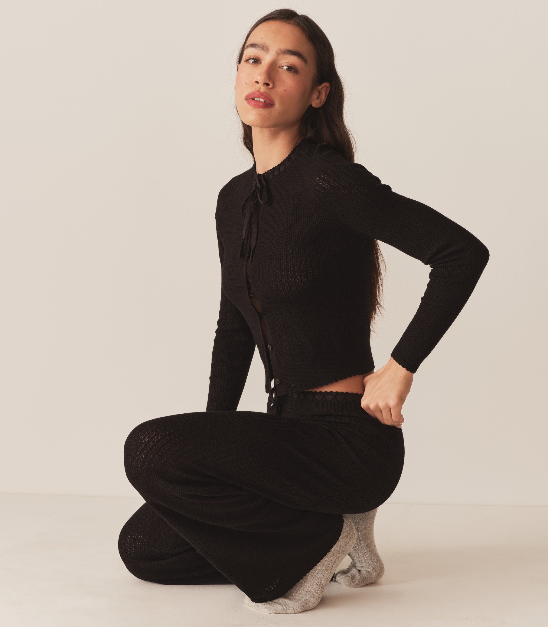 In a soft, stretchy viscose-blend pointelle, the Evonne Pant is an effortless, pull-on style with a wide leg and high waist threaded with a grosgrain ribbon and trimmed with elastic scallop detailing.