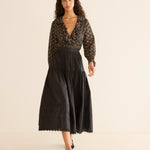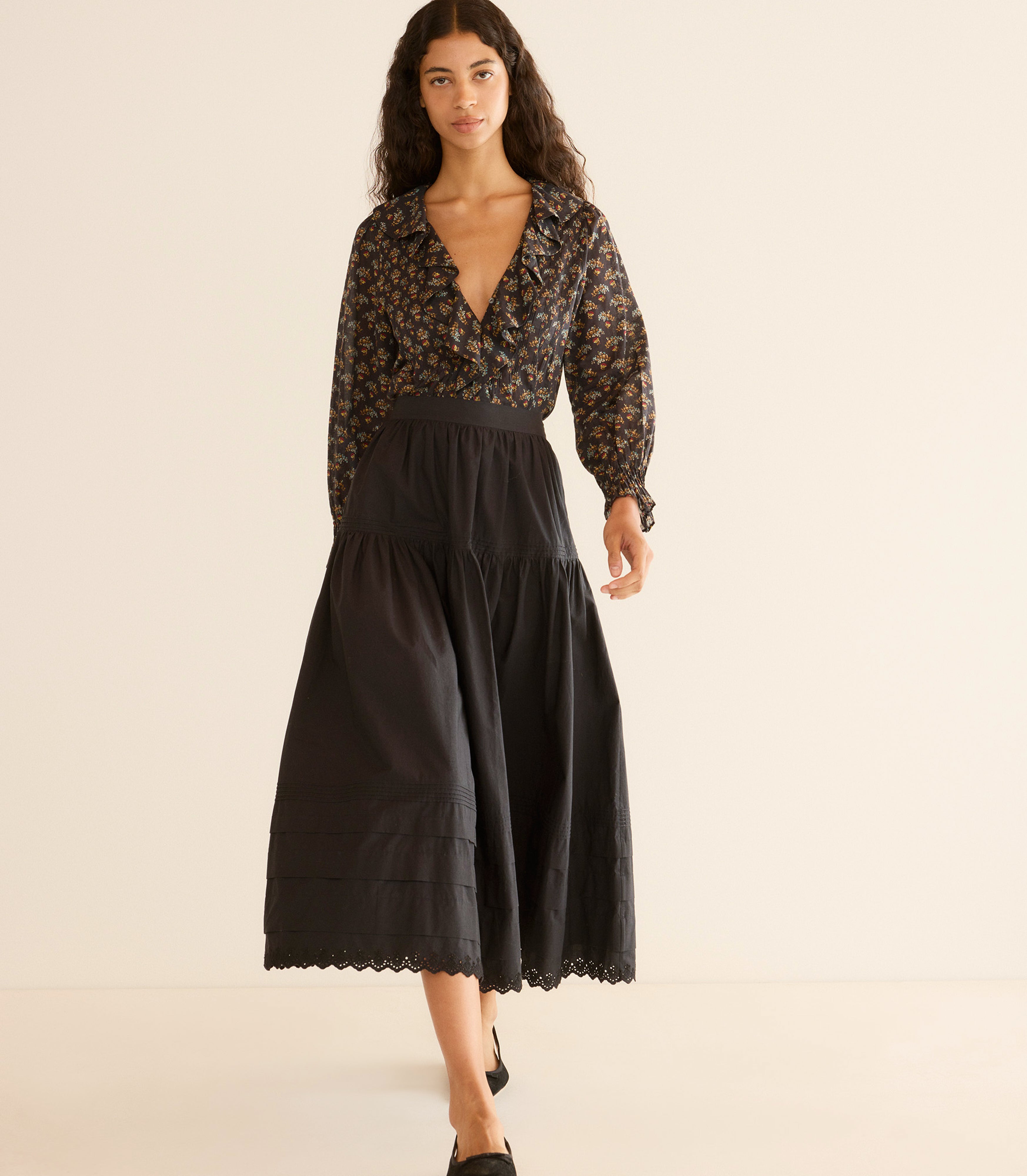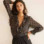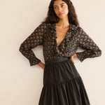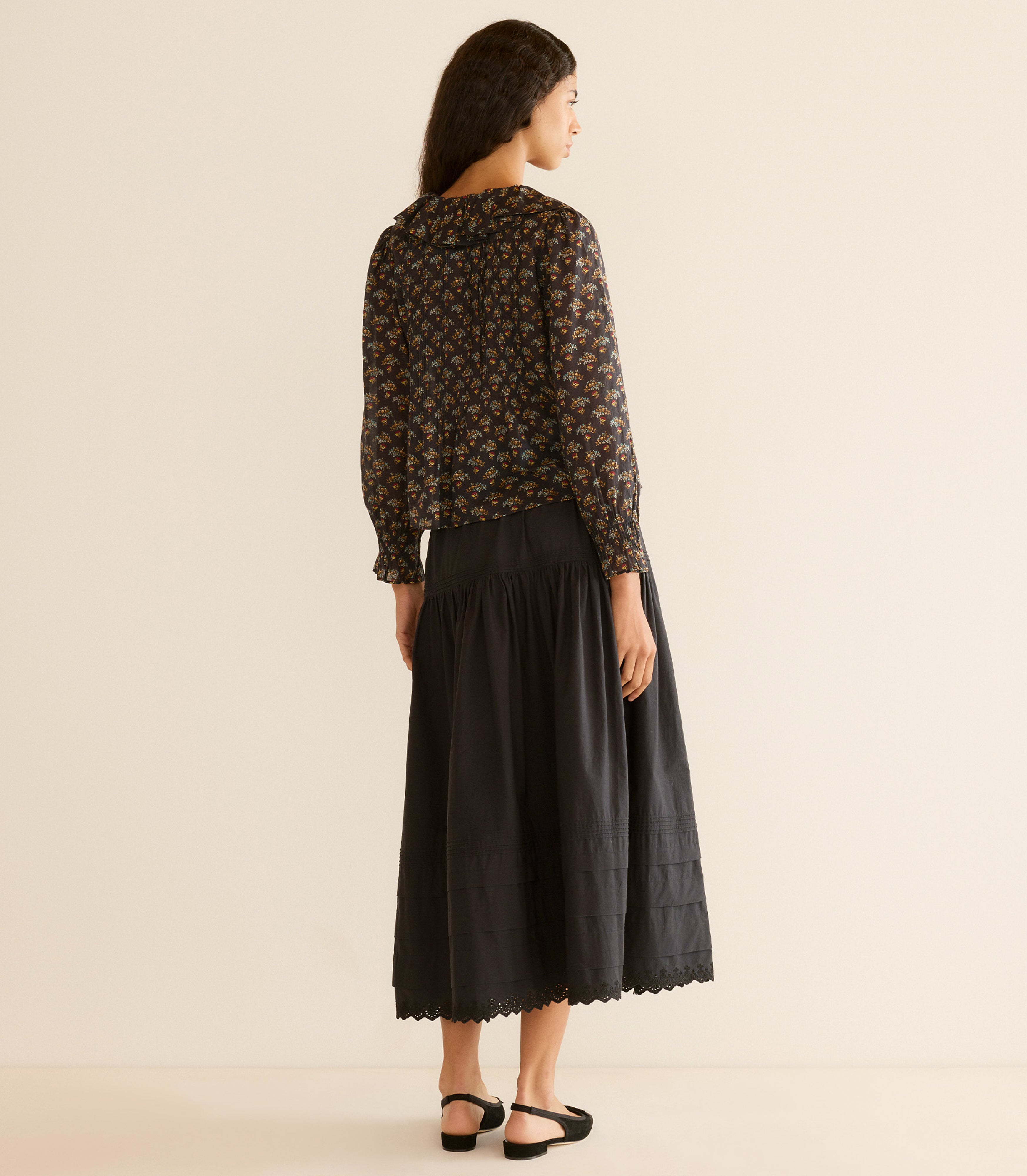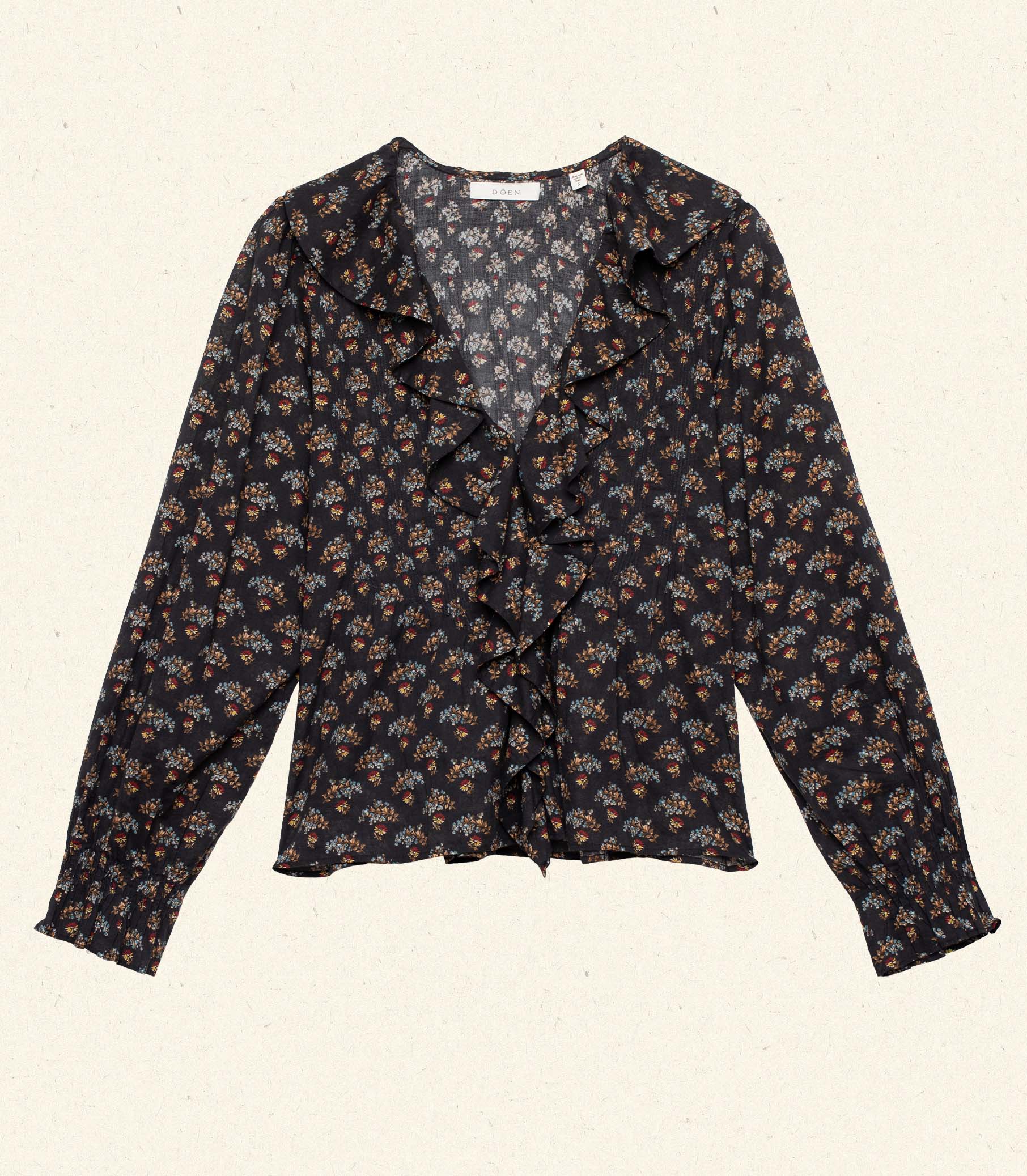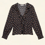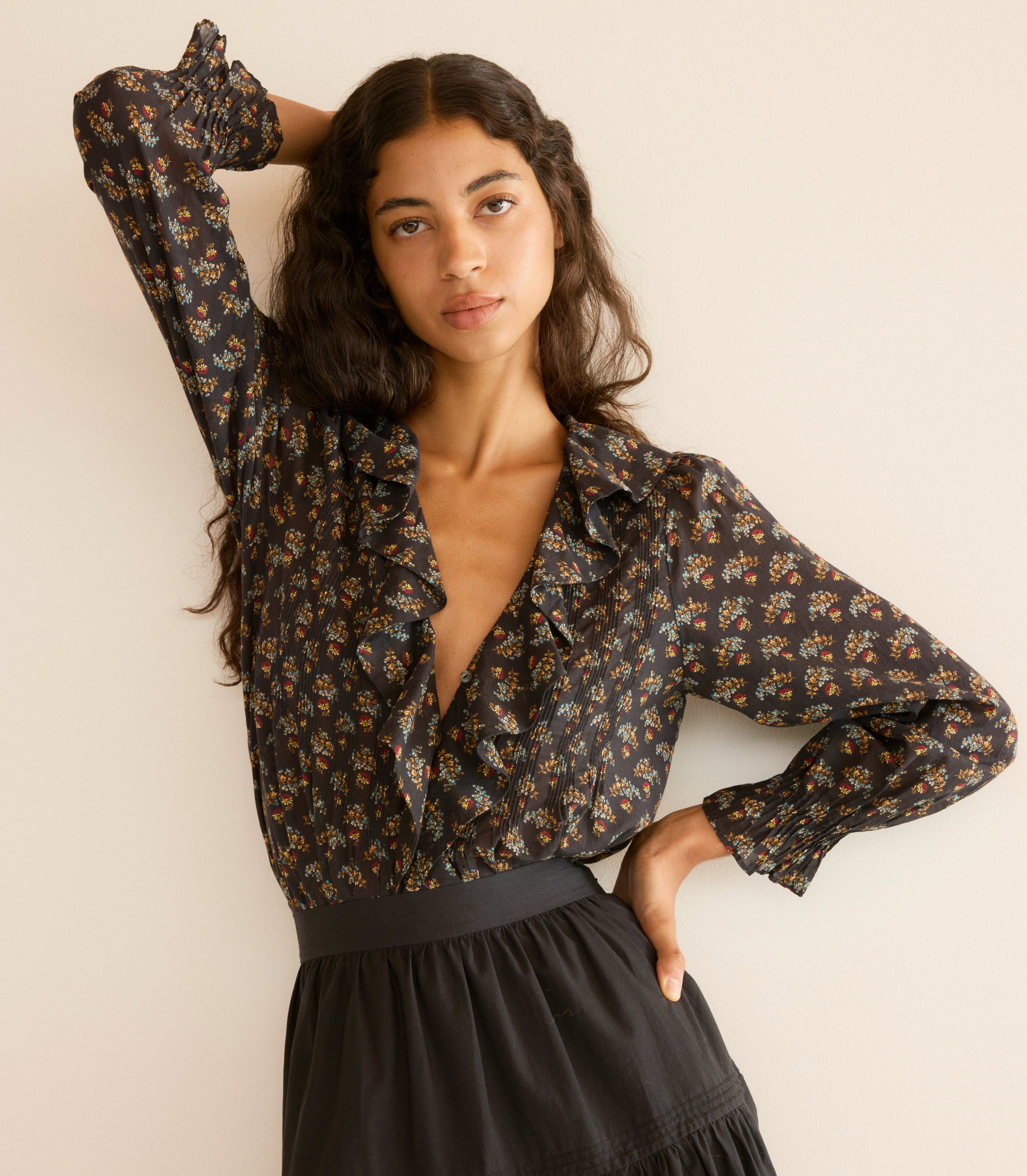 Crafted from the softest 100% organic cotton voile in our Delphinium Floral print, the Hardy Top—a long-sleeved version of our beloved Henri Top—features a breezy silhouette with a plunging V-neckline framed with cascading ruffles that extend down the bodice. Hidden starburst buttons and clustered pintucks detail the yoke and back, while generous full-length sleeves finish in lace-trimmed ruffle cuffs. Wear it loose, or tuck it into your favorite high-waisted jeans.