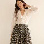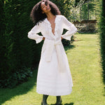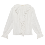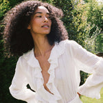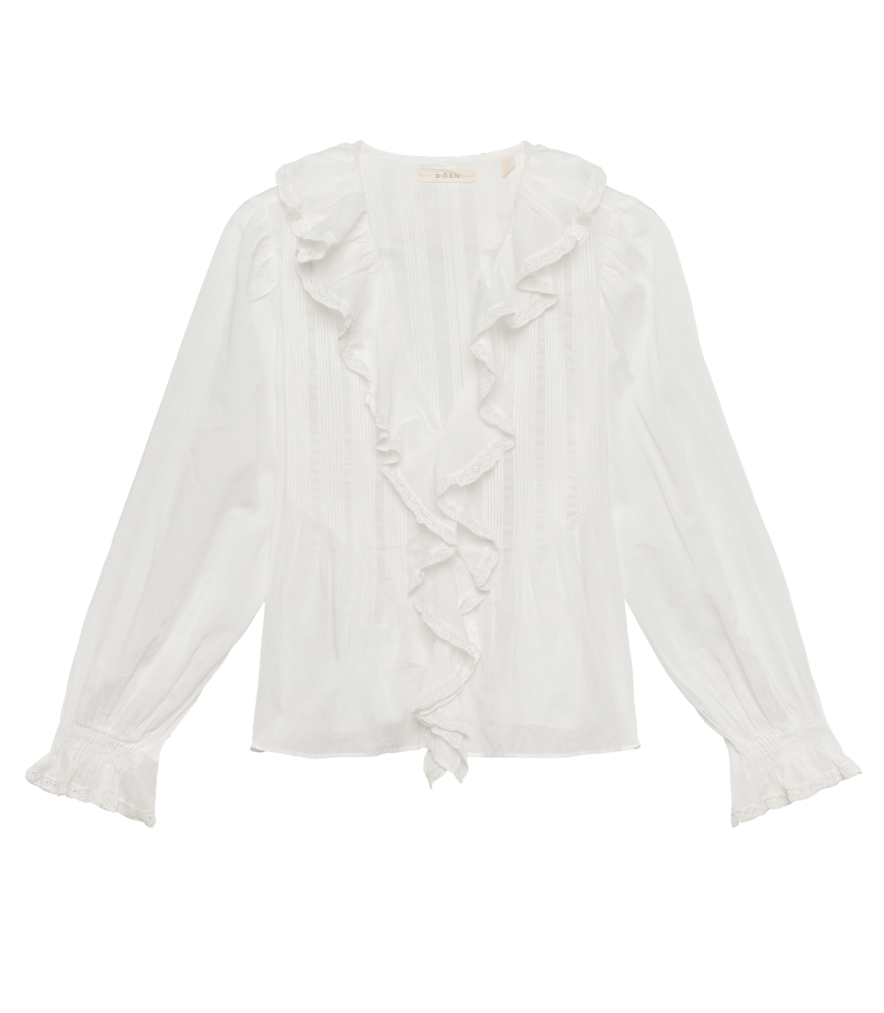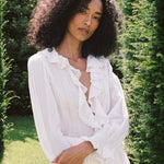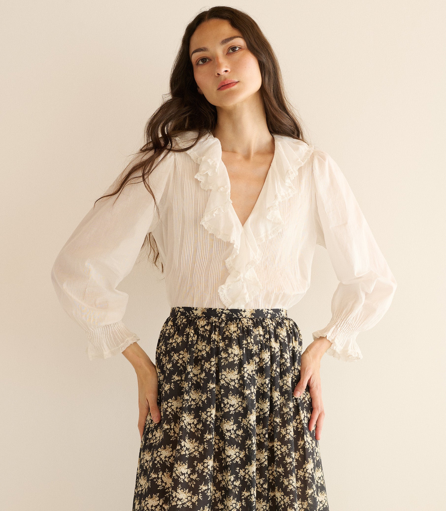 Crafted from the softest 100% organic cotton voile, the Hardy Top—a long-sleeved version of our beloved Henri Top—features a breezy cut, a plunging V-neckline framed with cascading lace-trimmed ruffles that extend down the bodice, hidden starburst buttons, and clustered pintucks at the yoke and back. Generous full-length sleeves finish in lace-trimmed ruffles at the cuffs. Wear it loose, or tuck it into your favorite high-waisted jeans.