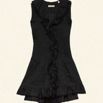 Rendered in a lightweight ramie, the Henrietta is a sleeveless button-front mini dress. The plunging V-neckline is framed by a cascading lace-trimmed ruffle that extends down the bodice and along the skirt’s hem. Pintucks lend texture to the relaxed bodice, which can be cinched at the back with a waist tie. A line of hidden starburst buttons extends down the front.