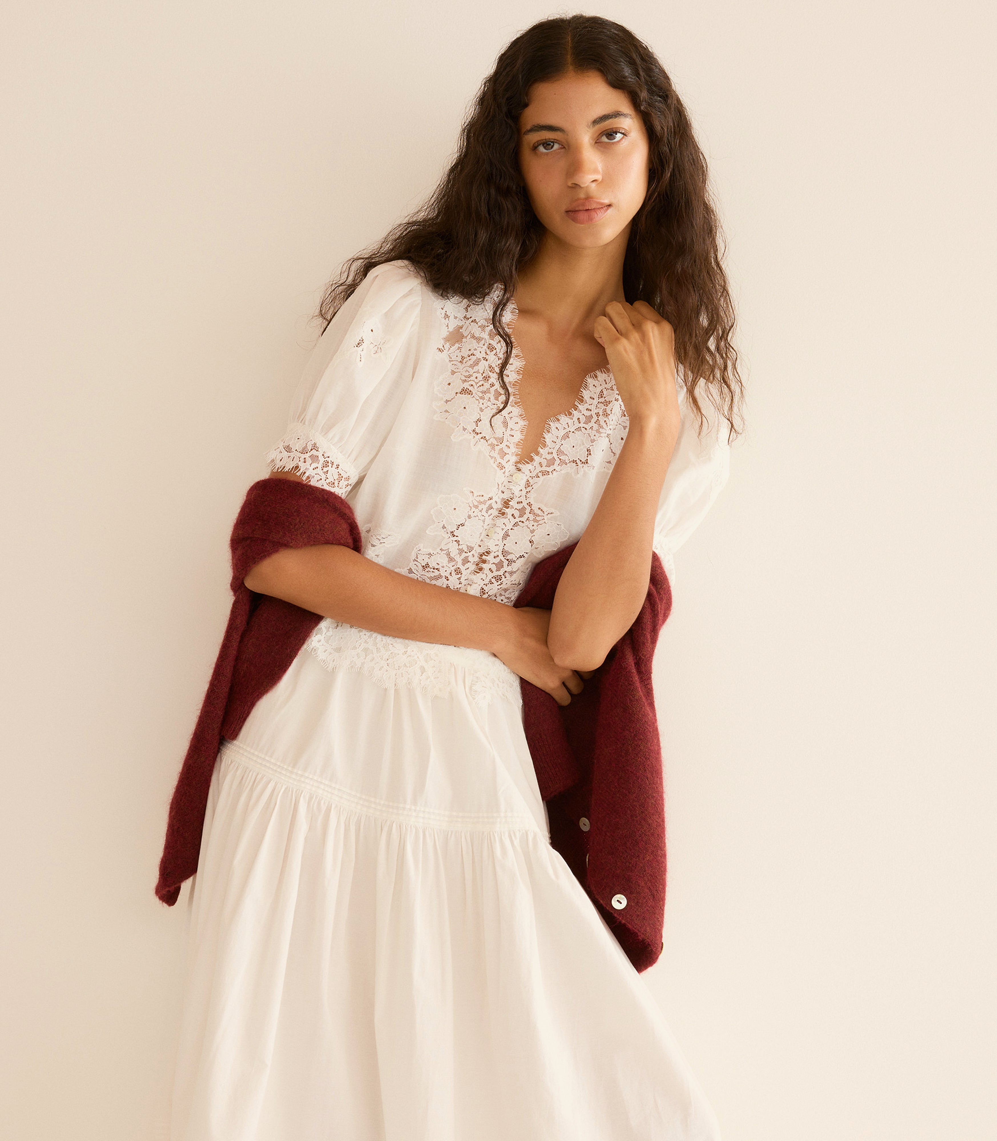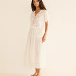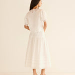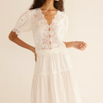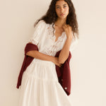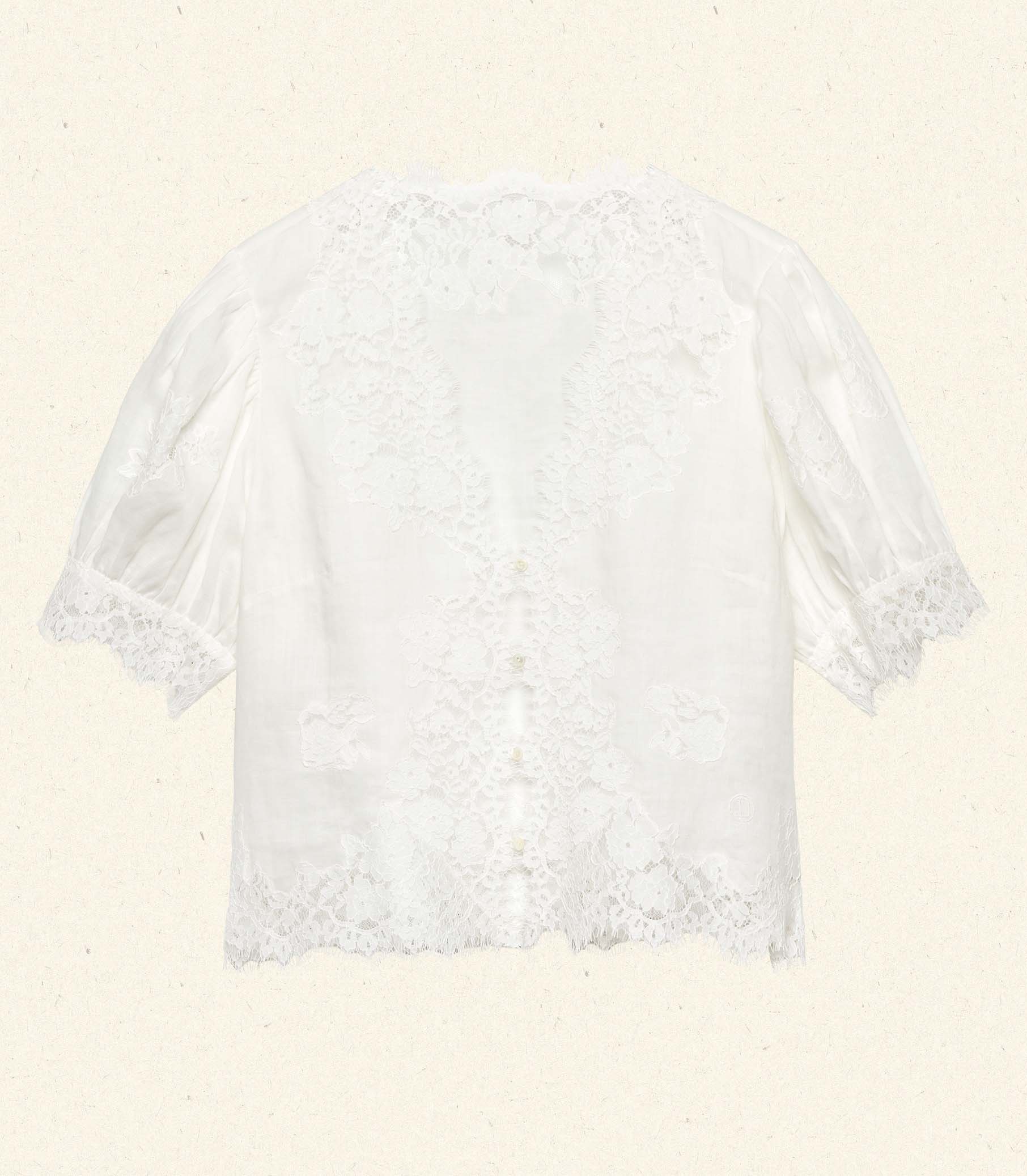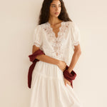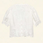Crafted from crisp, lightweight ramie, the antique-inspired DÔEN Heirloom Idella Top features a plunging V-neckline, short puffed sleeves, and a breezy cut. Intricate embroidered floral lace trims the neckline, sleeve cuffs, center front placket, and slightly cropped hemline, while lace insets adorn the sleeves and bodice. An embroidered “D” emblem finishes the front left hem, and a line of mother-of-pearl buttons extends down the front.