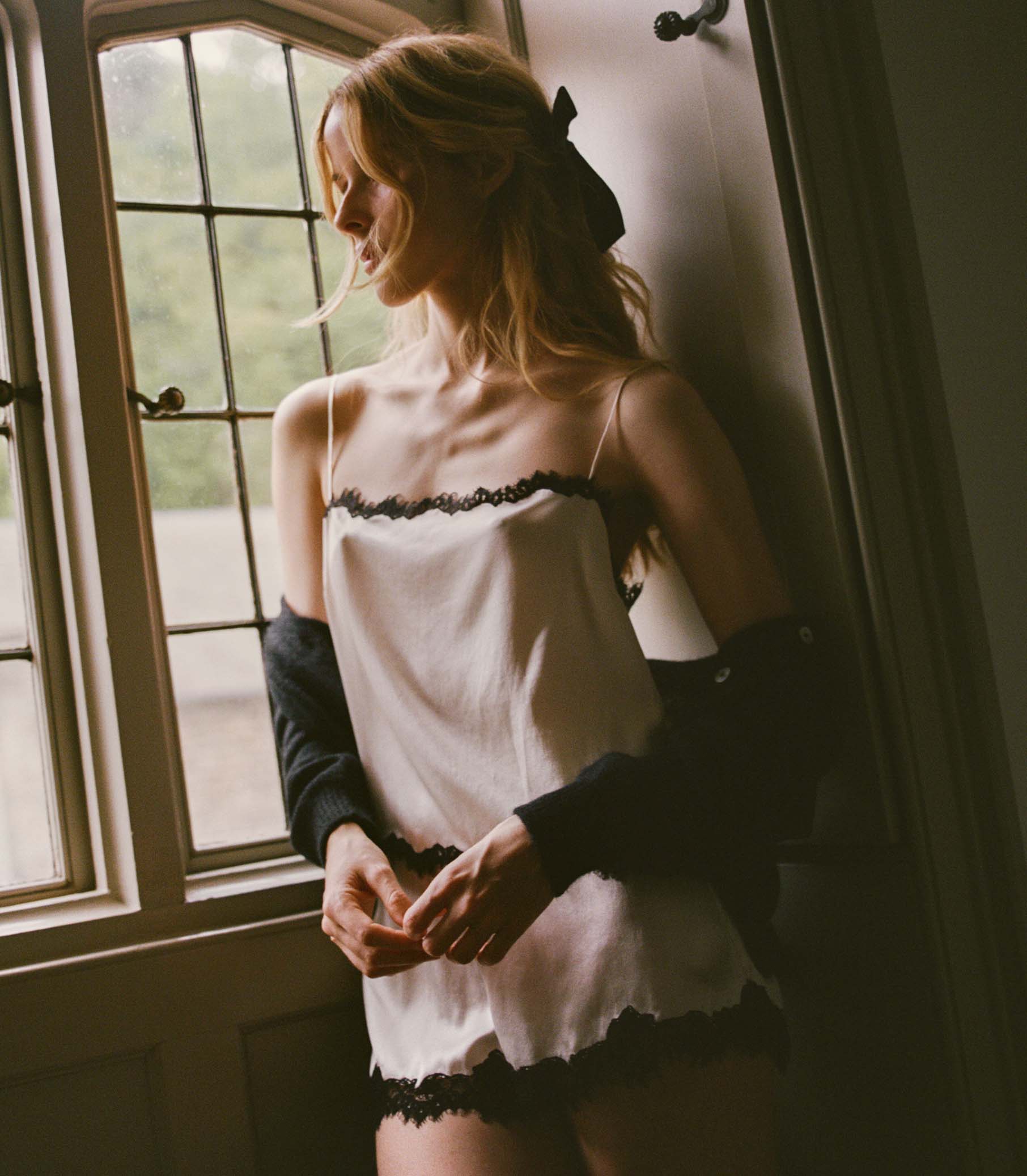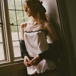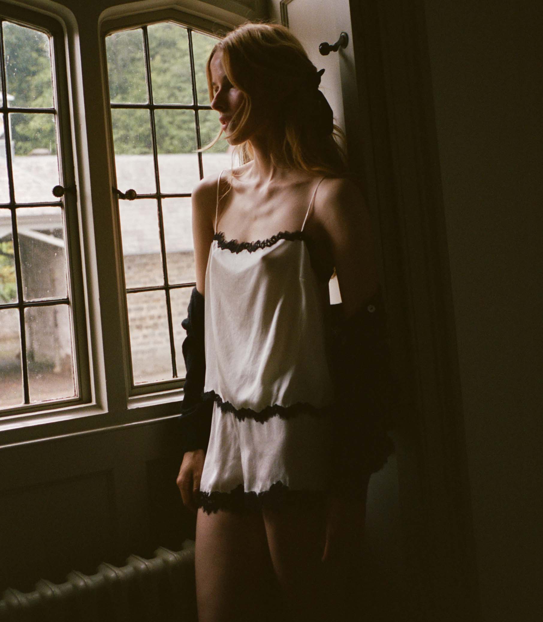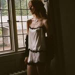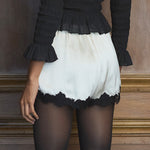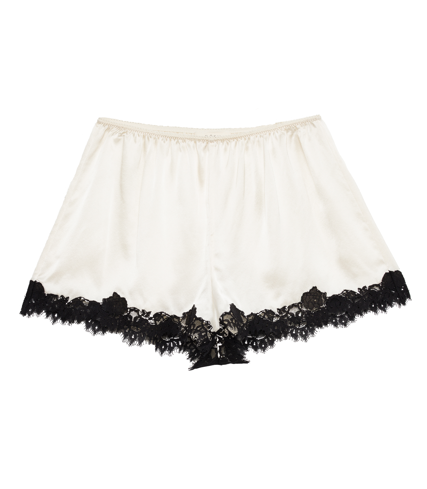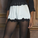 In buttery silk satin, the Iona Short is an effortless pull-on style, featuring a high waist trimmed with elastic scallop detailing and intricate floral lace at the hems.