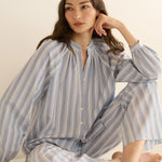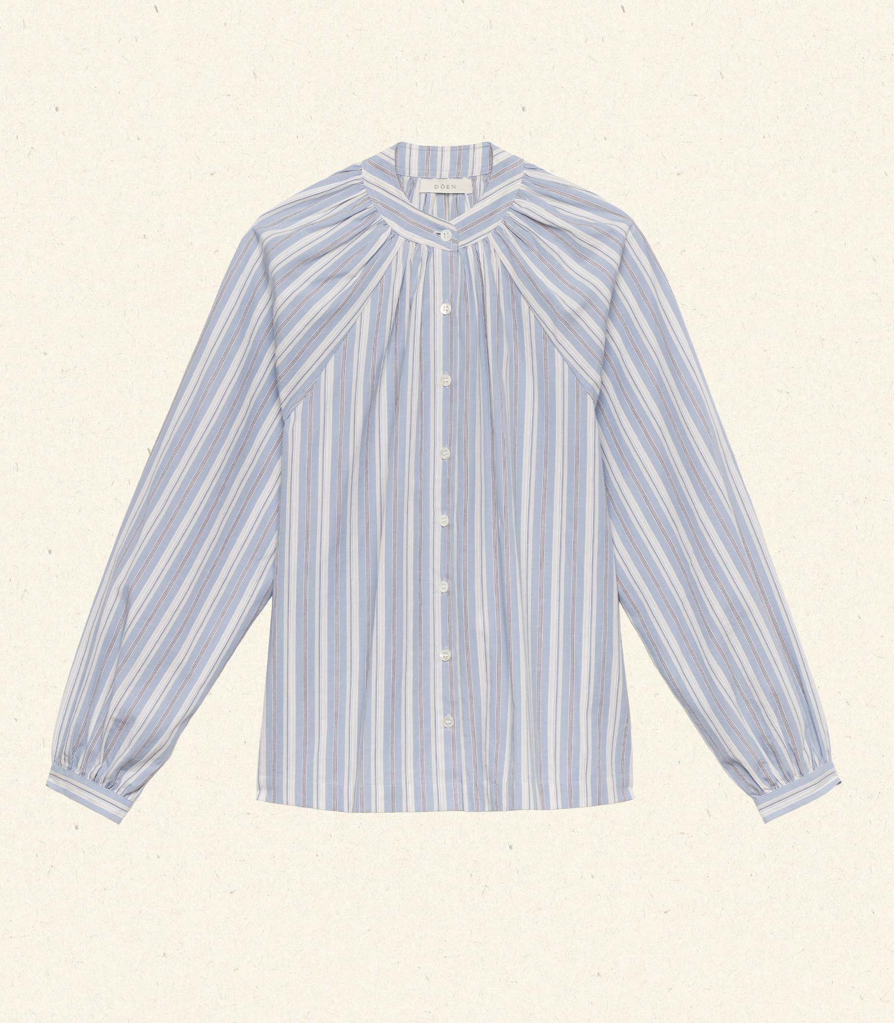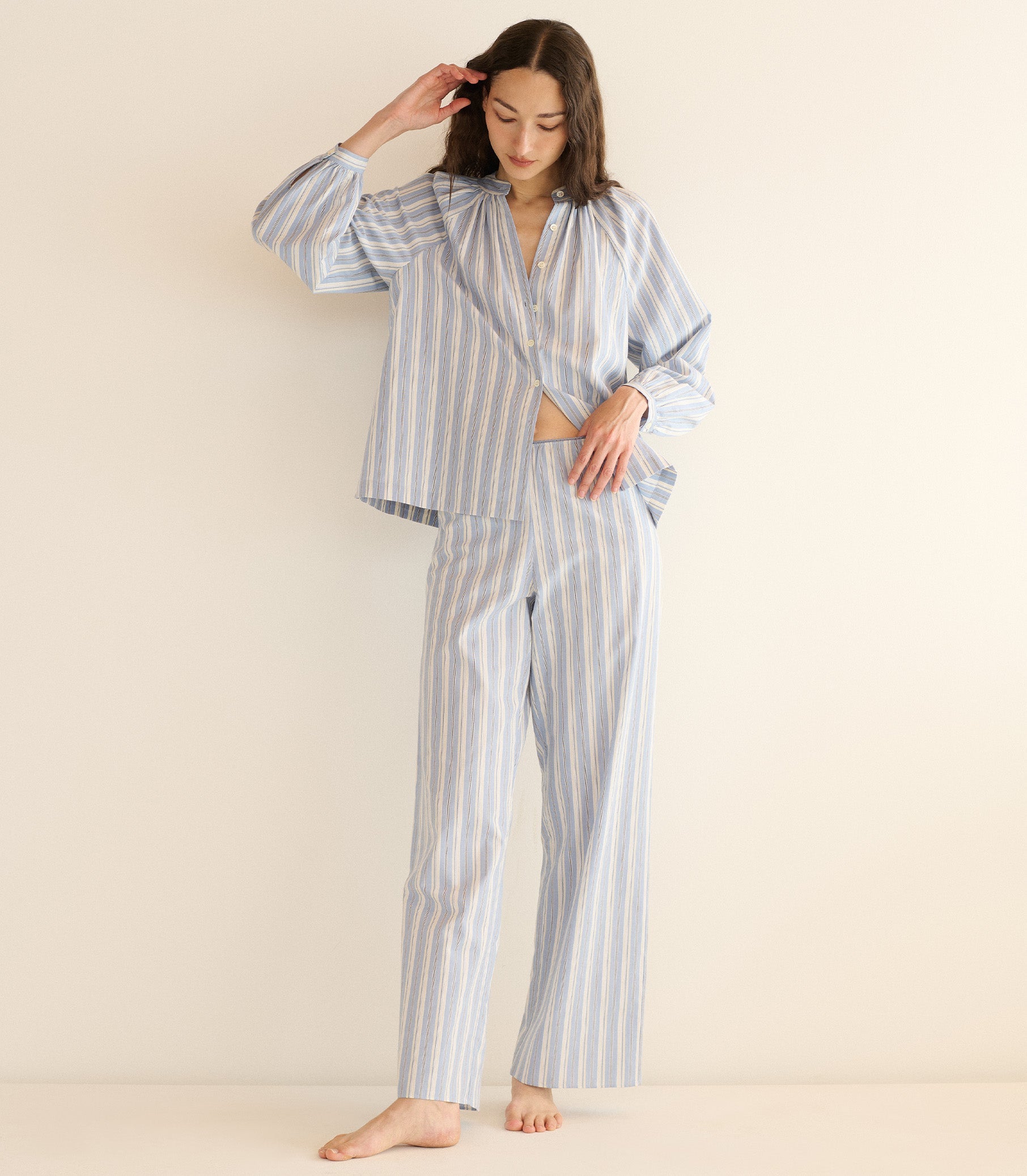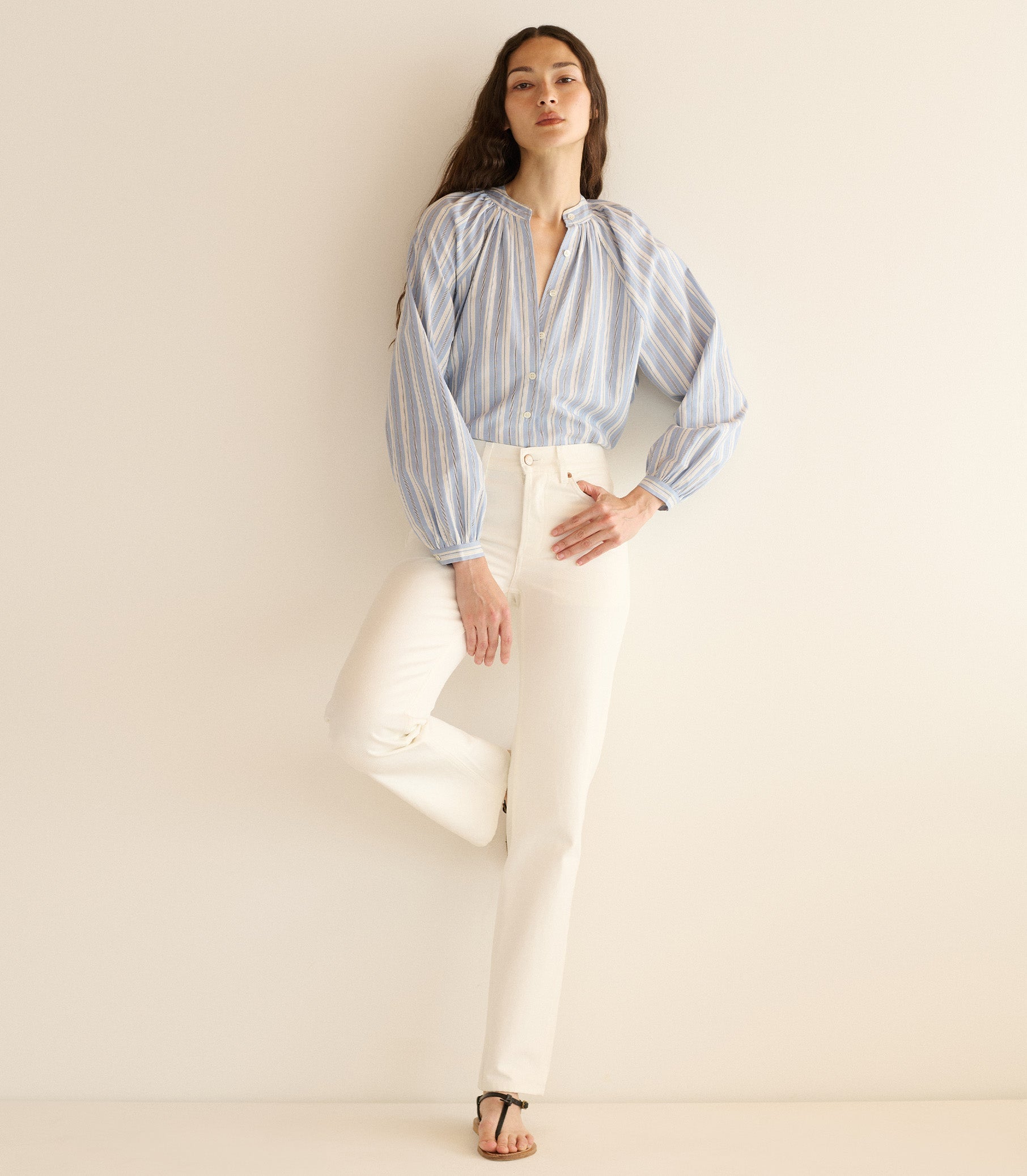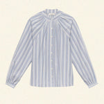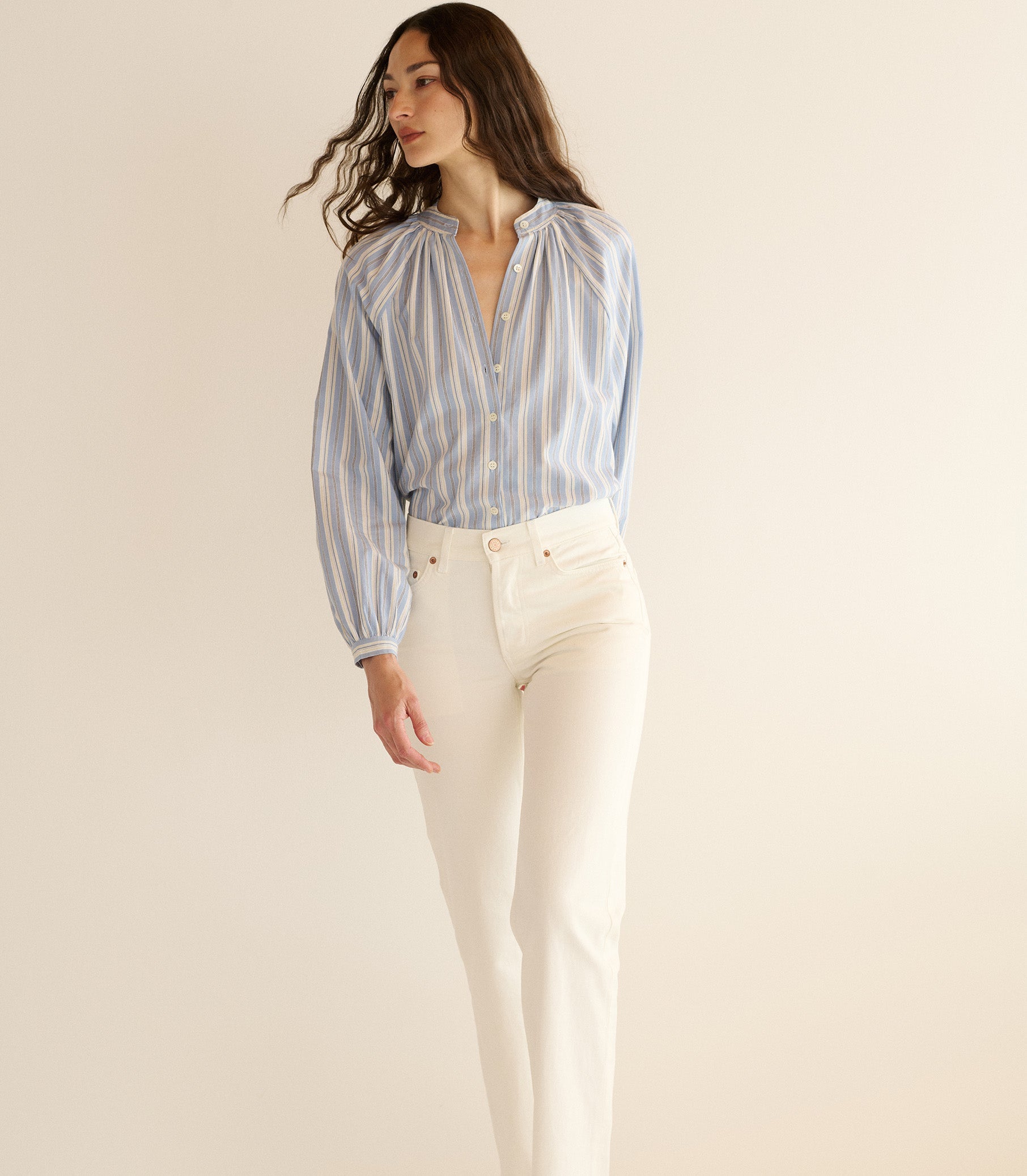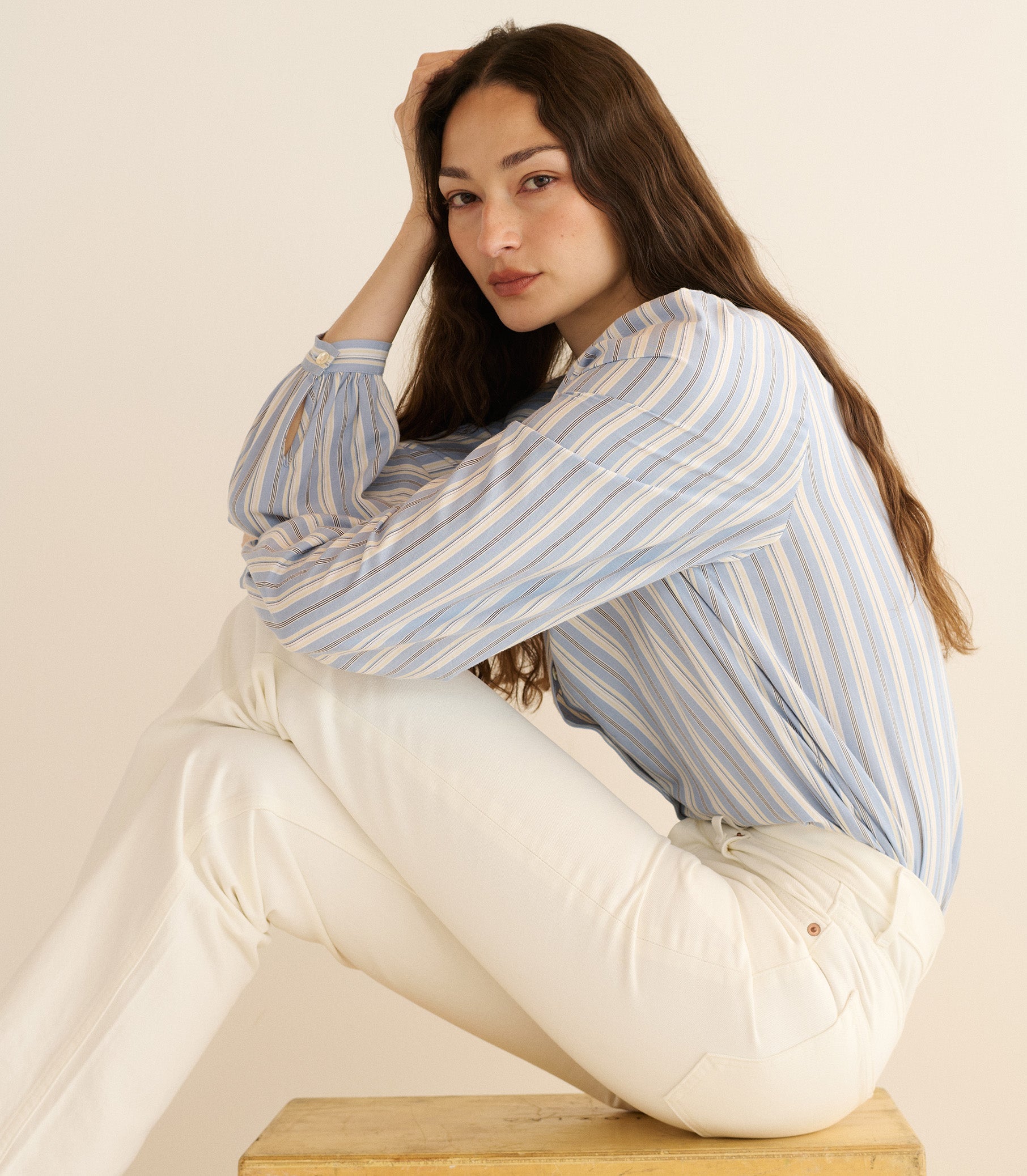 The Julienne Top takes cues from our beloved Jane Blouse, crafted from a soft, washed organic cotton shirting fabric in our yarn-dyed Loiret Stripe. With a breezy silhouette, it features full-length raglan sleeves, a wide stand collar, and mother-of-pearl buttons at the center front. Wear it loose, or tuck it into your favorite high-waisted jeans.