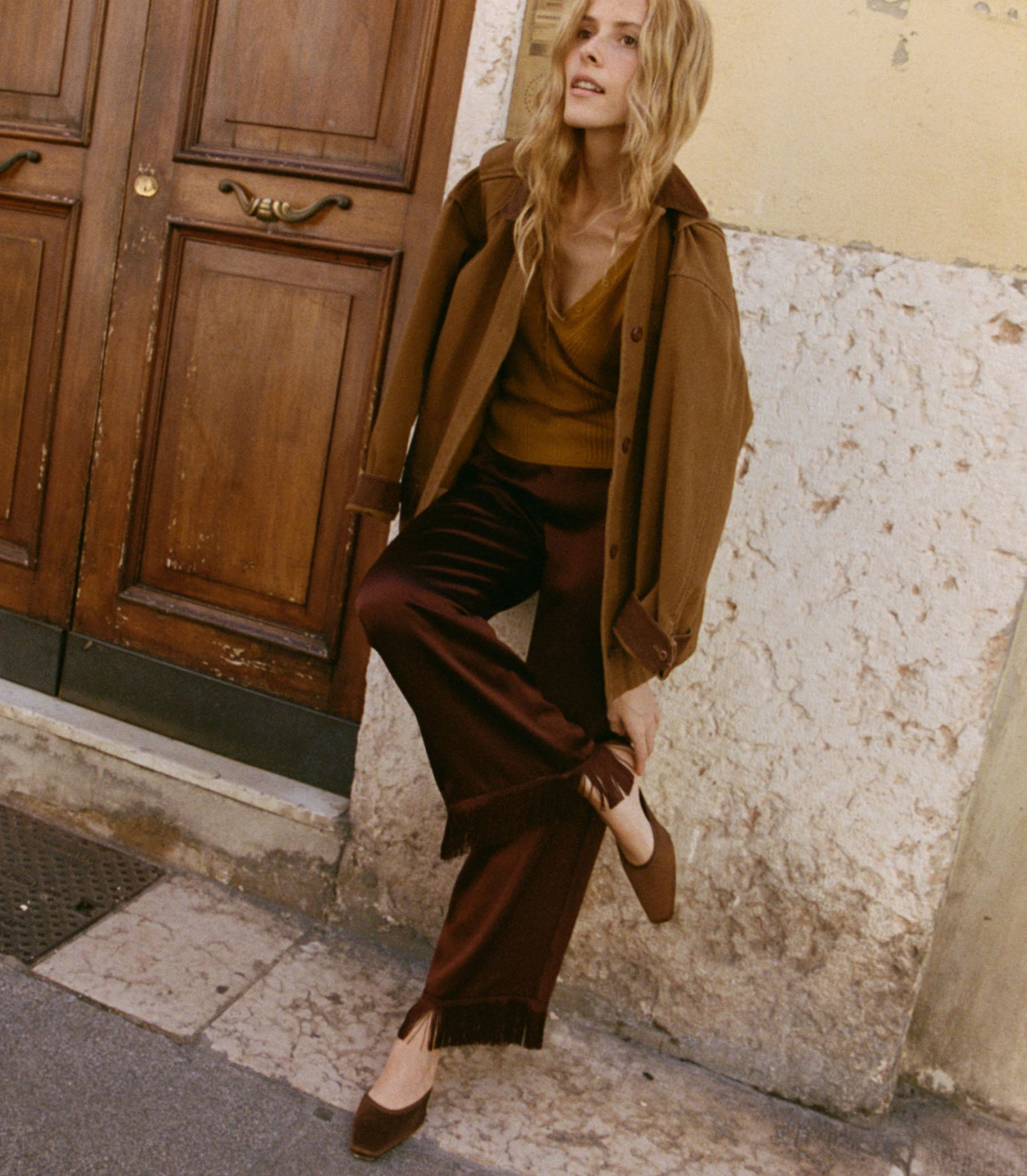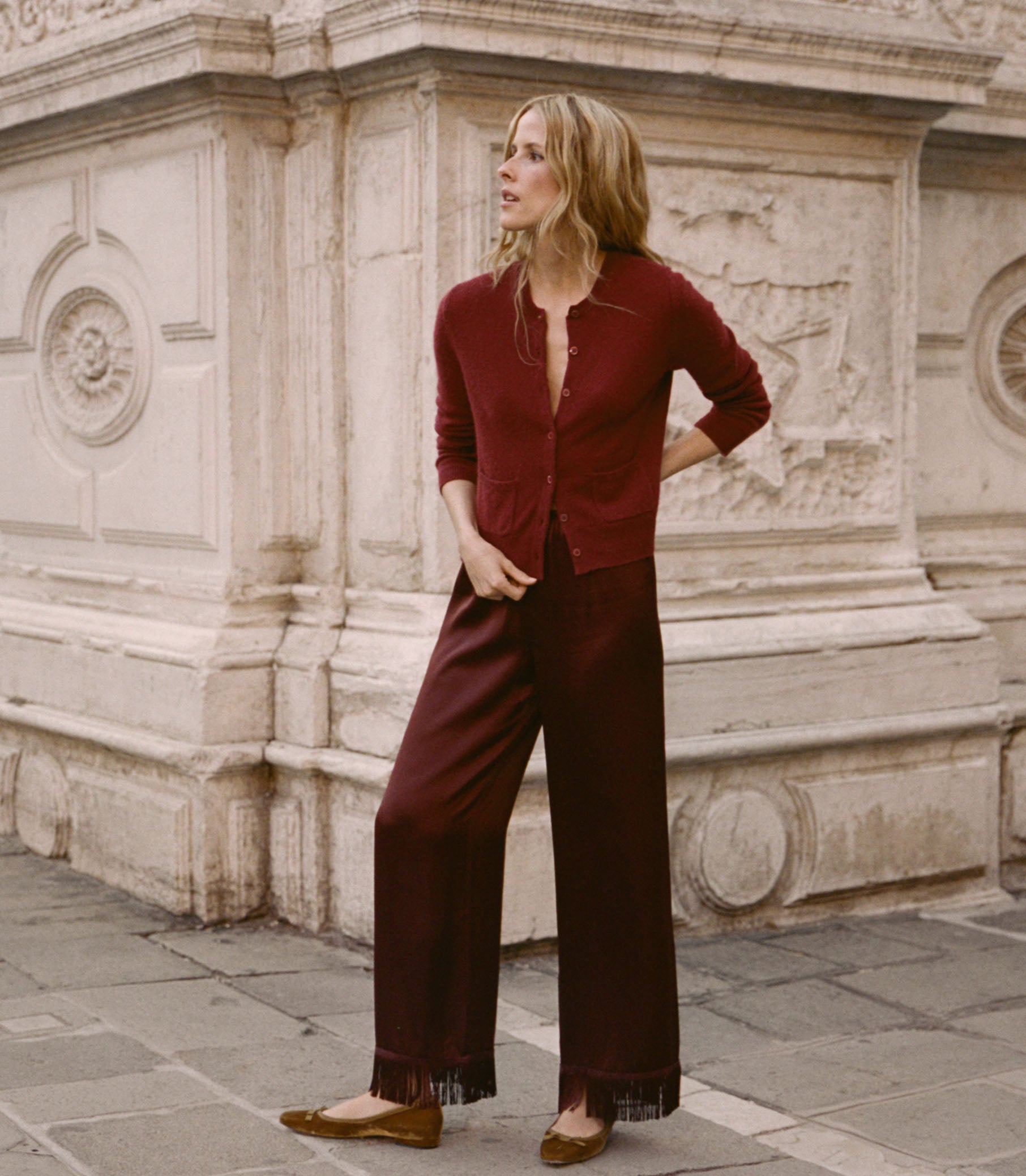 Crafted in a buttery silk satin, the Lavon Pant is an effortless pull-on style with a high waist, wide leg, and fringe at the hems.