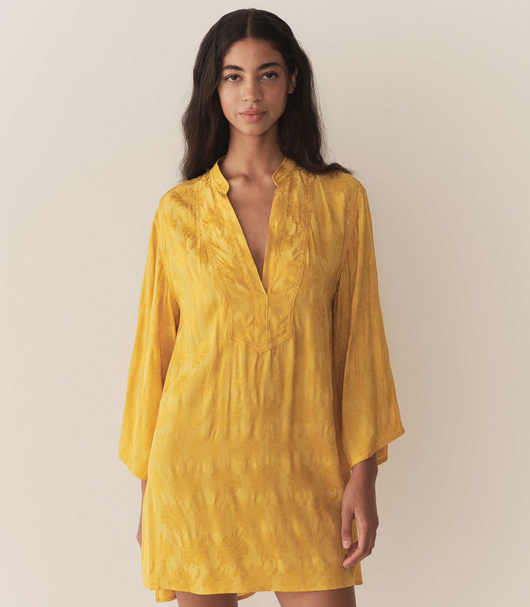 In floral jacquard reminiscent of a vintage tunic from our content team's personal collection, the Leona Dress features a high neck with a Nehru collar, three-quarter-length bell sleeves, and a gently flared A-line silhouette. The Leona comes with a matching detachable scarf that can be tied as a belt for a cinched look.