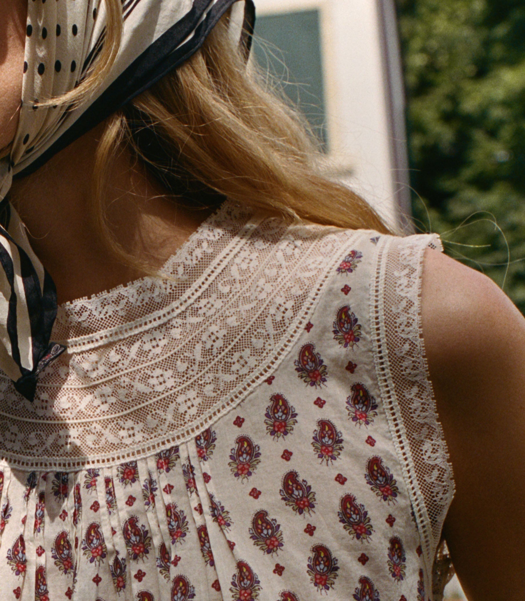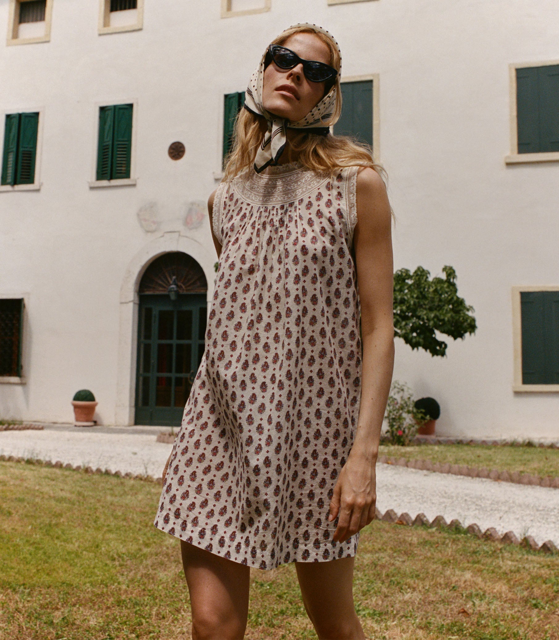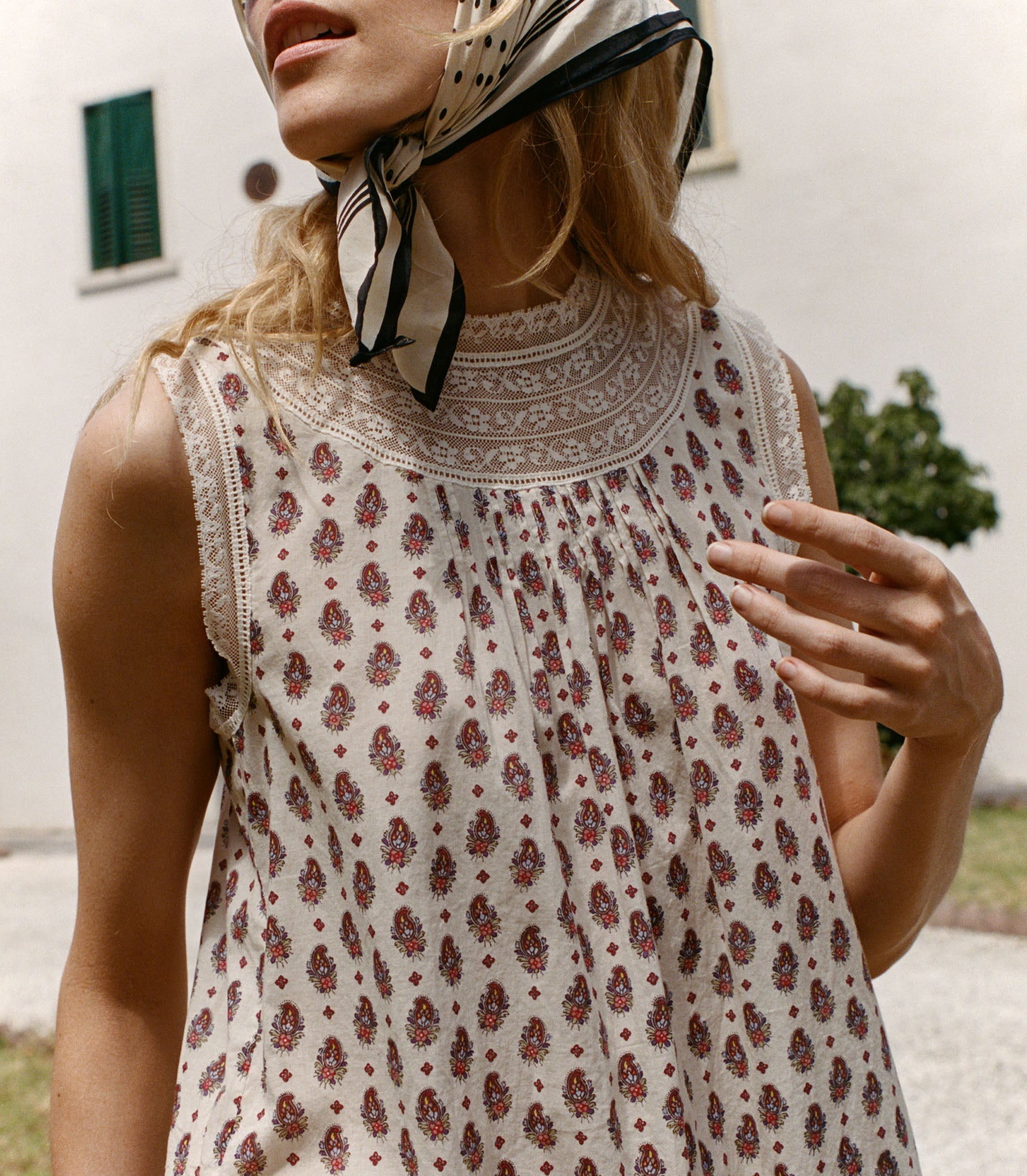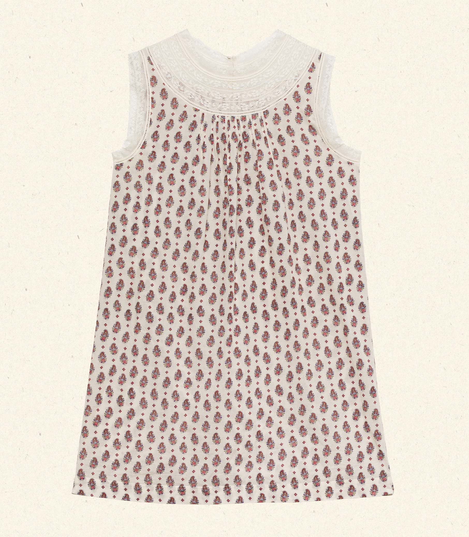 The Leonore Dress is a mini shift silhouette rendered in our antique-inspired Provençal Paisley print on mid-weight cotton voile. Intricate inset lace and ladder trim frame the high neckline and sleeve openings, while clustered pintucks add texture to the bodice. Delicate mother-of-pearl buttons fasten at the back of the neck.
