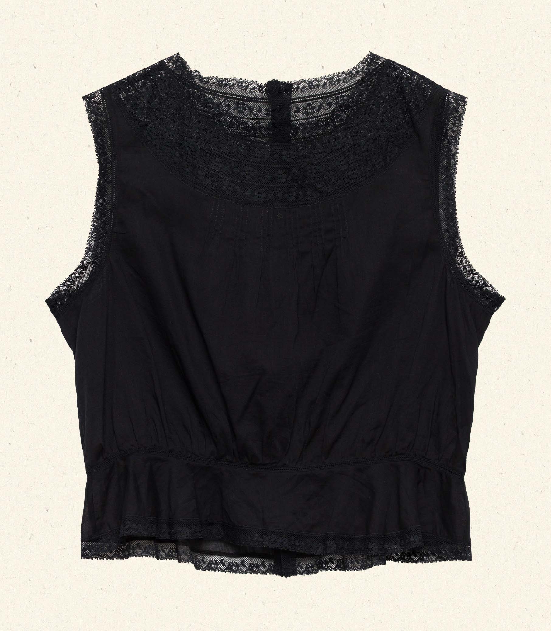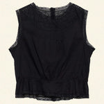 Our Edwardian-inspired Lilibet Top returns, now in a lightweight organic cotton voile. It features a high neck adorned with intricate inset lace and ladder trim, clustered pintucks at the yoke and back, and inset ladder trim at the waistline. Mother-of-pearl buttons extend down the back, while scallop-edged floral lace trims the neckline, sleeve openings, and hem.