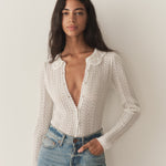 Rendered in 100% organic cotton pointelle, the Martina Cardigan features delicate crochet buttons and a Peter Pan collar adorned with hand-crocheted detailing. Fitted full-length sleeves are gathered at the shoulders for subtle volume. Scallop crochet detailing adorns the sleeve cuffs, center front placket, and slightly cropped hem.