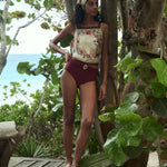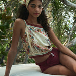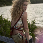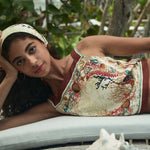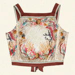 The DÔEN Heirloom Nami Top is a sleeveless open-back silhouette in buttery silk-viscose twill, graced with our hand-drawn Coquillages des Biarritz—a coastal print with intertwining seashells, kelp and coral. Placed borders trim the neckline, hem, and trailing back ties.