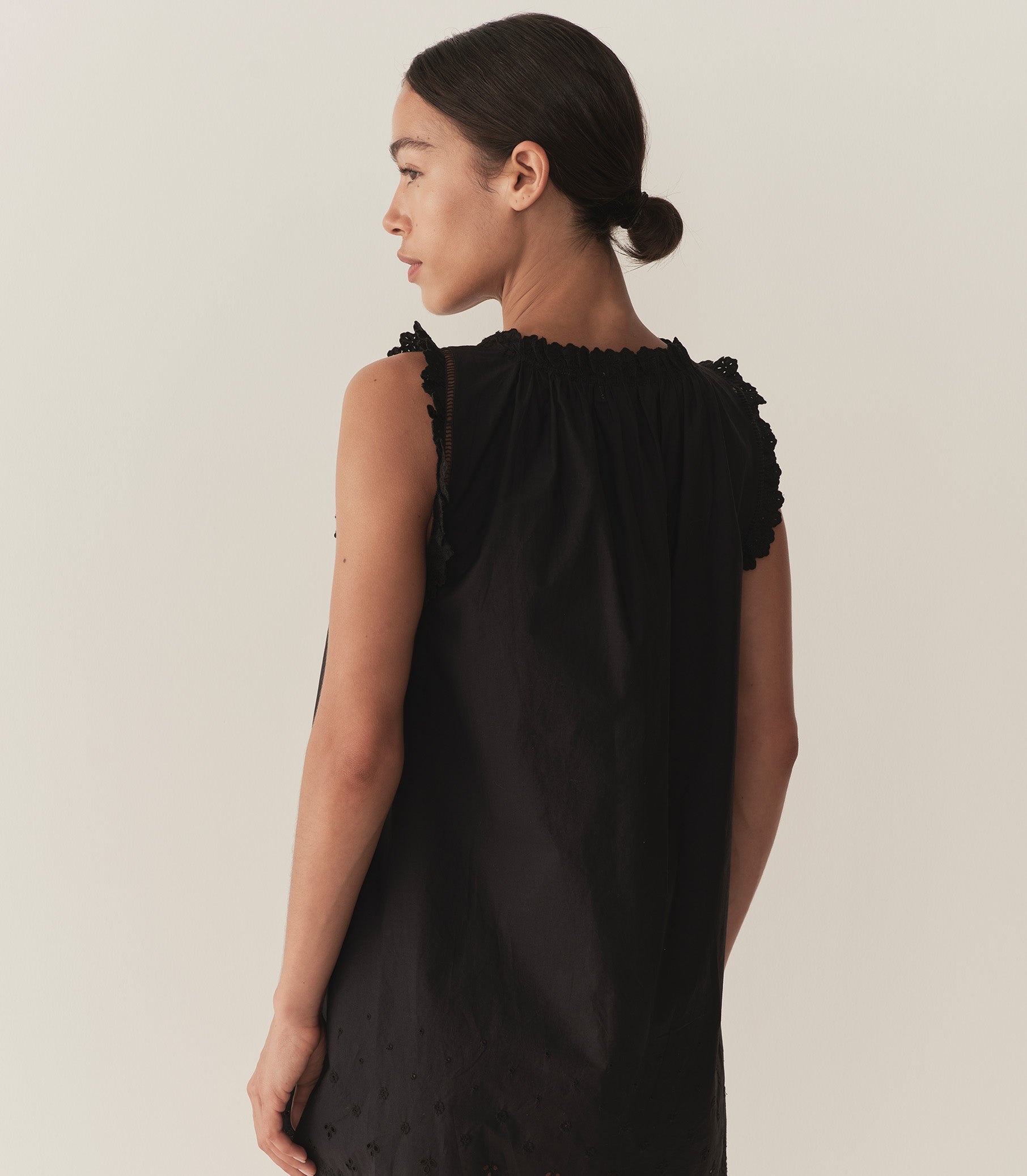 Crafted from crisp organic cotton poplin, the Nessie Dress—inspired by our best-selling Traveler Top—features a breezy silhouette with a scoop neckline, mother-of-pearl buttons, and a grosgrain ribbon tie. Scallop eyelet embroidery and ladder trim accent the neckline and sleeve openings, while a floral eyelet design accents the yoke and mini hemline.
