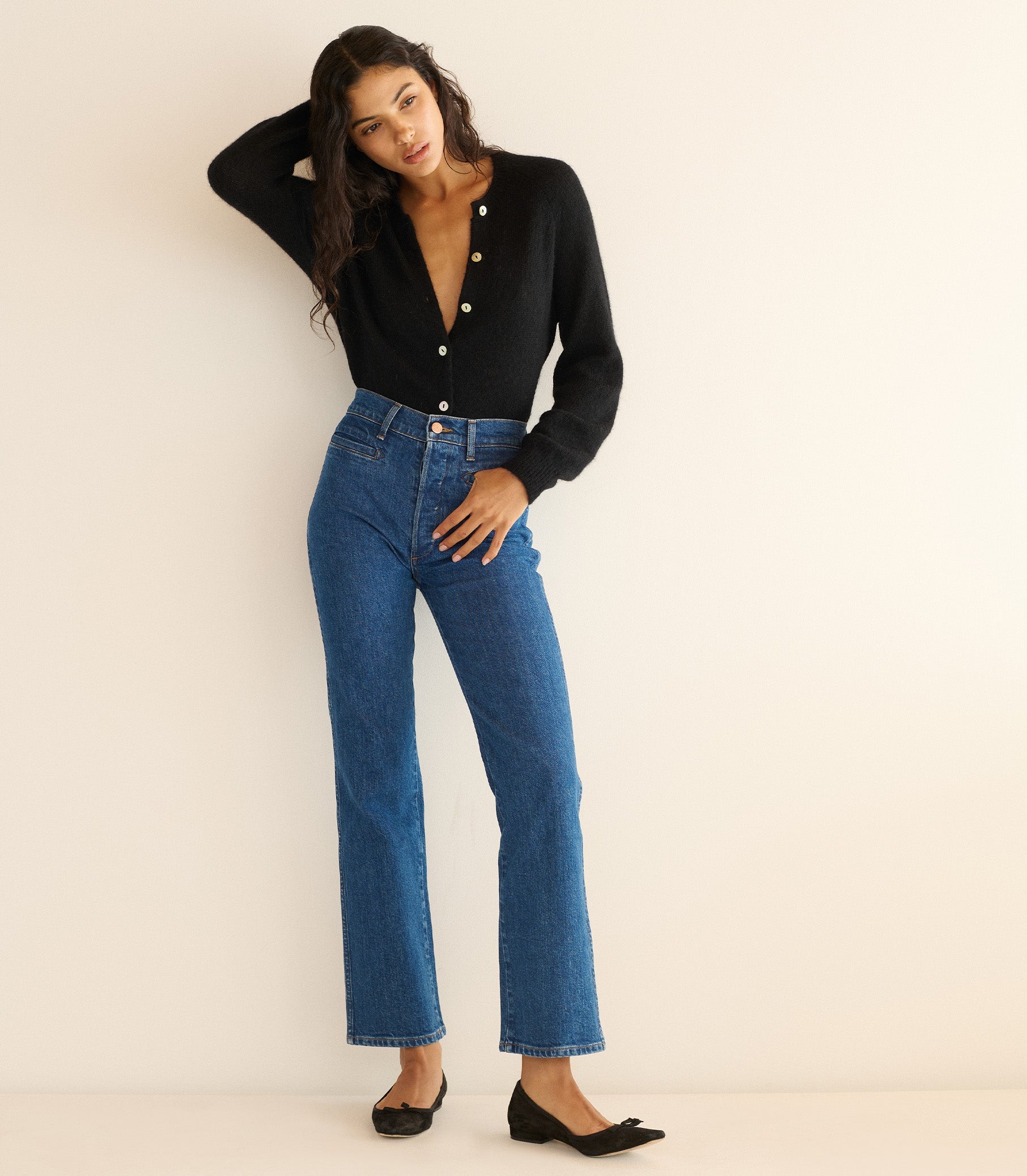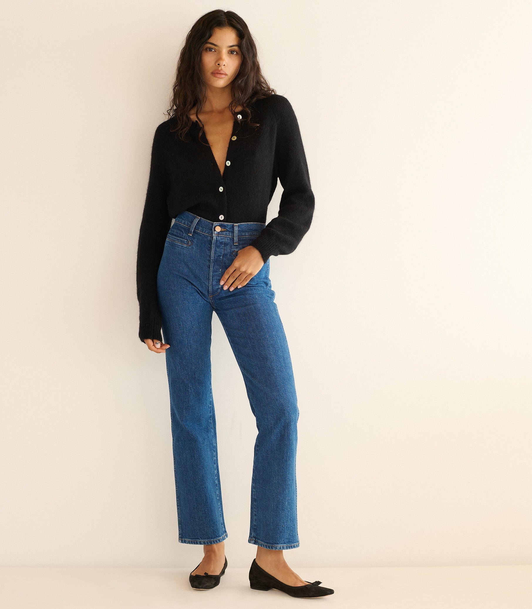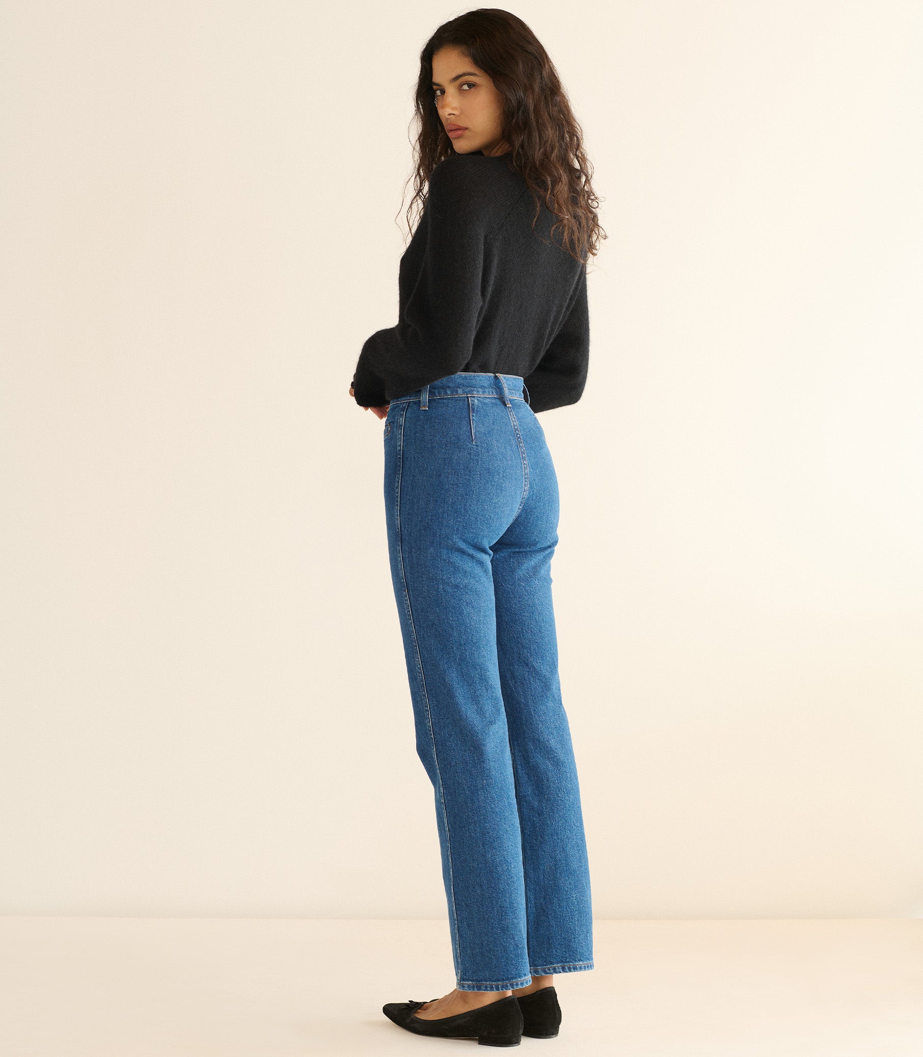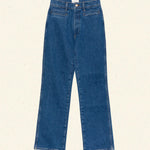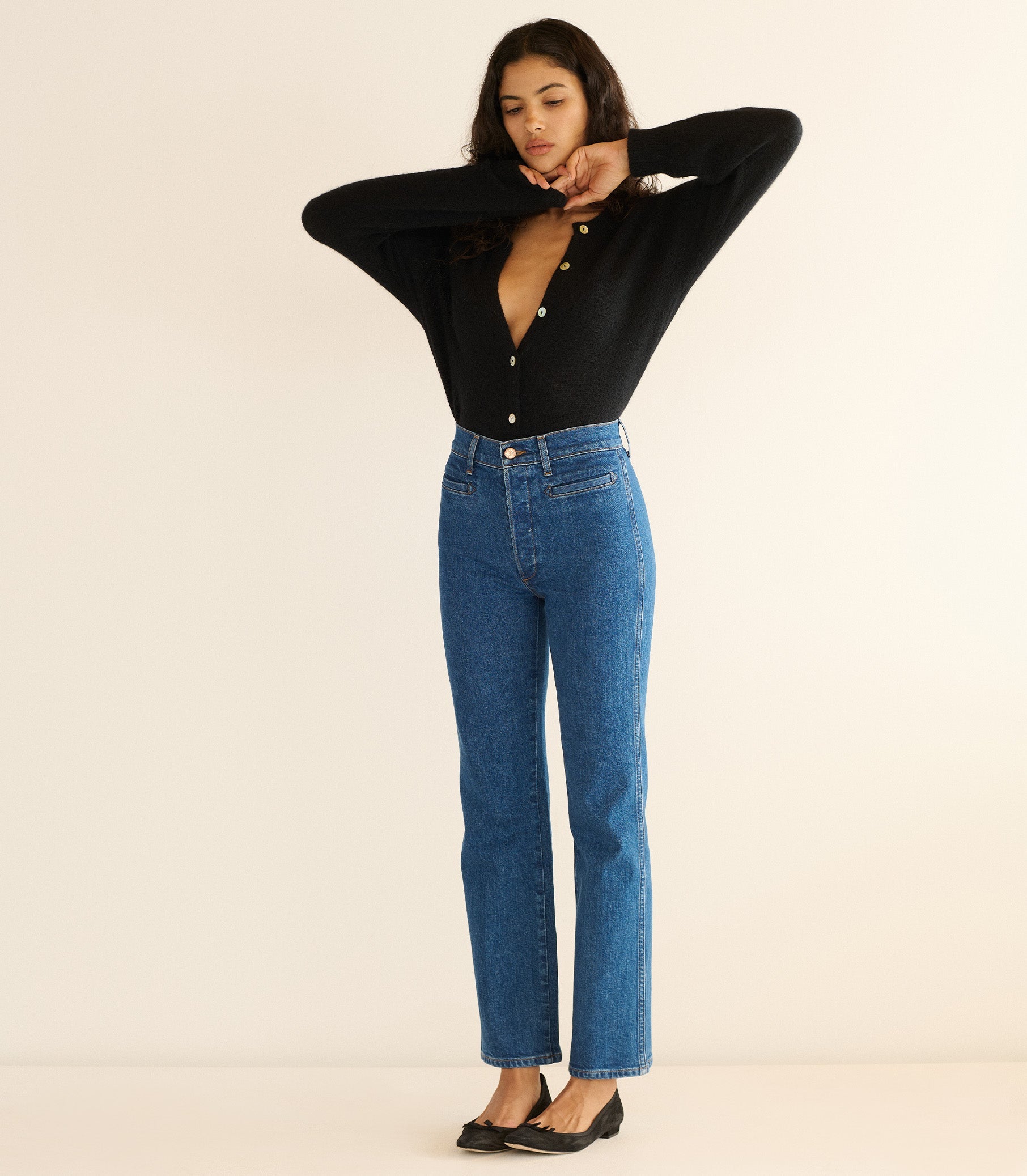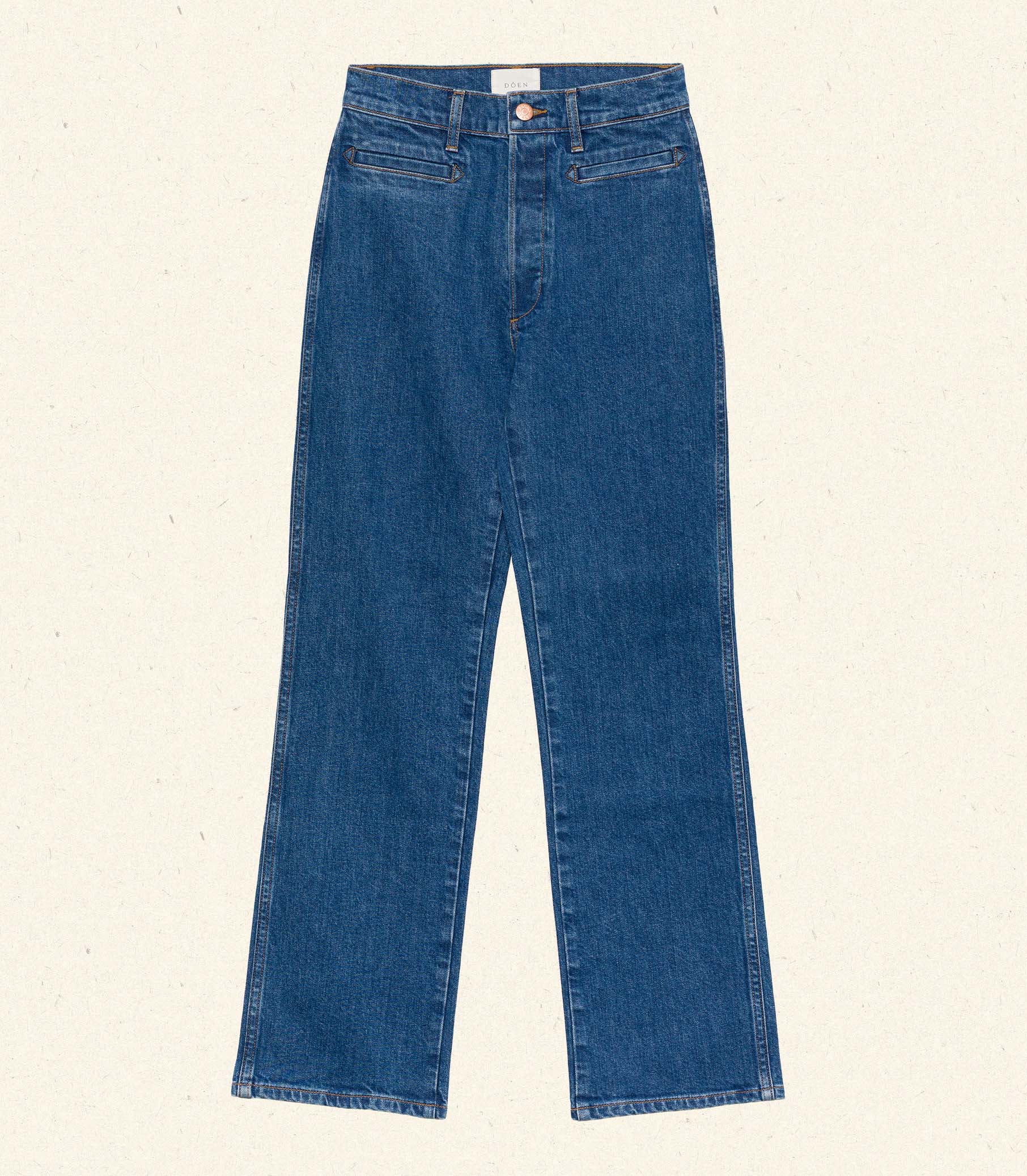 Inspired by ‘60s sailor styles, the Nikita Jean is cut from organic cotton denim with a hint of stretch and features a high waist, front welt pockets, and a clean button-front closure.