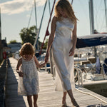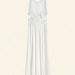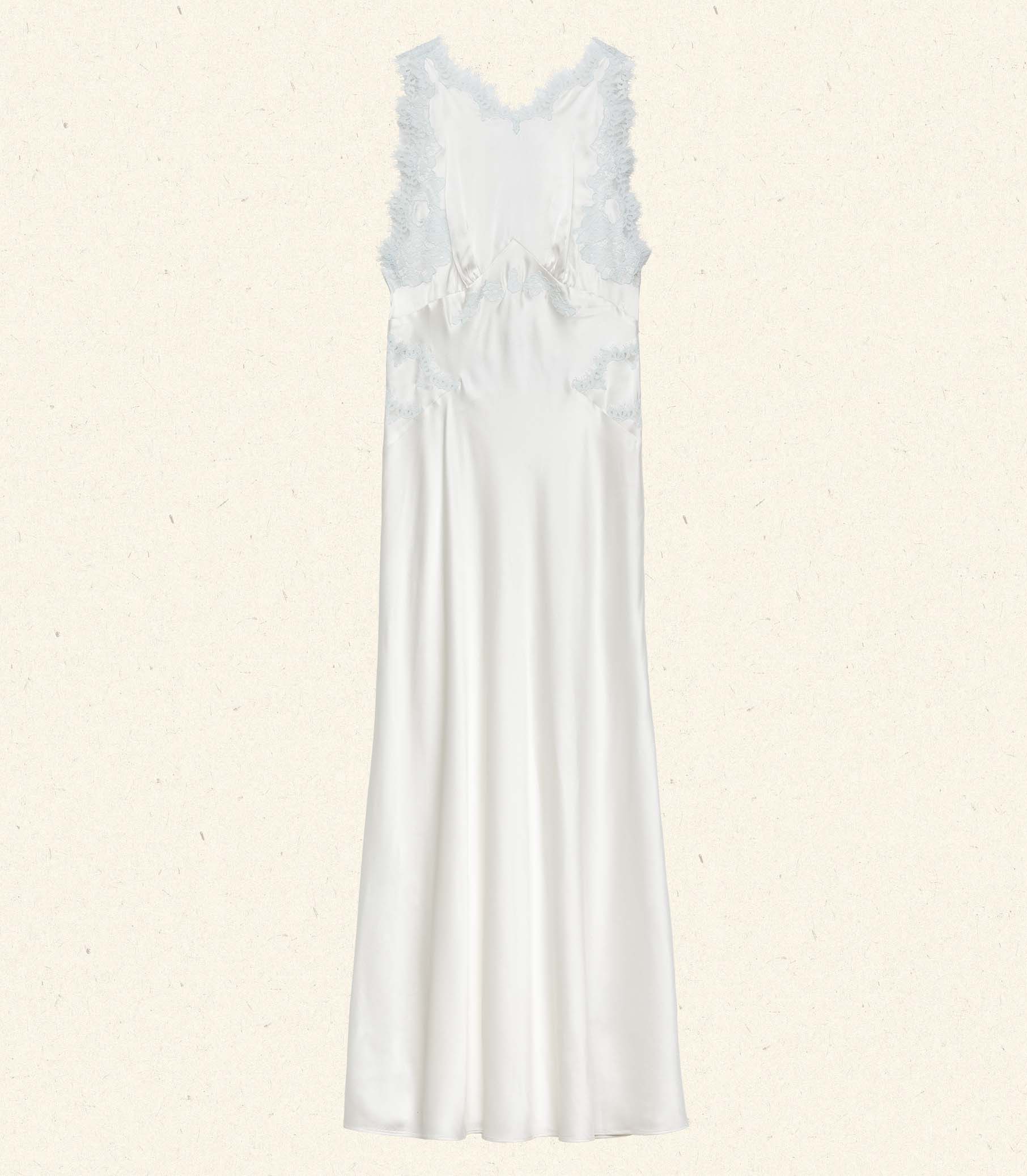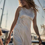 Rendered in buttery silk satin, the Odelina Dress takes cues from 1930s silhouettes. Intricate lace trims the high neckline and sleeve openings, while sheer lace insets at the waist and down the back offer a glimpse of skin. A fitted bodice with a side seam zipper flows into an ankle-grazing bias-cut skirt.