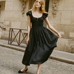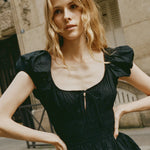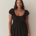 In crisp 100% organic cotton poplin, the Quinn Dress—a Favorite Character— features a scoop neckline with an adjustable tie and a playful keyhole detail, a gathered bust, and short puffed sleeves. A fitted bodice with elasticized smocking gives way to a midi-length A-line skirt.