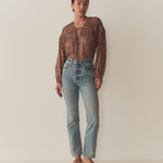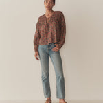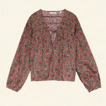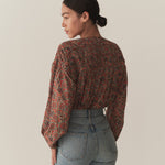 A nod to one of our earliest styles—the Marche Dress from our first collection—the Renelle Top is crafted from soft, lightweight organic cotton voile adorned with our Soleil Fleurit print, a motif inspired by an antique French block-printed quilt sourced by our co-founder Katherine. It features a high V-neckline with a functional tie, fixed smocking at the yoke, and voluminous drop sleeves finished with elasticized cuffs.