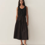 Crafted from 100% organic cotton poplin, our best-selling Traveler Top features a slightly cropped silhouette, mother-of-pearl buttons, and a scoop neckline with a grosgrain ribbon tie. Scallop eyelet detailing and ladder trim adorn the neckline, sleeve openings, and hemline, while a floral eyelet design extends down the front. For an antique-inspired finishing touch, an embroidered “D” at the bottom left hem nods to Victorian-era monograms.