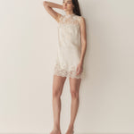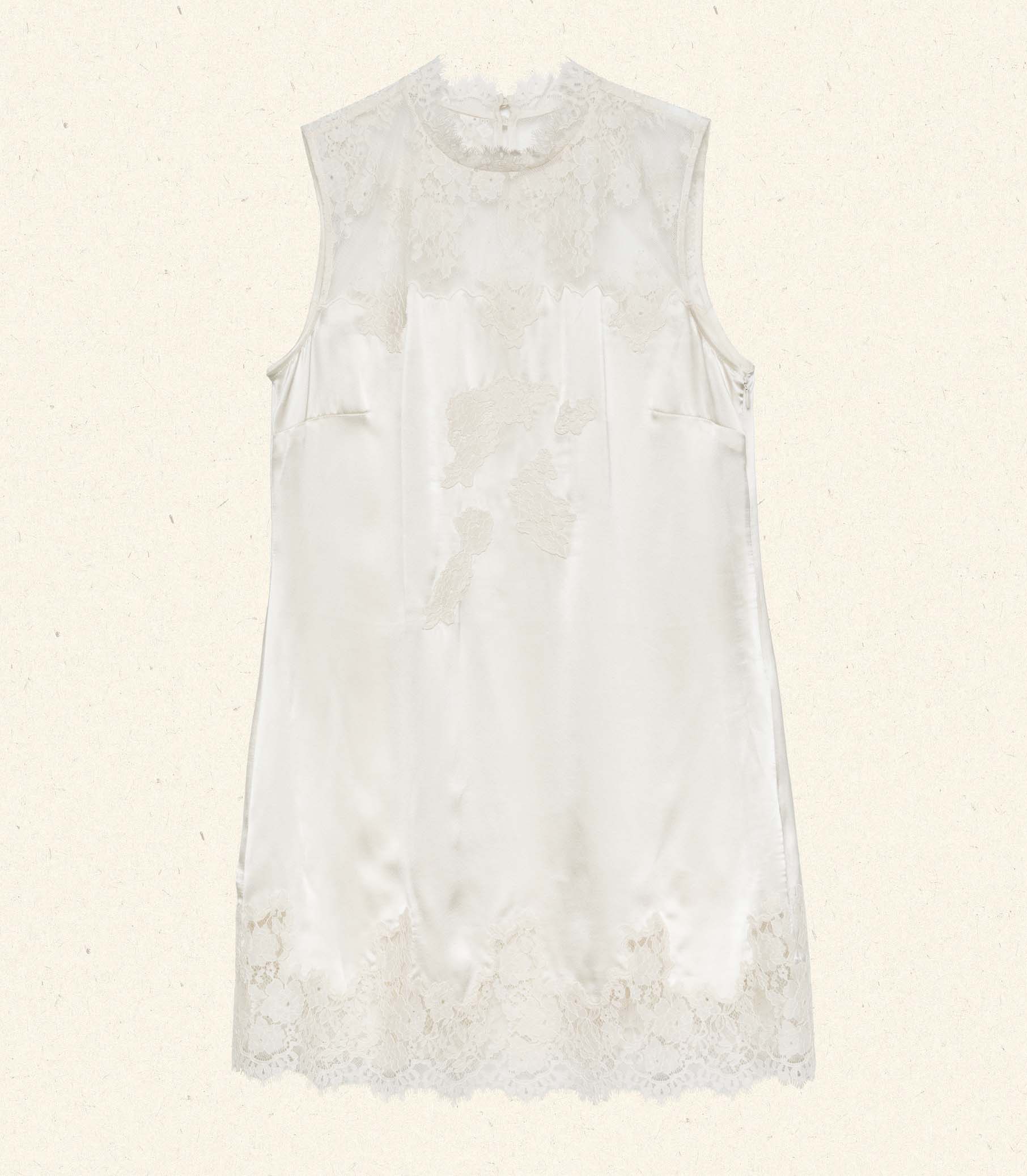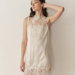 In a buttery silk satin, the Valeria Dress is a ‘90s-inspired sleeveless shift dress. It features a straight cut, a high neck, and a playful mini-length hemline. Intricate floral lace adorns the neckline, bodice and hem. Four self-covered buttons fasten at the back of the neck.