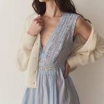 Drawing inspiration from nightgowns of the 1930s, the Victoria Dress is crafted from a lightweight ramie, featuring a plunging wide V-neckline with a hidden hook-and-eye closure, a surplice back bodice, and an ankle-grazing full skirt. Alternating inset lace and pintuck panels at the bodice, plus shirred scallop lace at the arm openings and along the surplice of the back bodice, lend vintage charm. An invisible side zipper with a hook-and-eye closure creates the perfect fit.