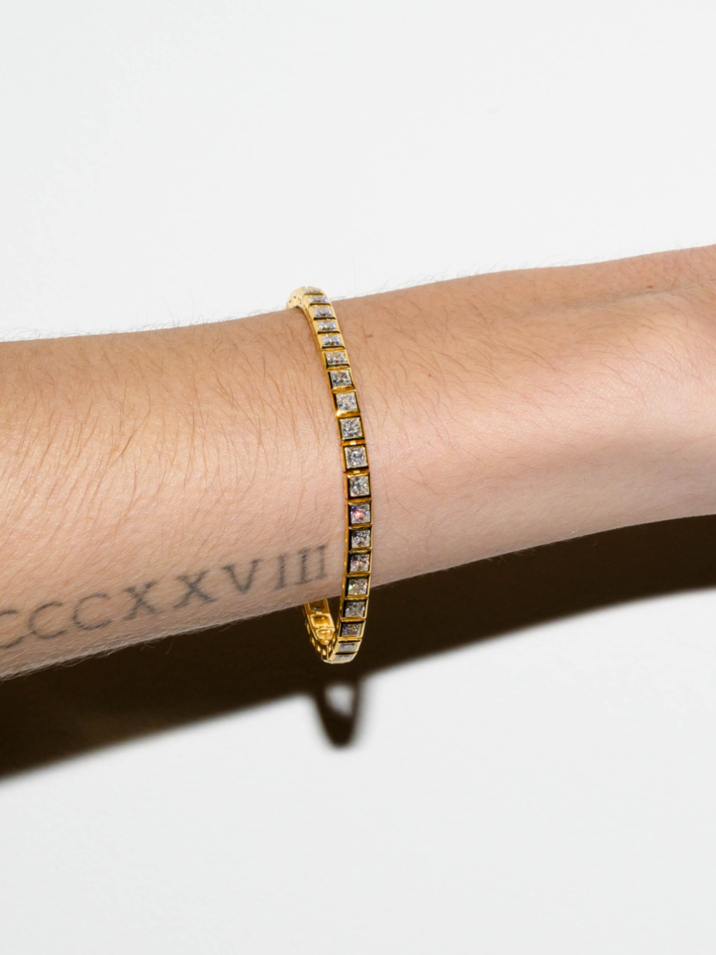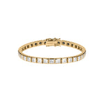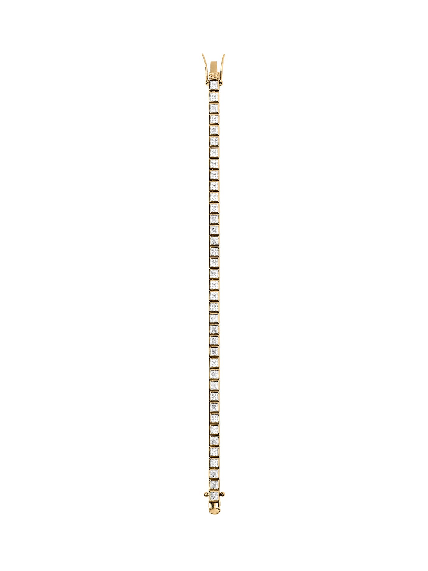 Individually set princess-cut lab-grown white moissanite define the Axelle Bezel Rivière Bracelet, each stone encased in a refined 18k gold vermeil bezel. Created for effortless daily wear, it’s finished with a box clasp and double safety hooks for a seamless and secure fit.