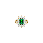 2.80 carats of pear-shaped lab-grown white sapphires or diamonds surround an 1.75 carat lab-grown emerald on the Benson Ring.
